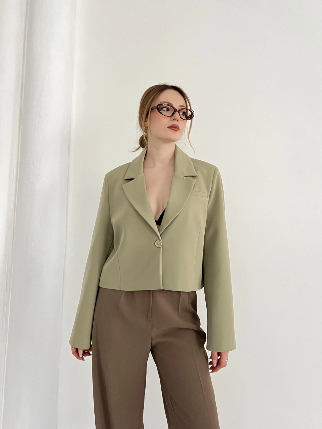 Kruvaze Yaka Tek Düğme Detay Crop Ceket Haki