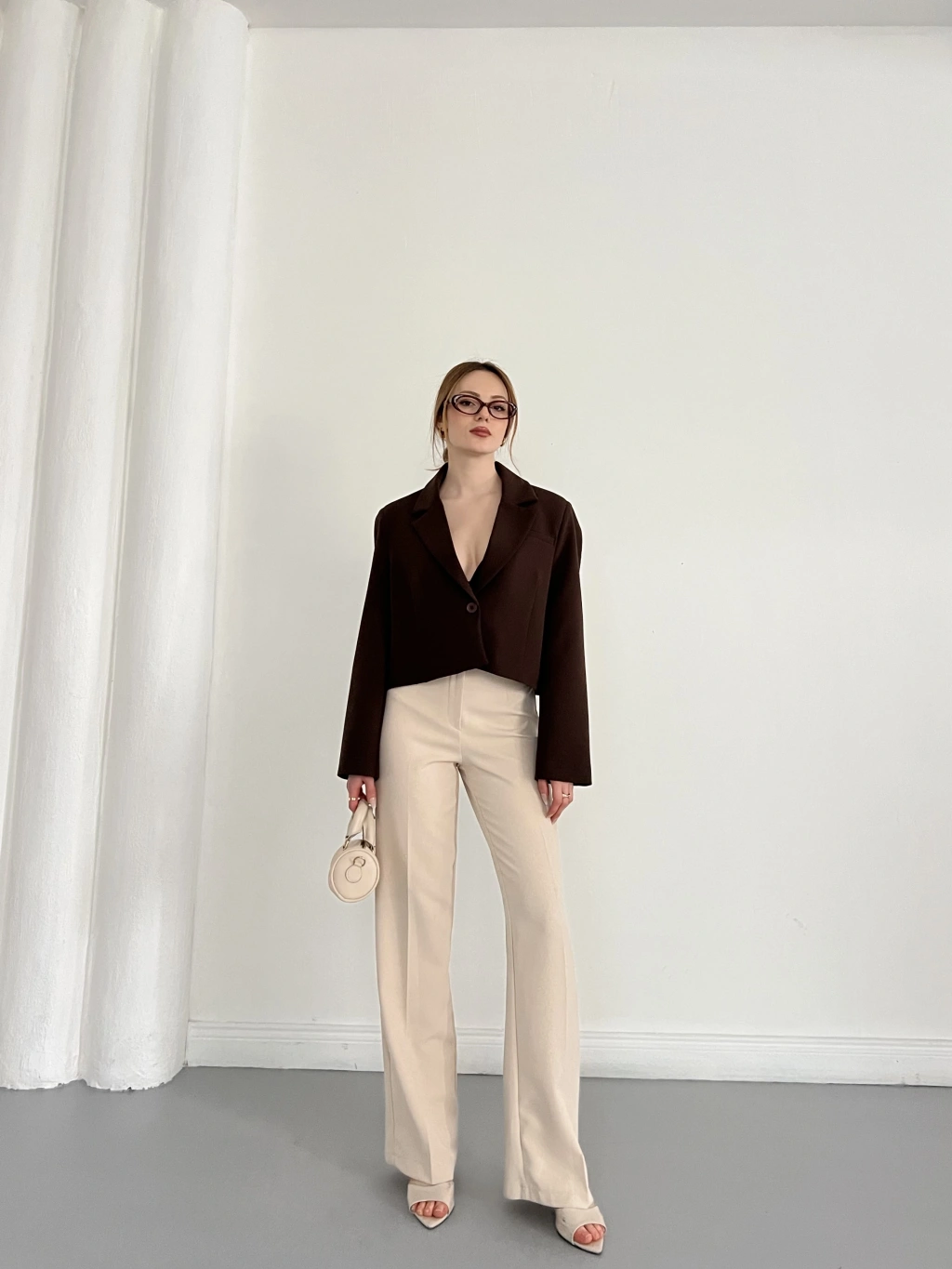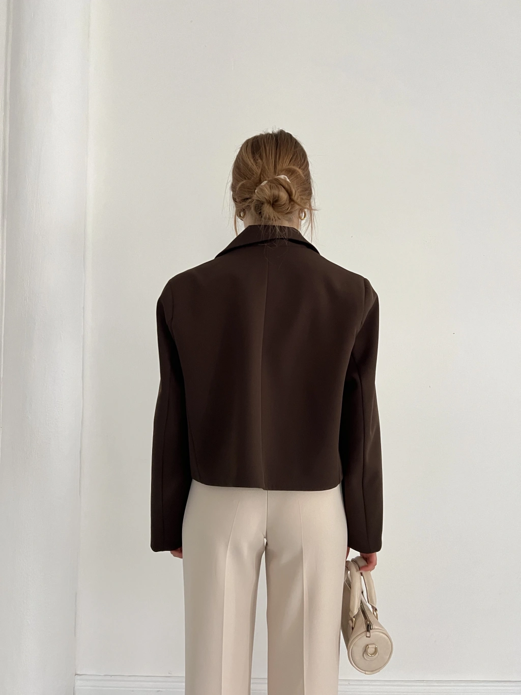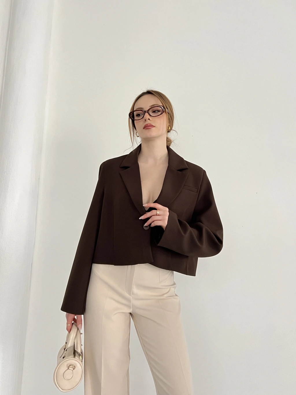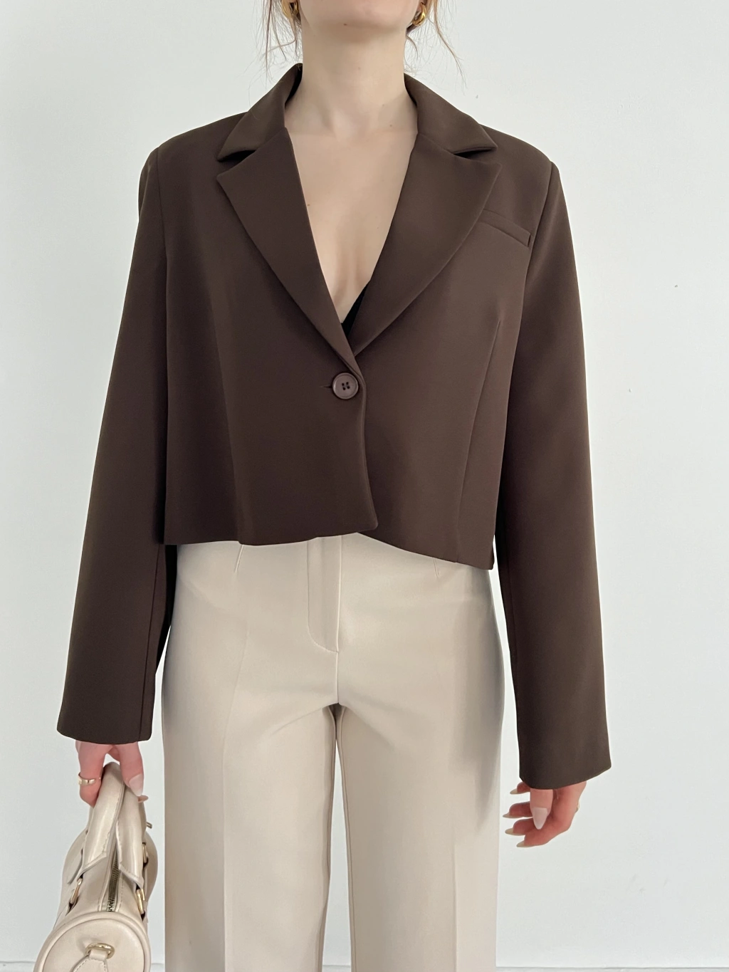 Kruvaze Yaka Tek Düğme Detay Crop Ceket Kahve