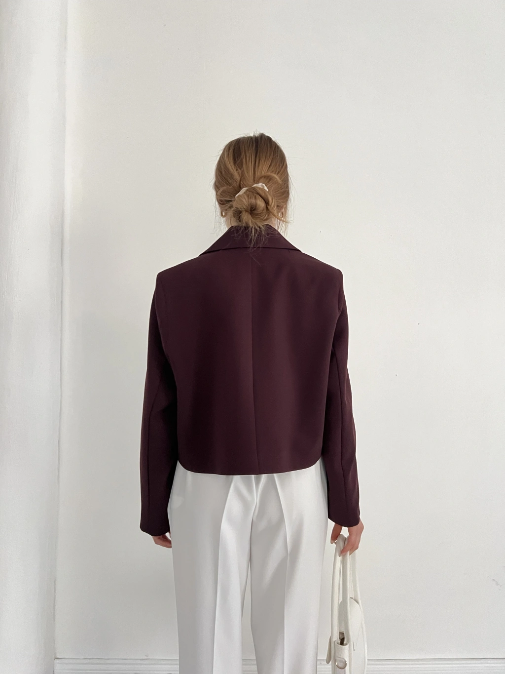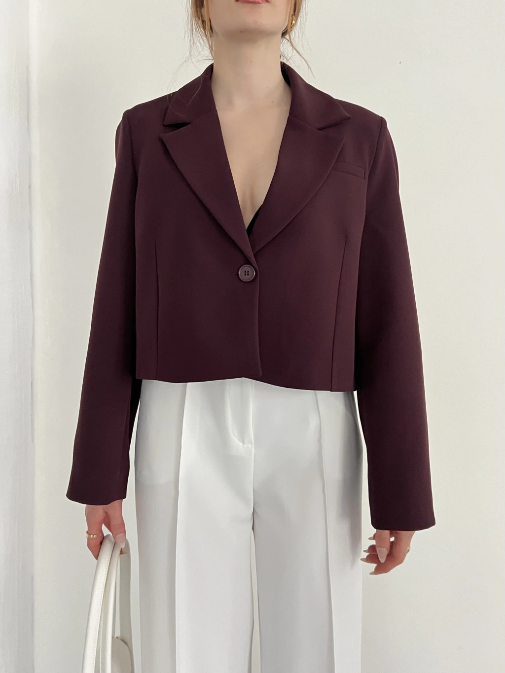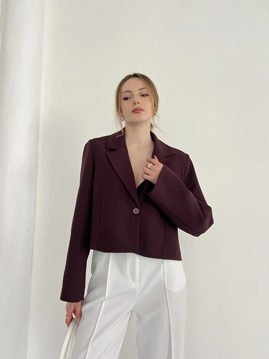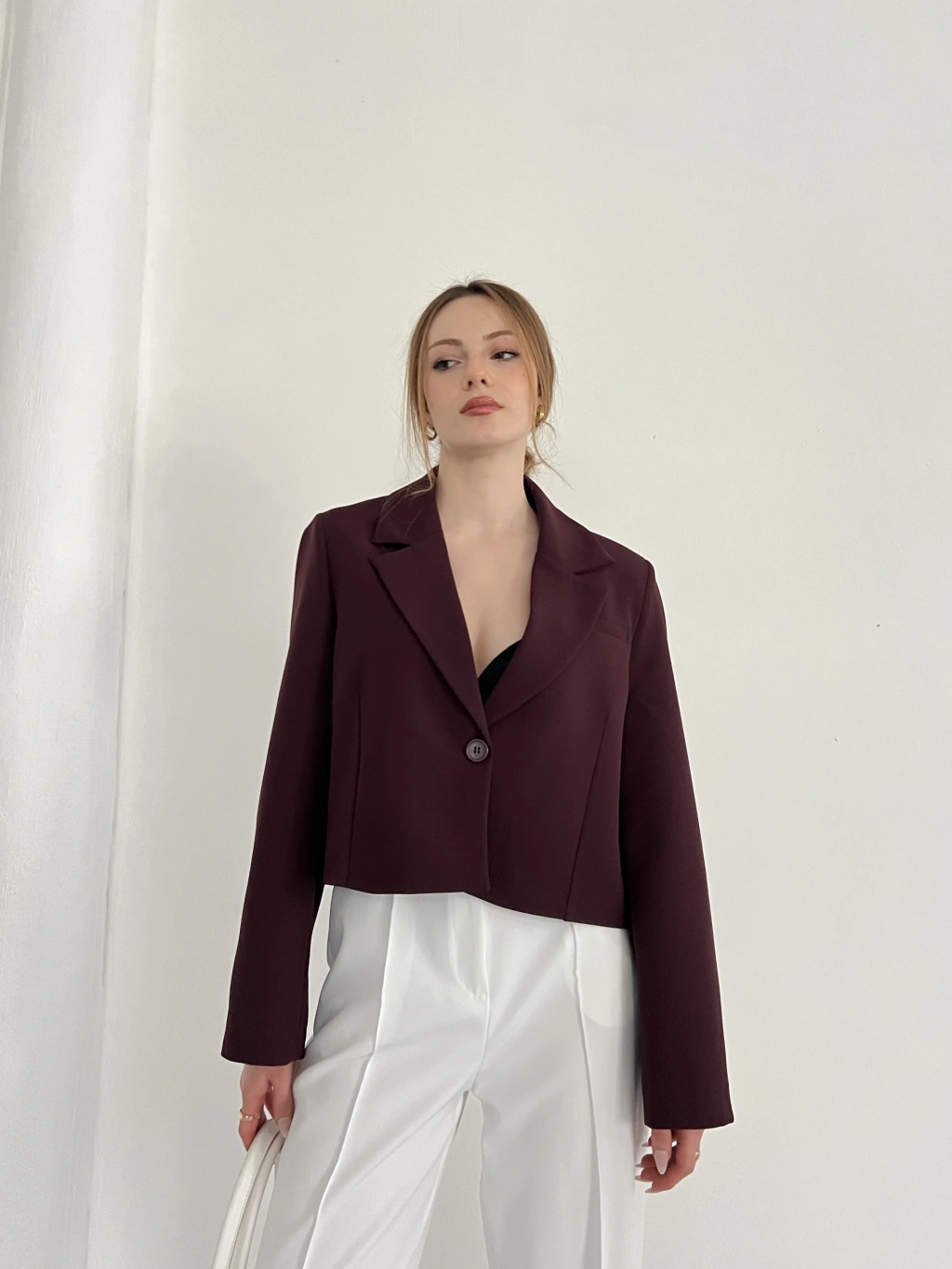 Kruvaze Yaka Tek Düğme Detay Crop Ceket Mürdüm