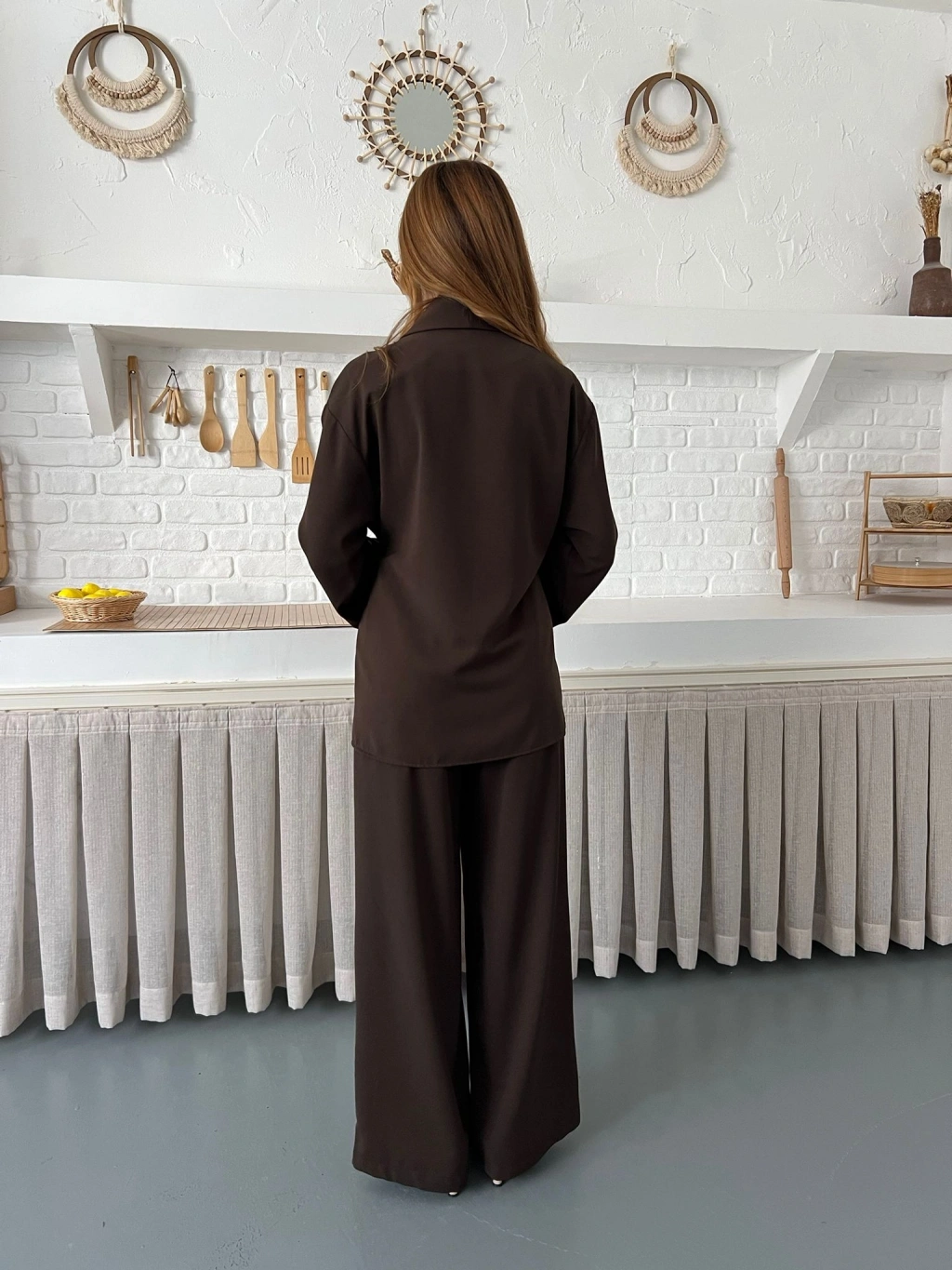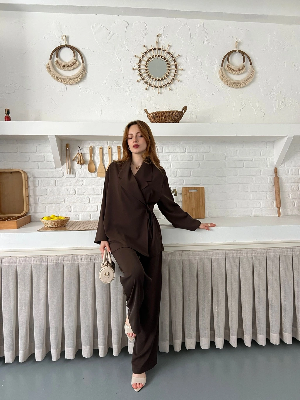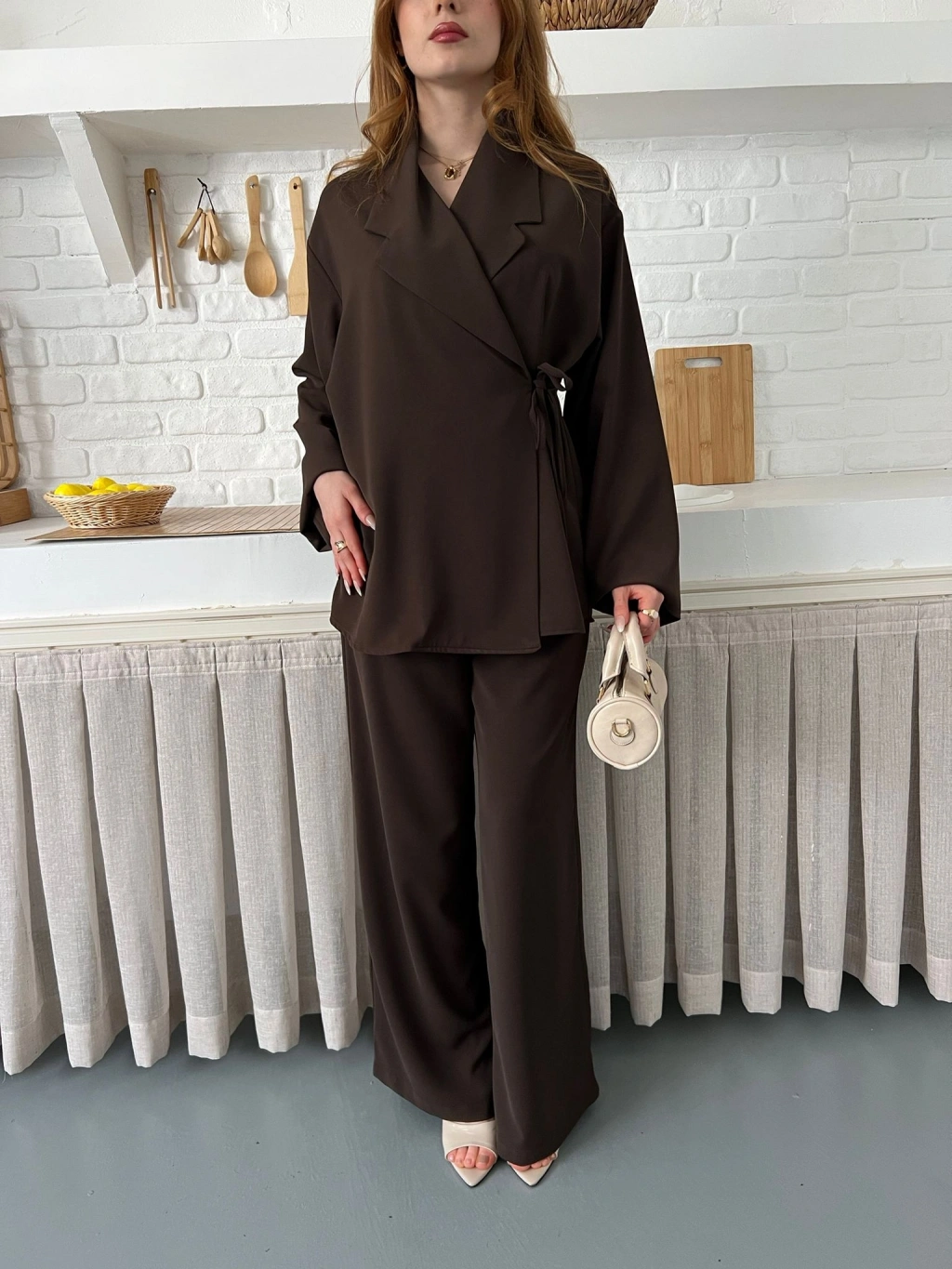 Kruvaze Yaka Yan Bağlamalı Feminen Takım Acı Kahve