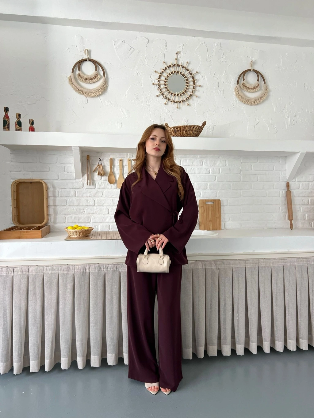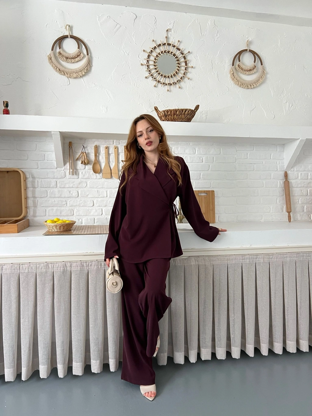 Kruvaze Yaka Yan Bağlamalı Feminen Takım Bordo
