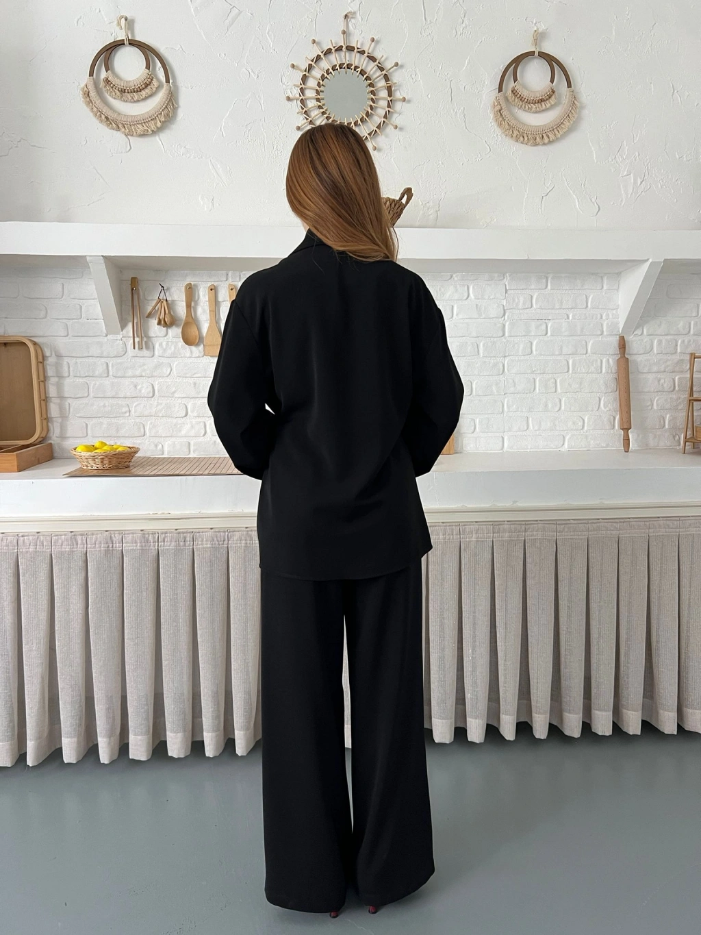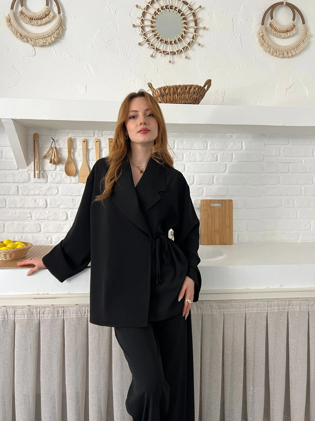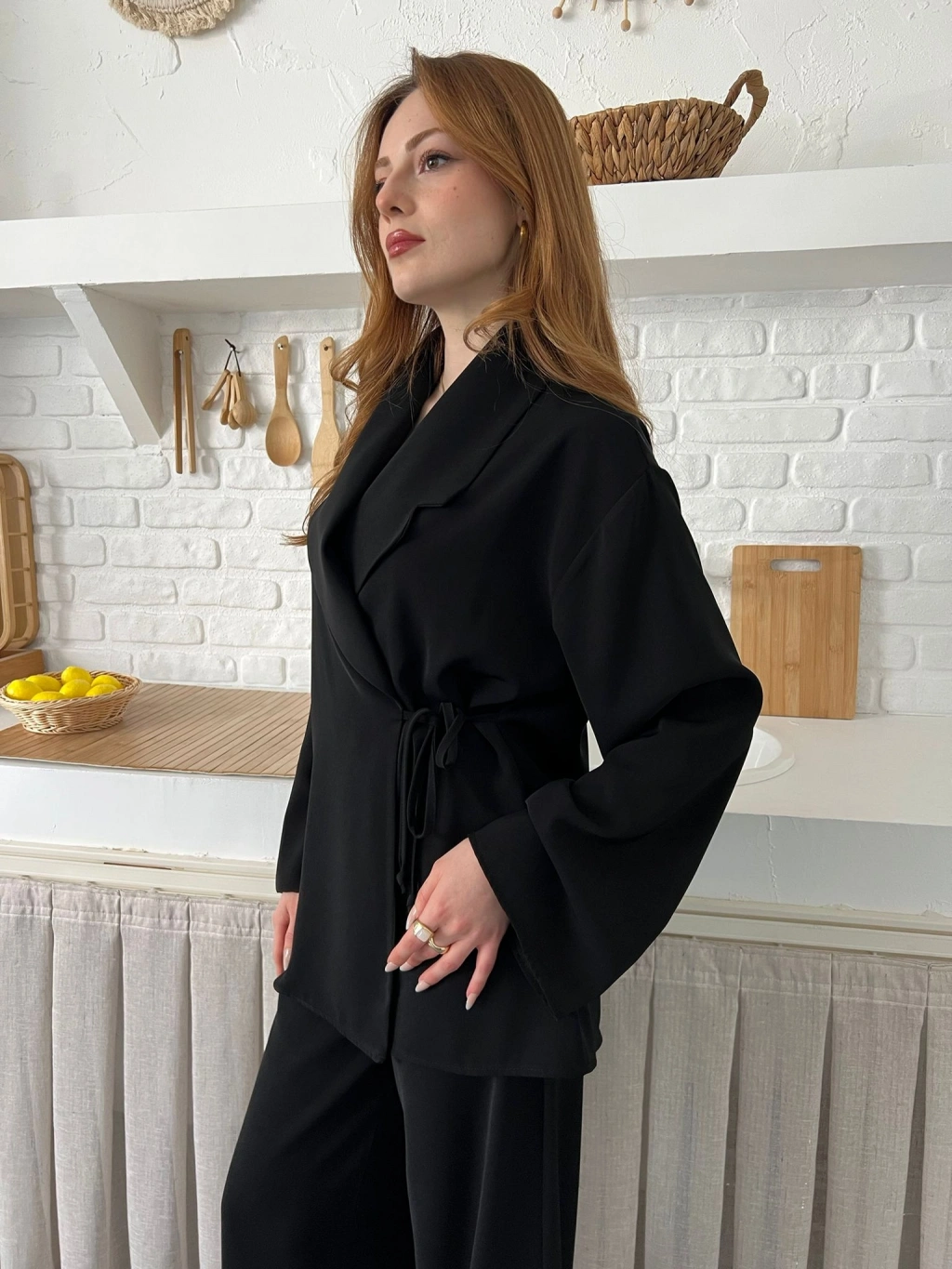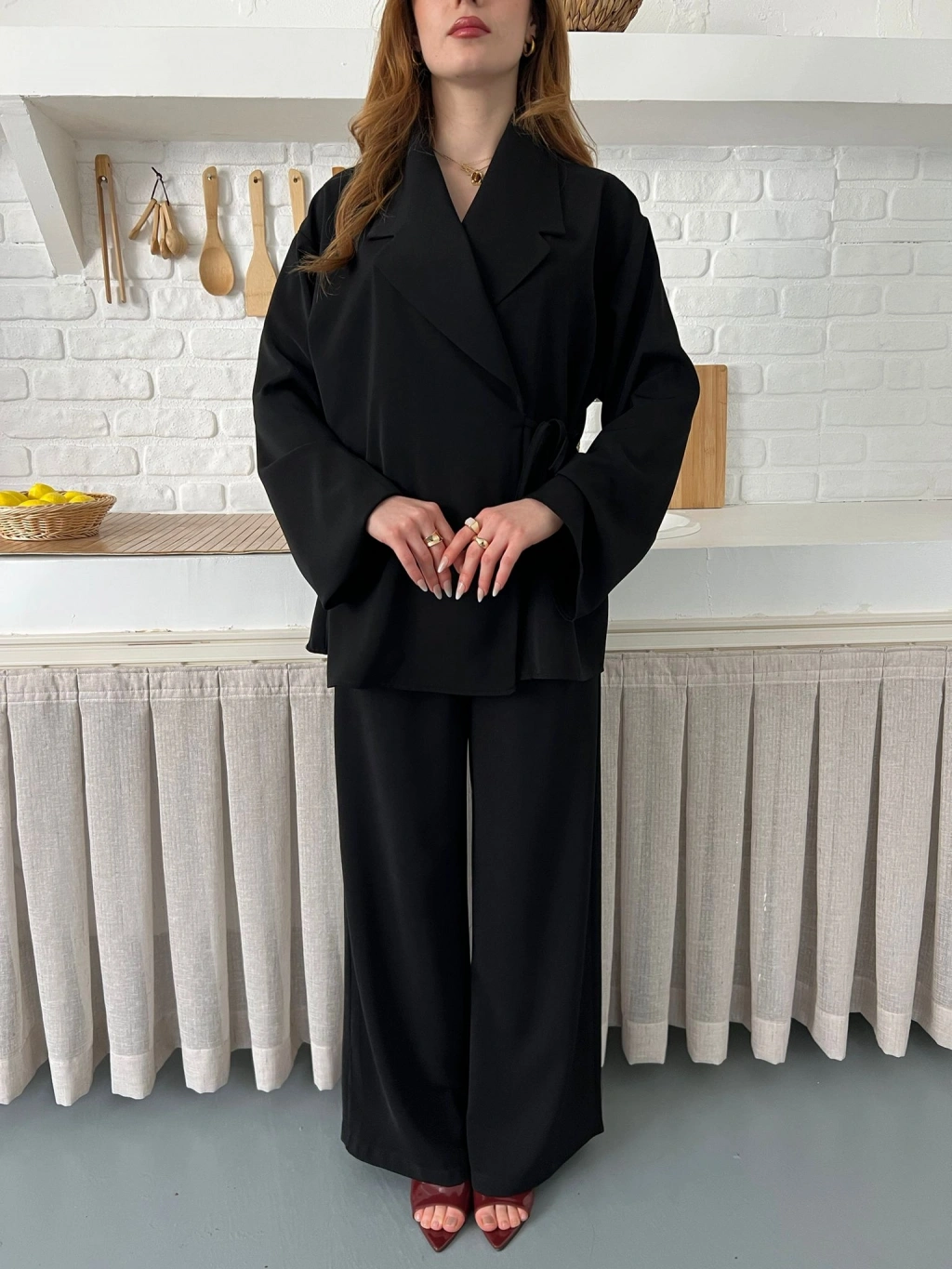 Kruvaze Yaka Yan Bağlamalı Feminen Takım Siyah