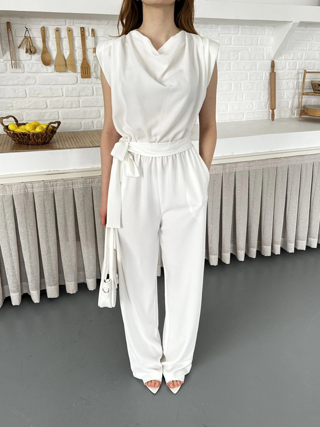 Kuşaklı Yaka Detaylı Zarif Tulum Beyaz