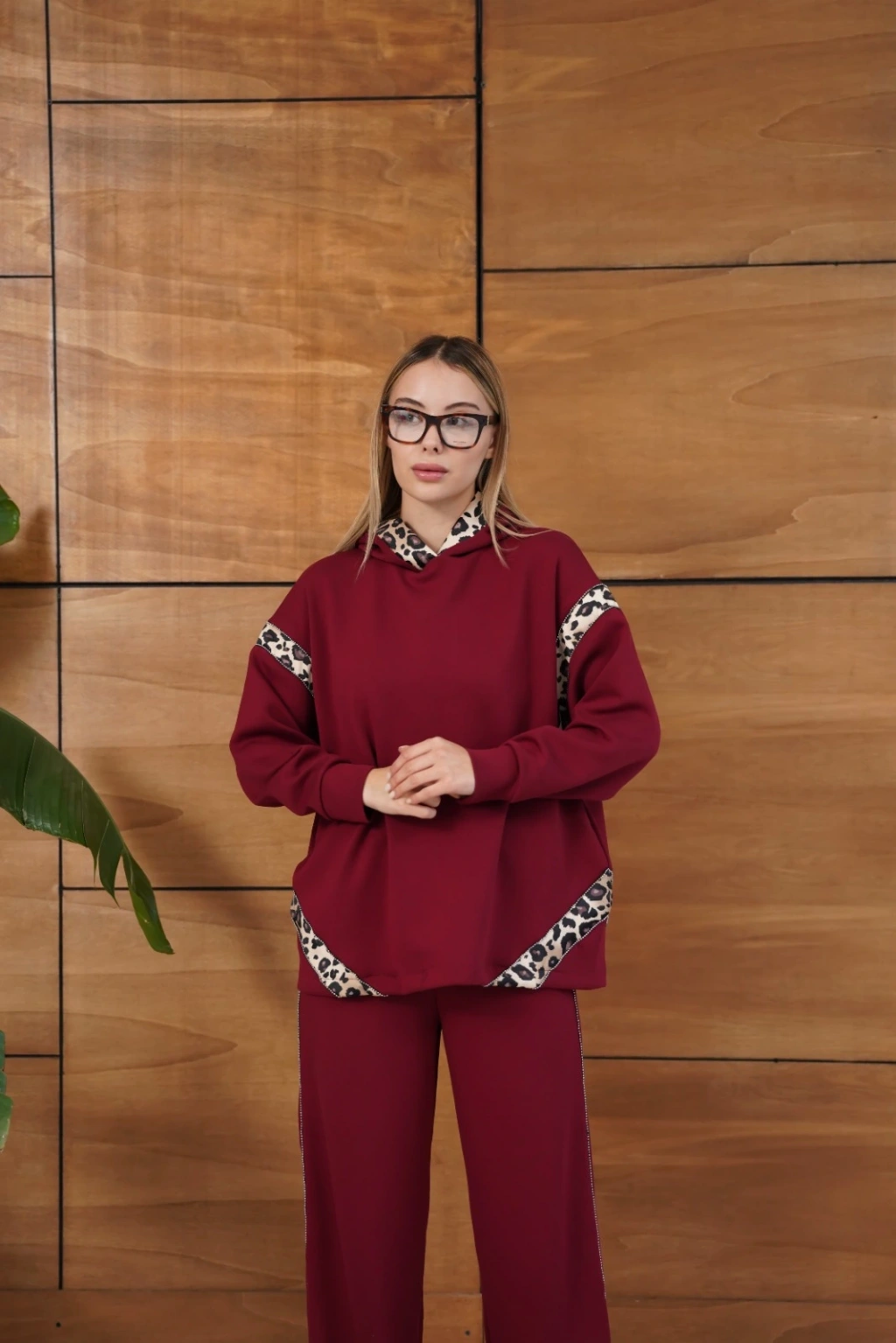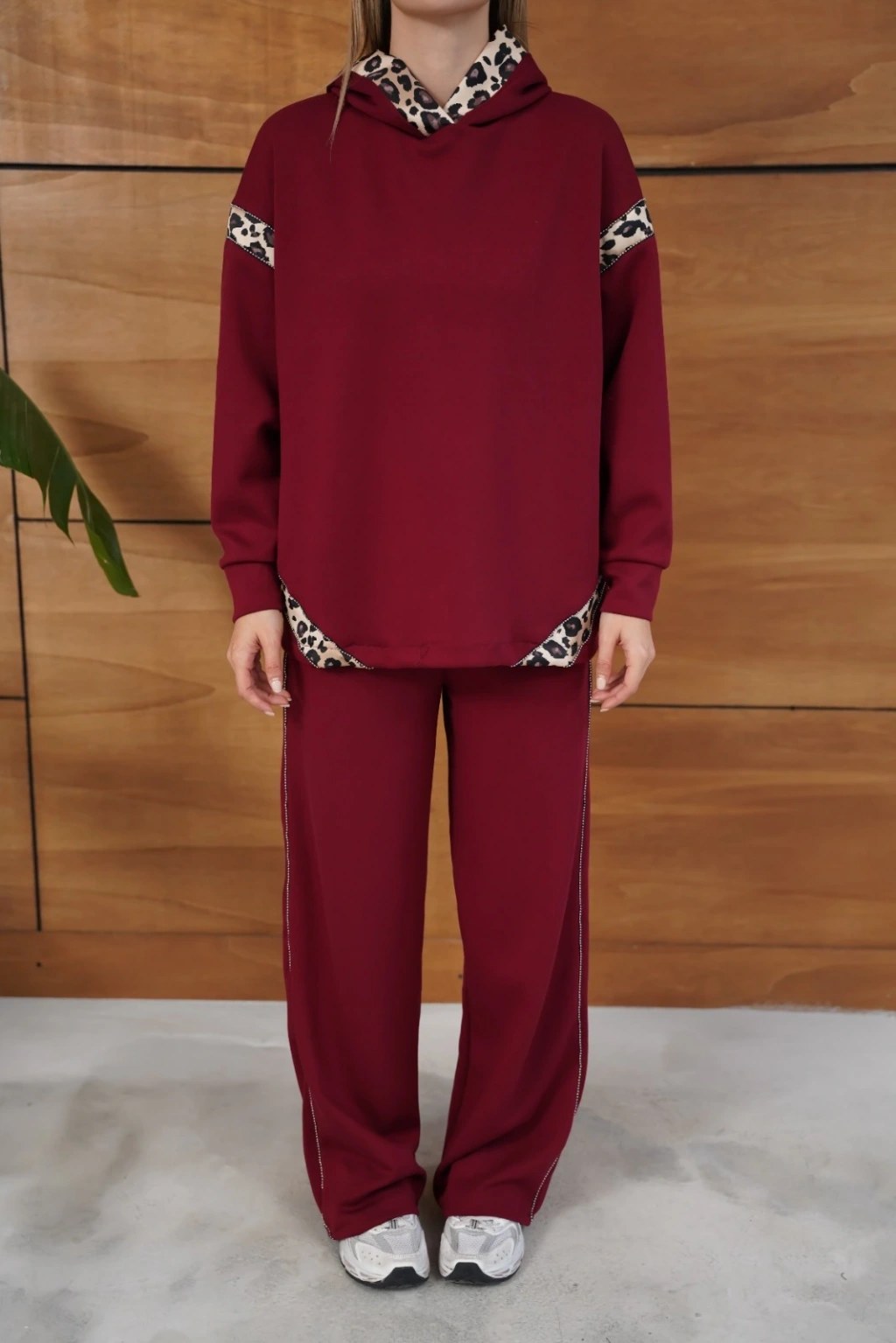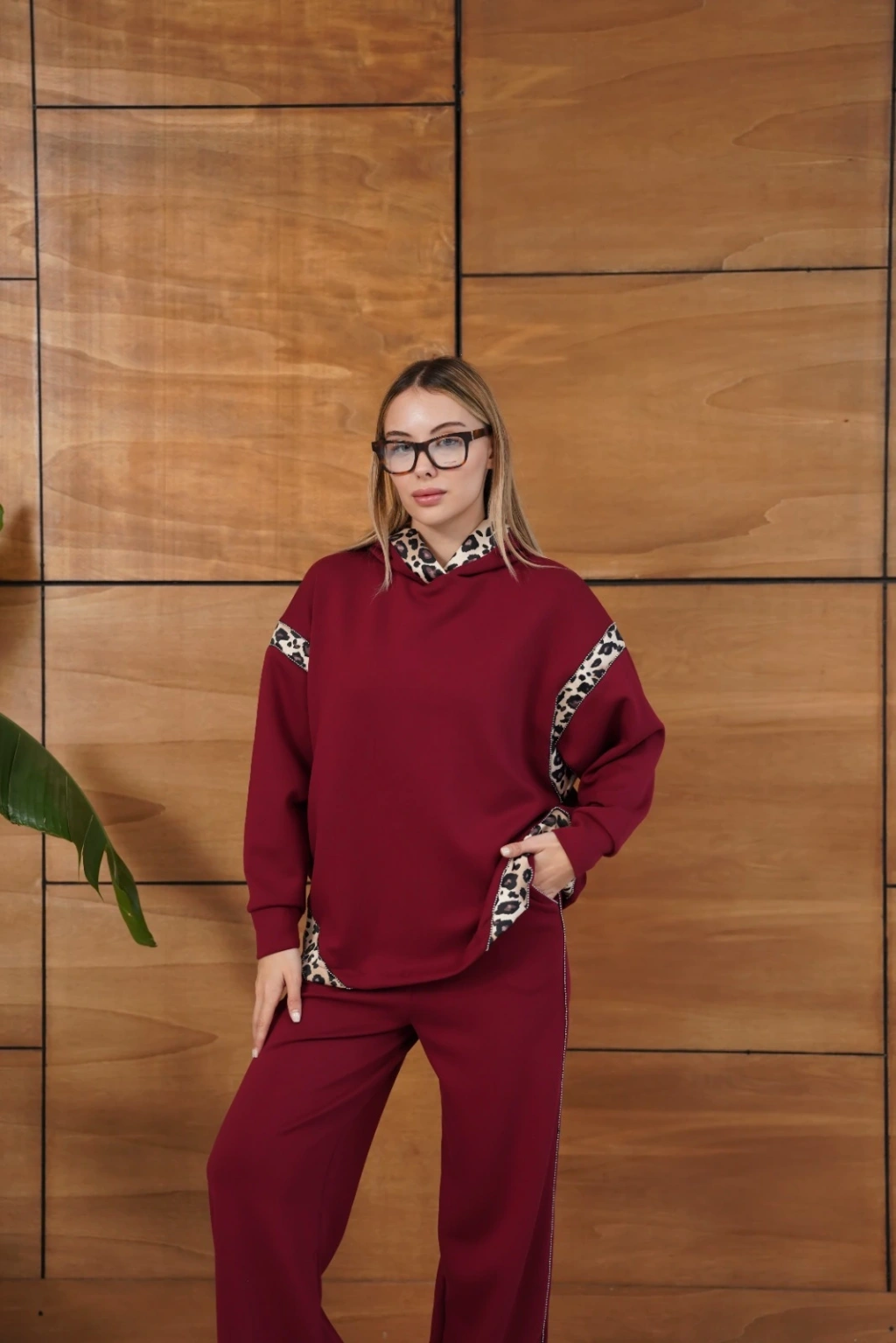 Leopar Desen Kapüşonlu Modal Takım Bordo