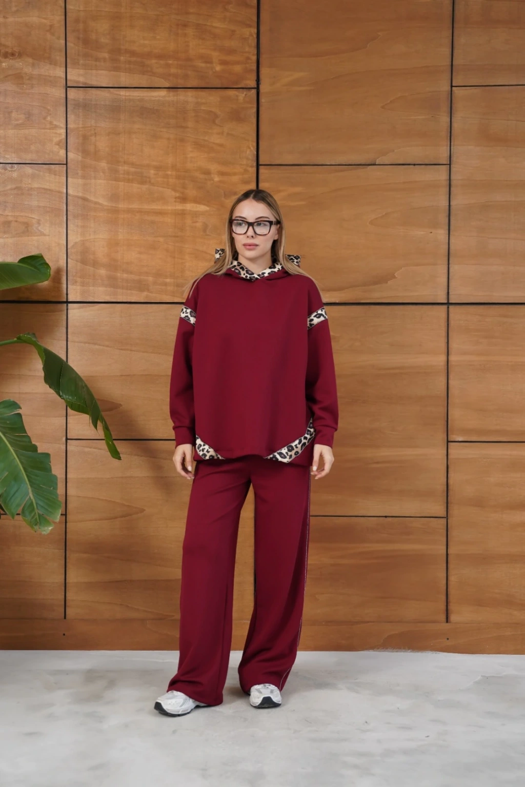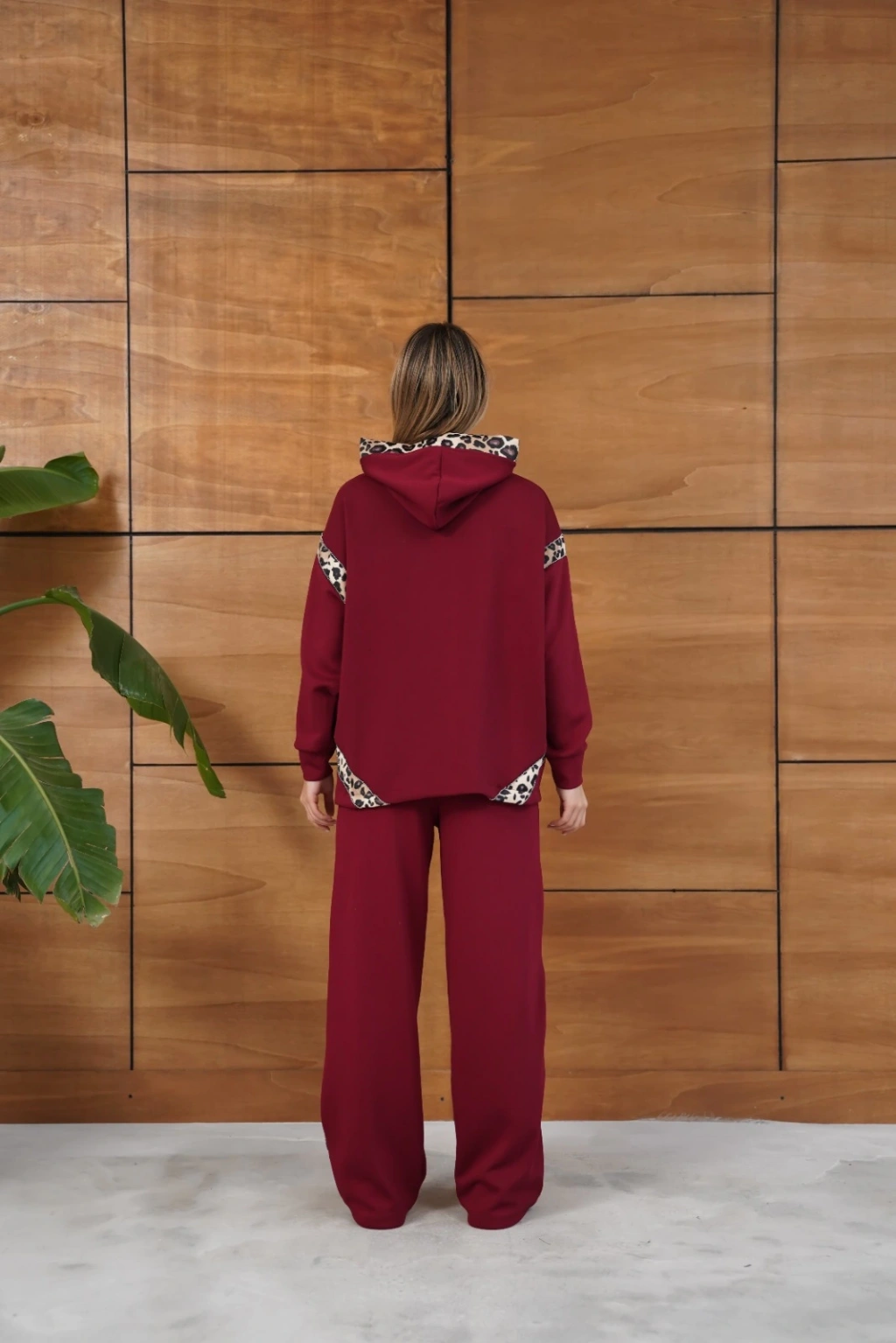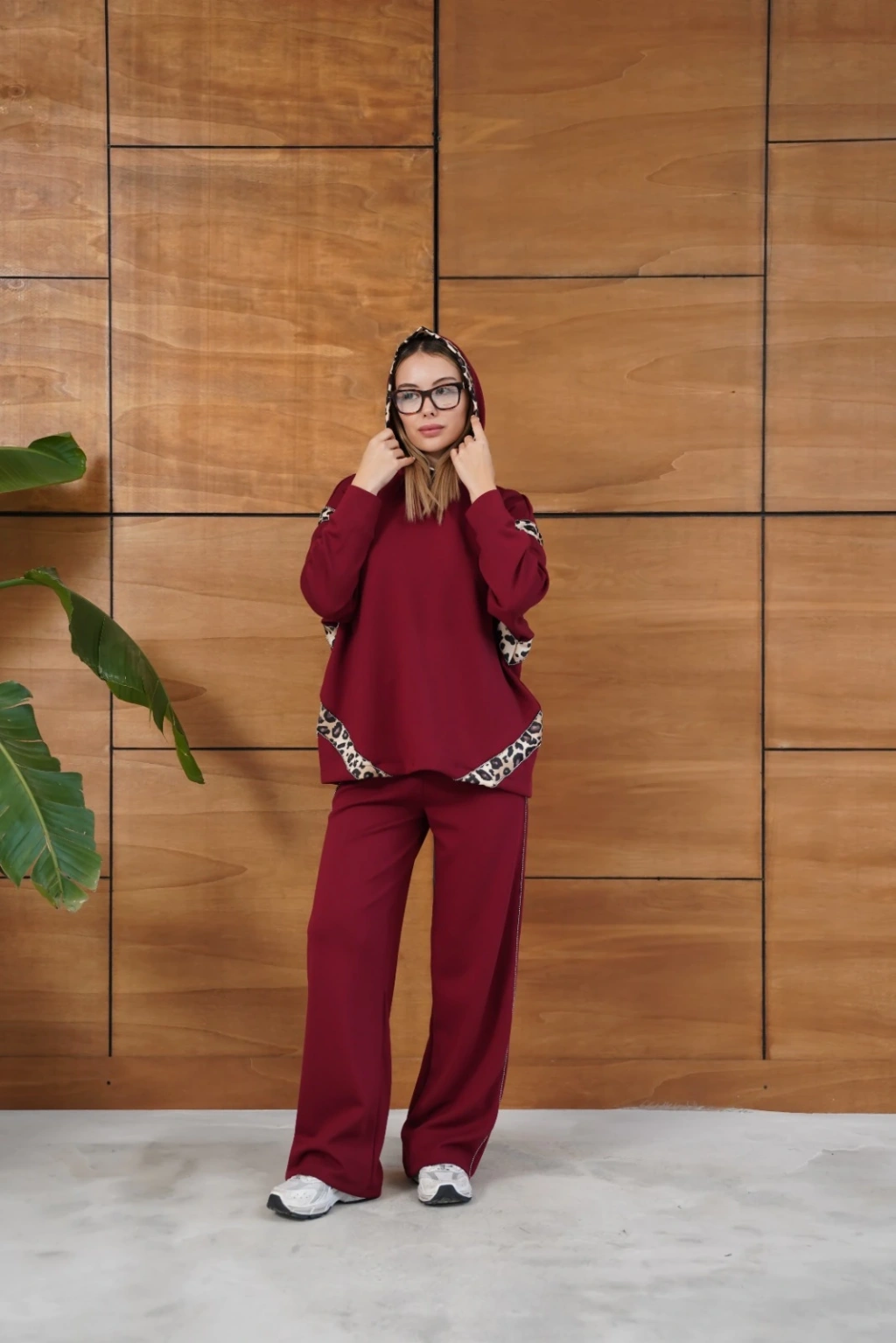 Leopar Desen Kapüşonlu Modal Takım Bordo