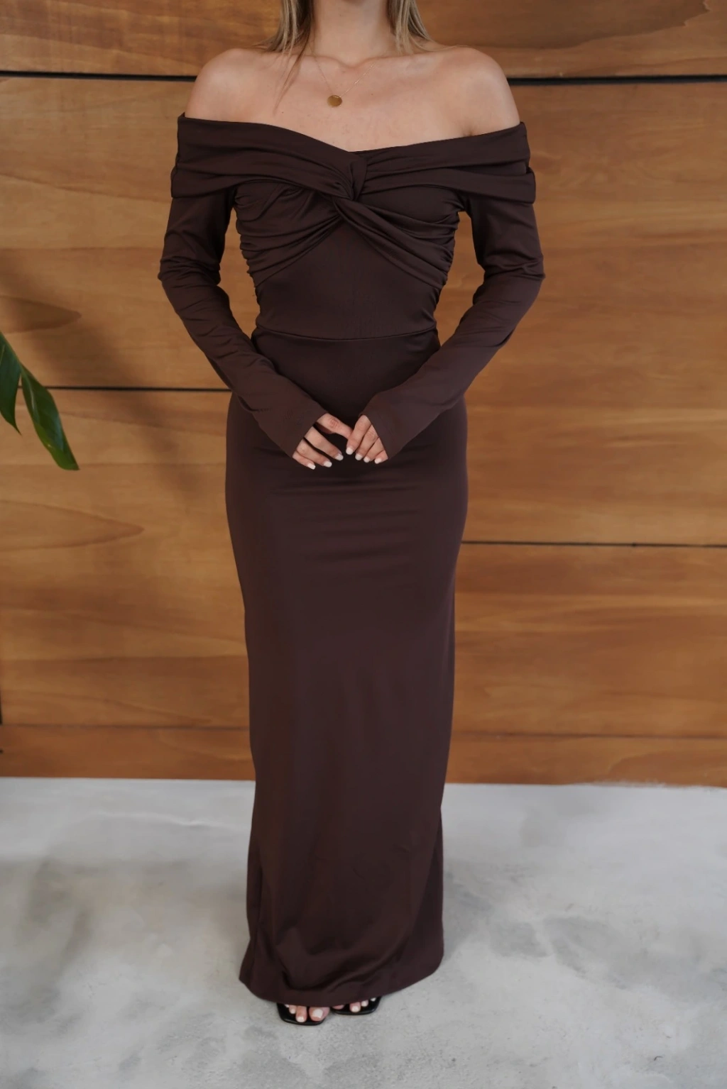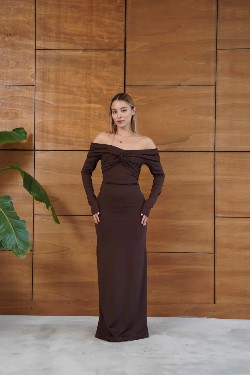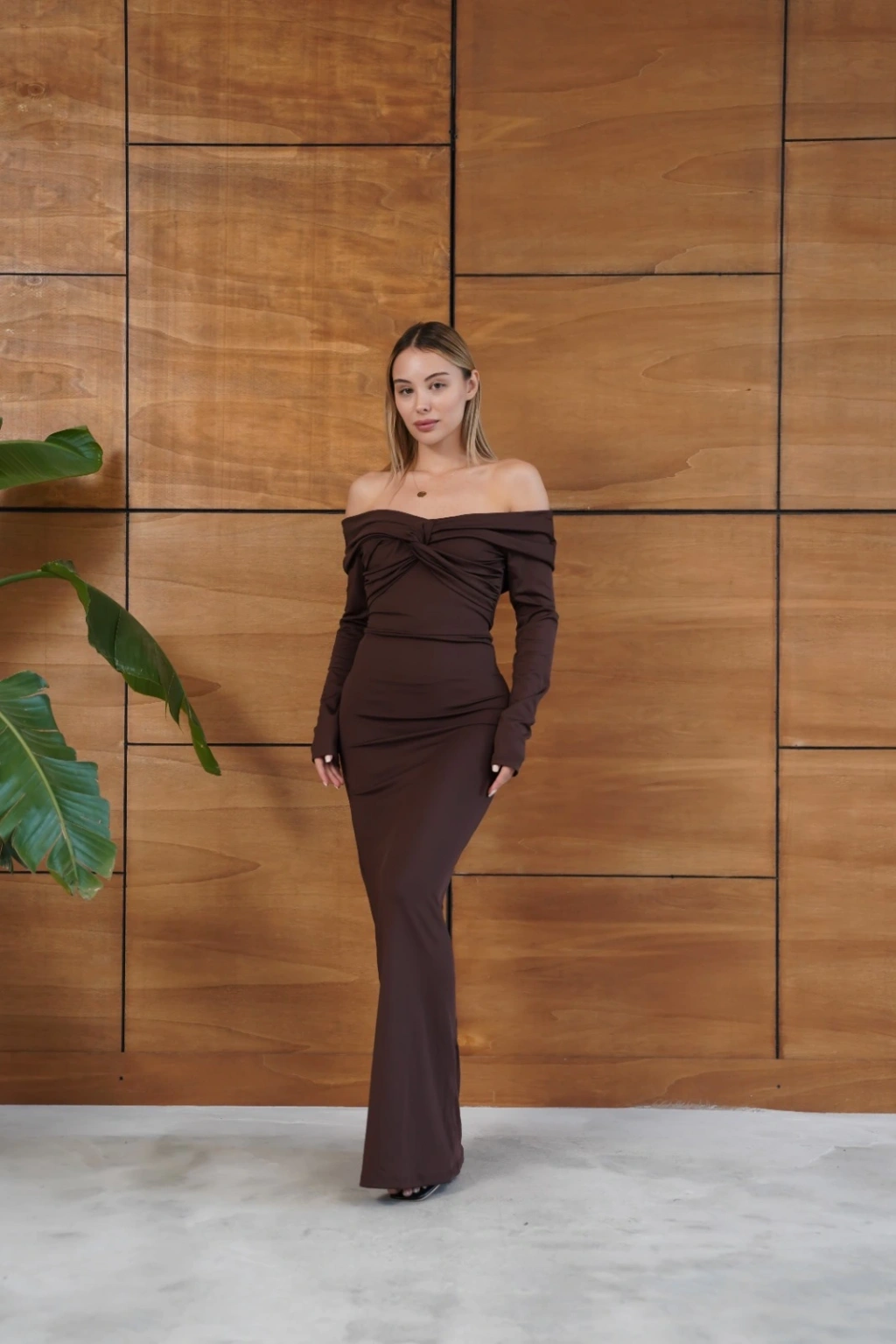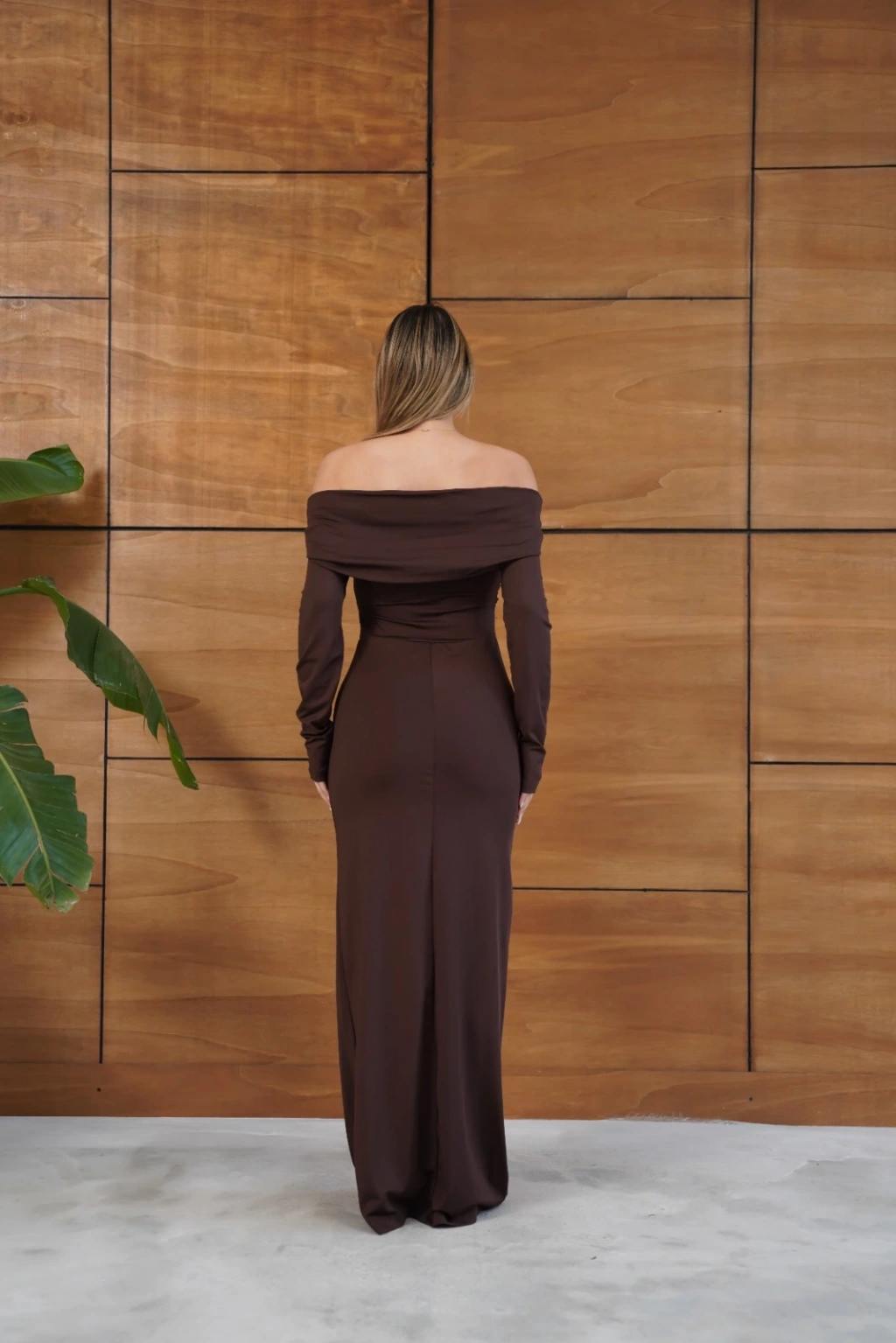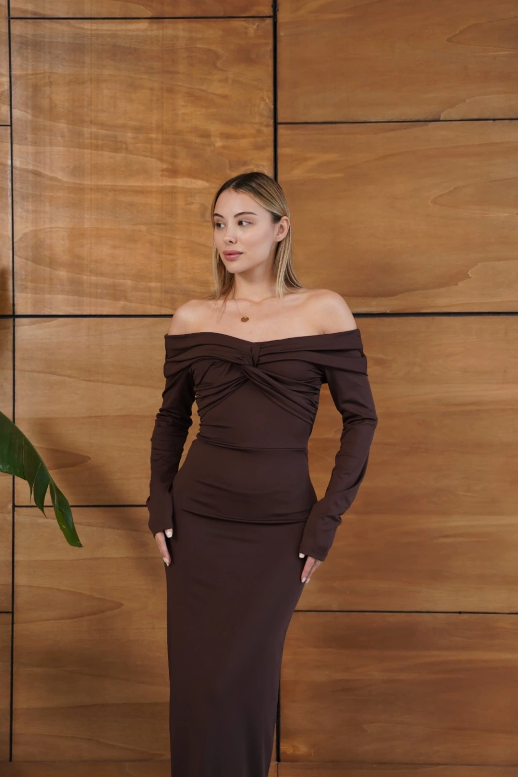 Madonna Yaka Büzgü Detaylı Uzun Elbise Kahve