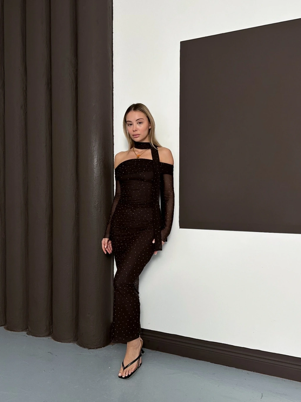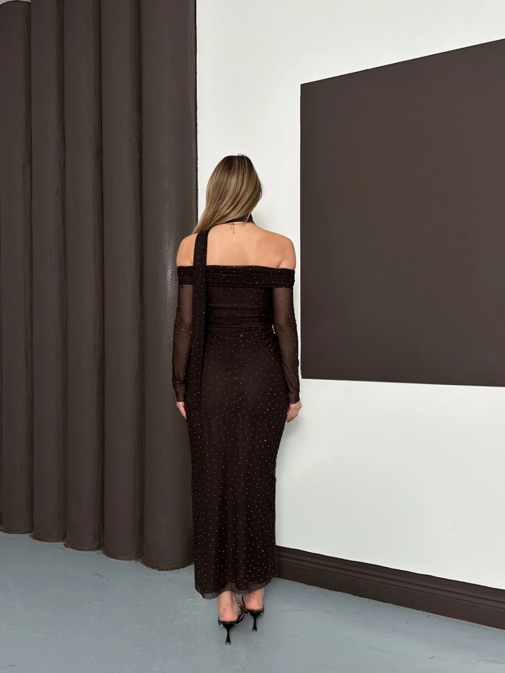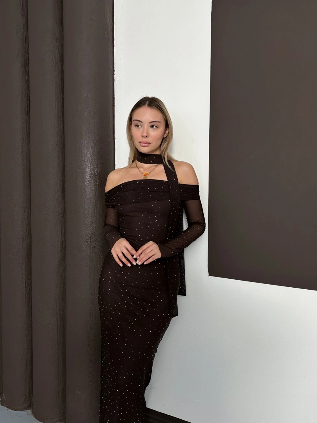 Madonna Yaka Taş Detaylı Işıltılı Elbise Acı Kahve