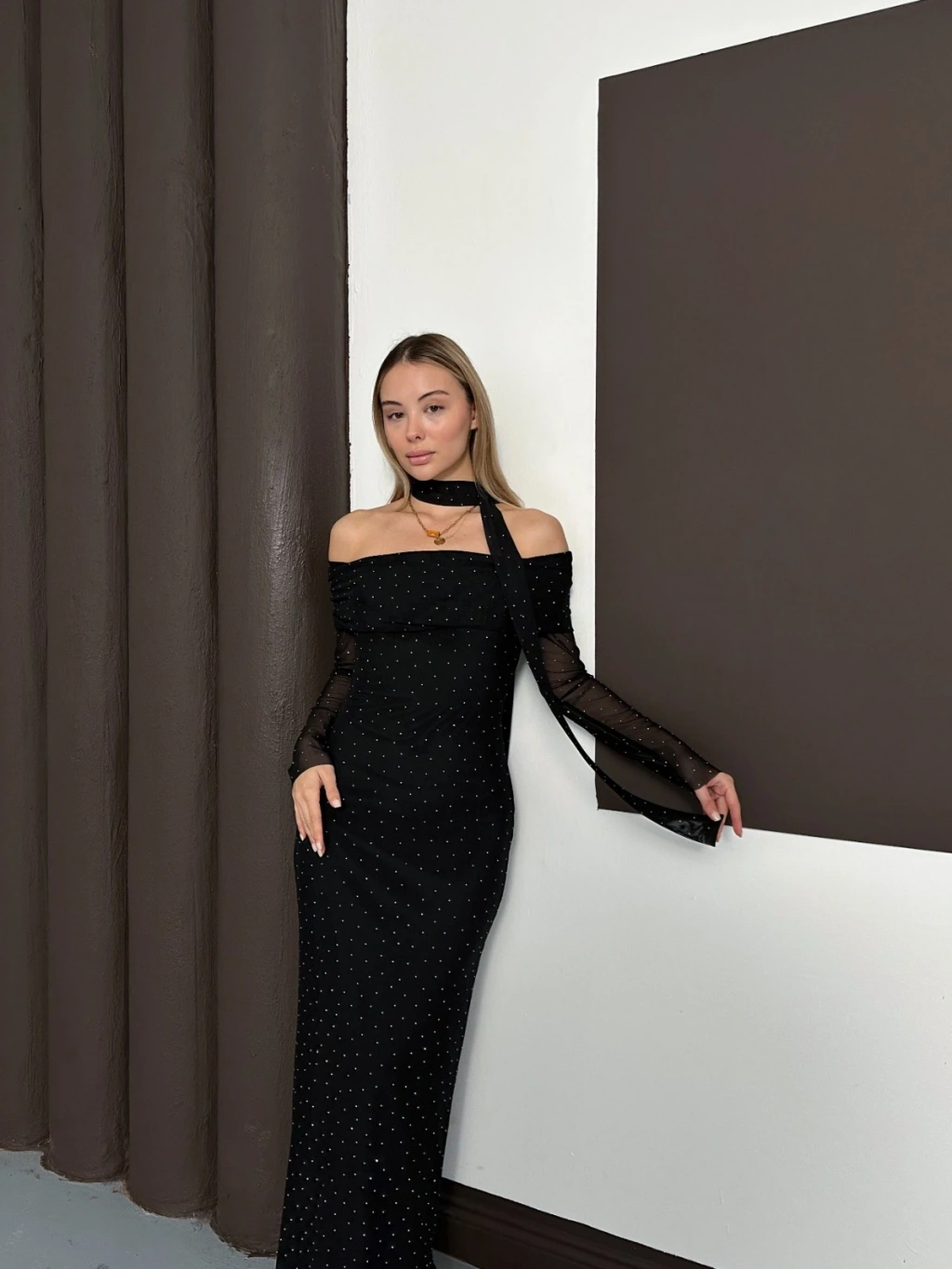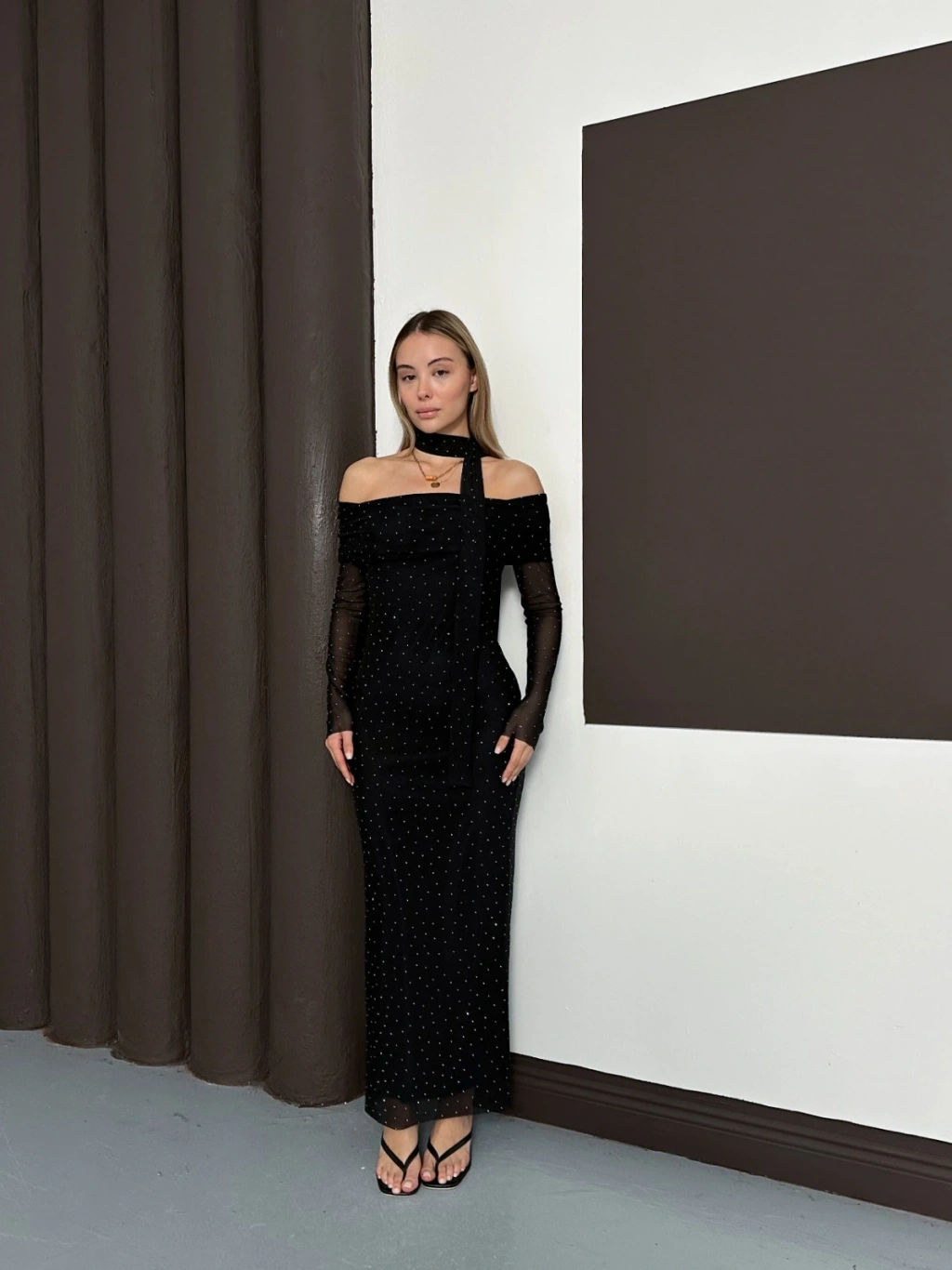 Madonna Yaka Taş Detaylı Işıltılı Elbise