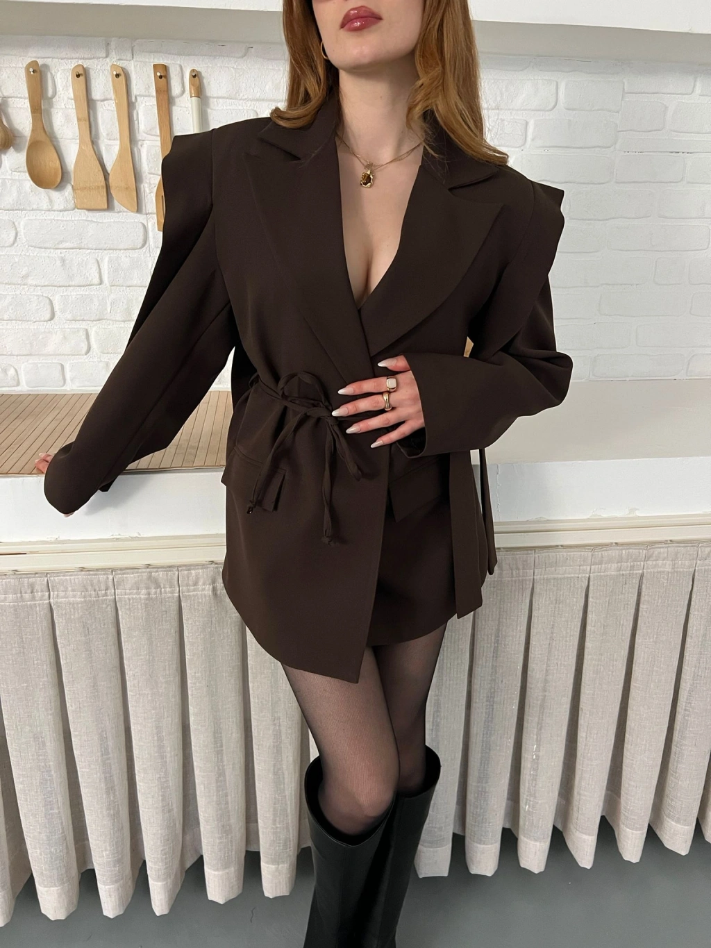 Omuz Detaylı Belden Bağlamalı Ceket Acı Kahve