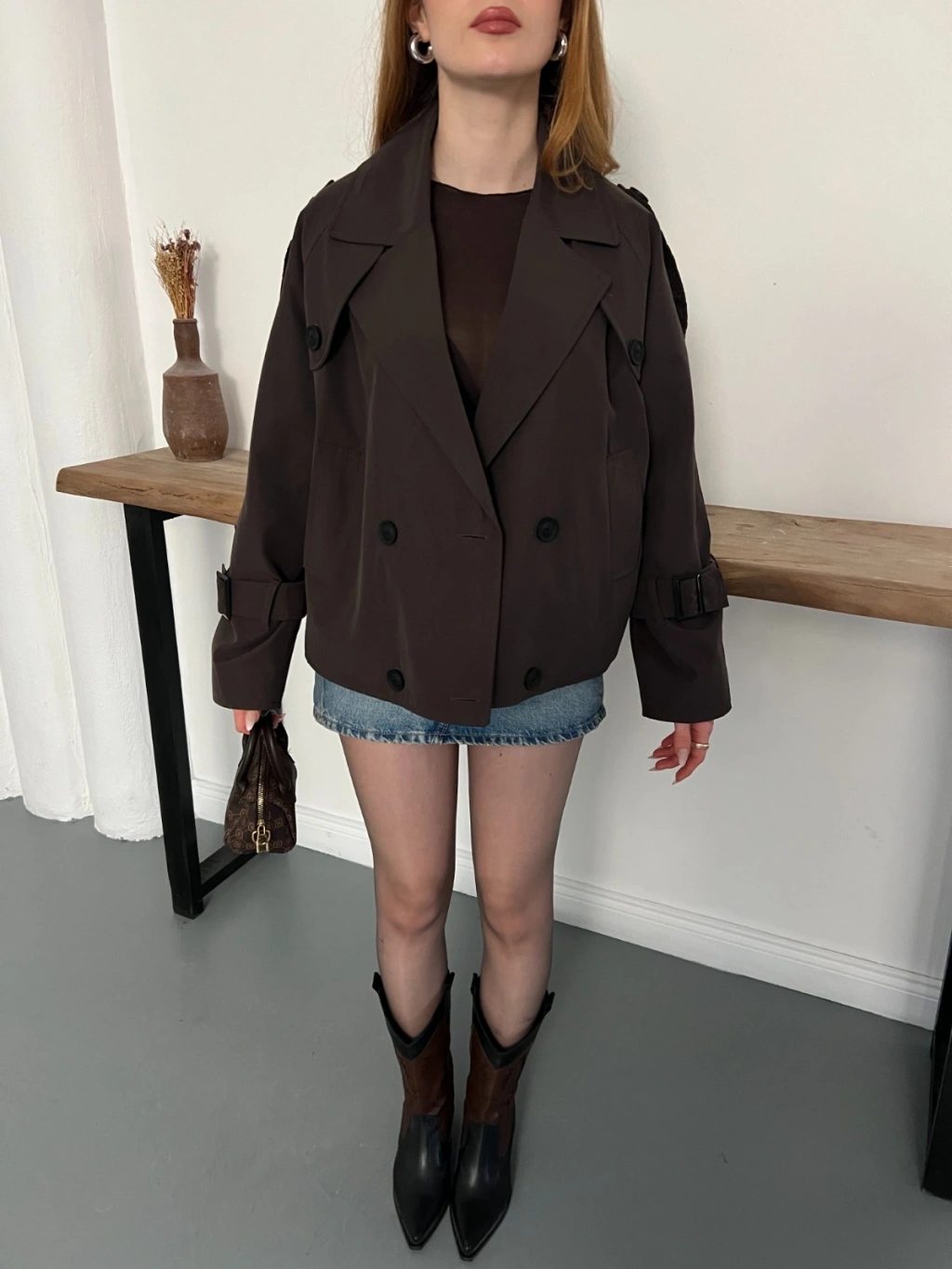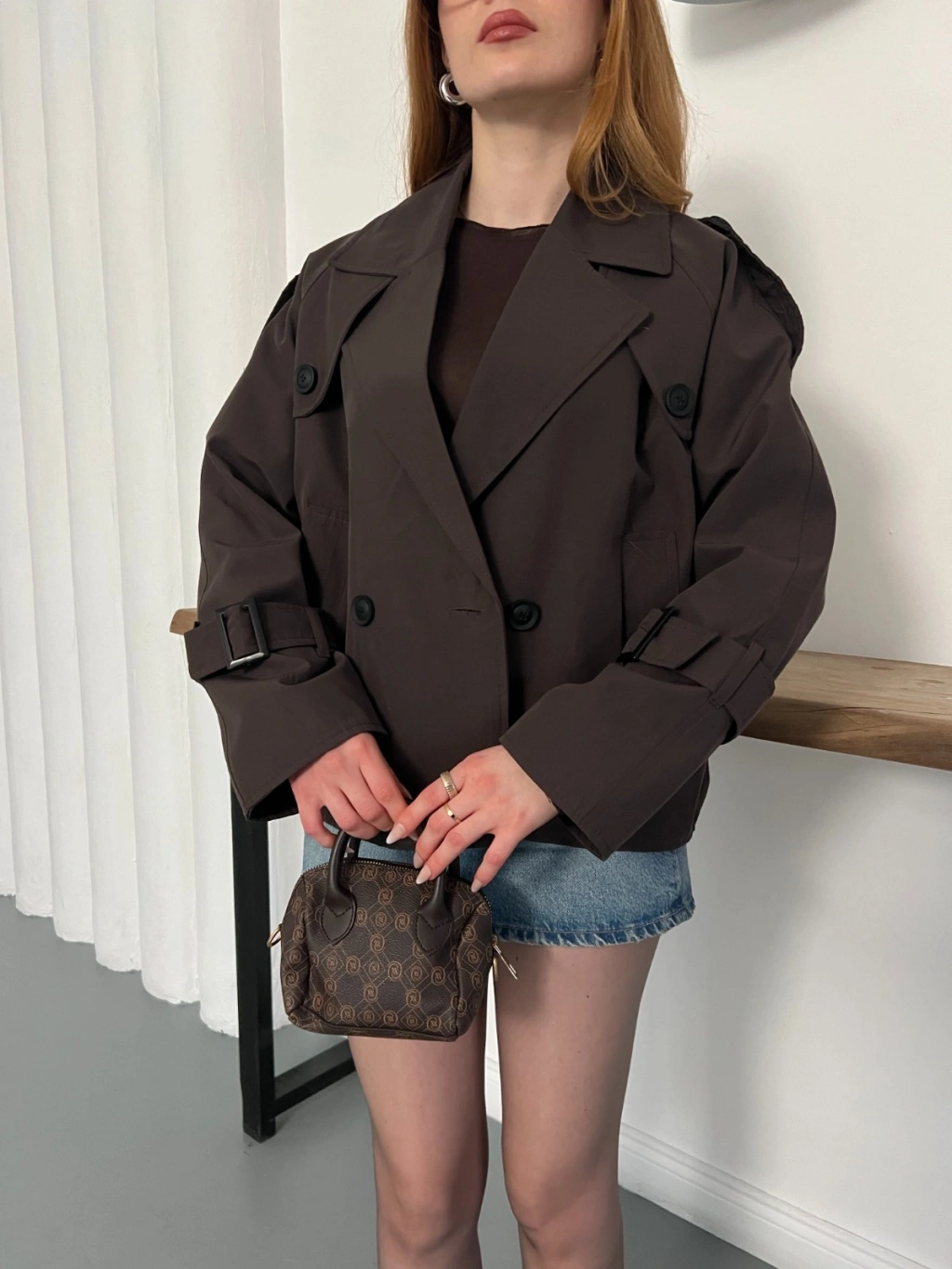 Omuz Kol Manşet Detaylı Cepli Trenç Ceket Acı Kahve