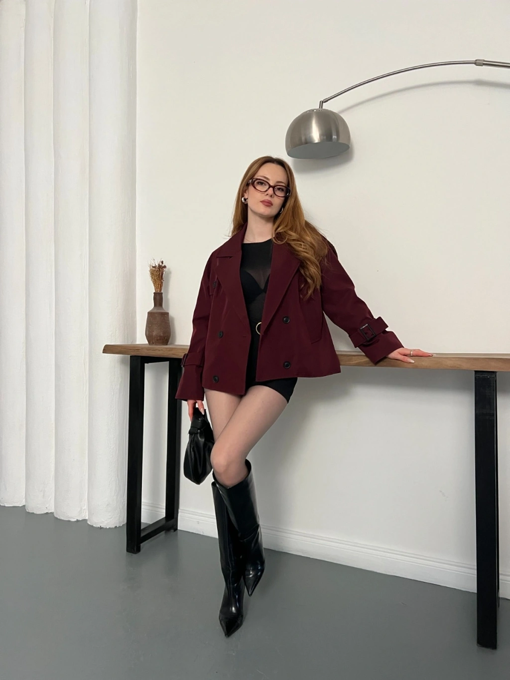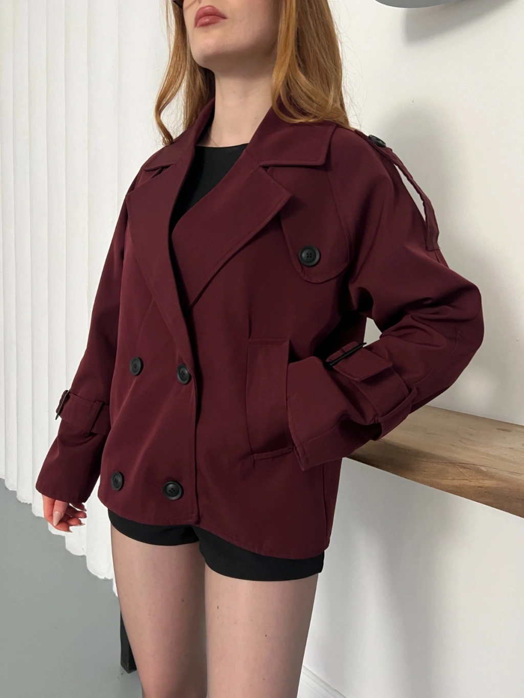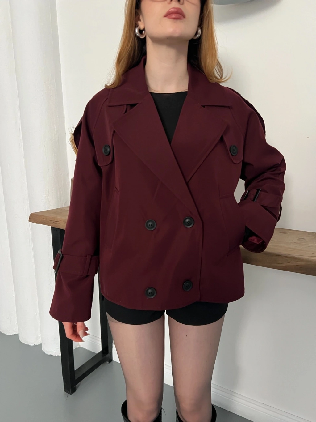 Omuz Kol Manşet Detaylı Cepli Trenç Ceket Bordo