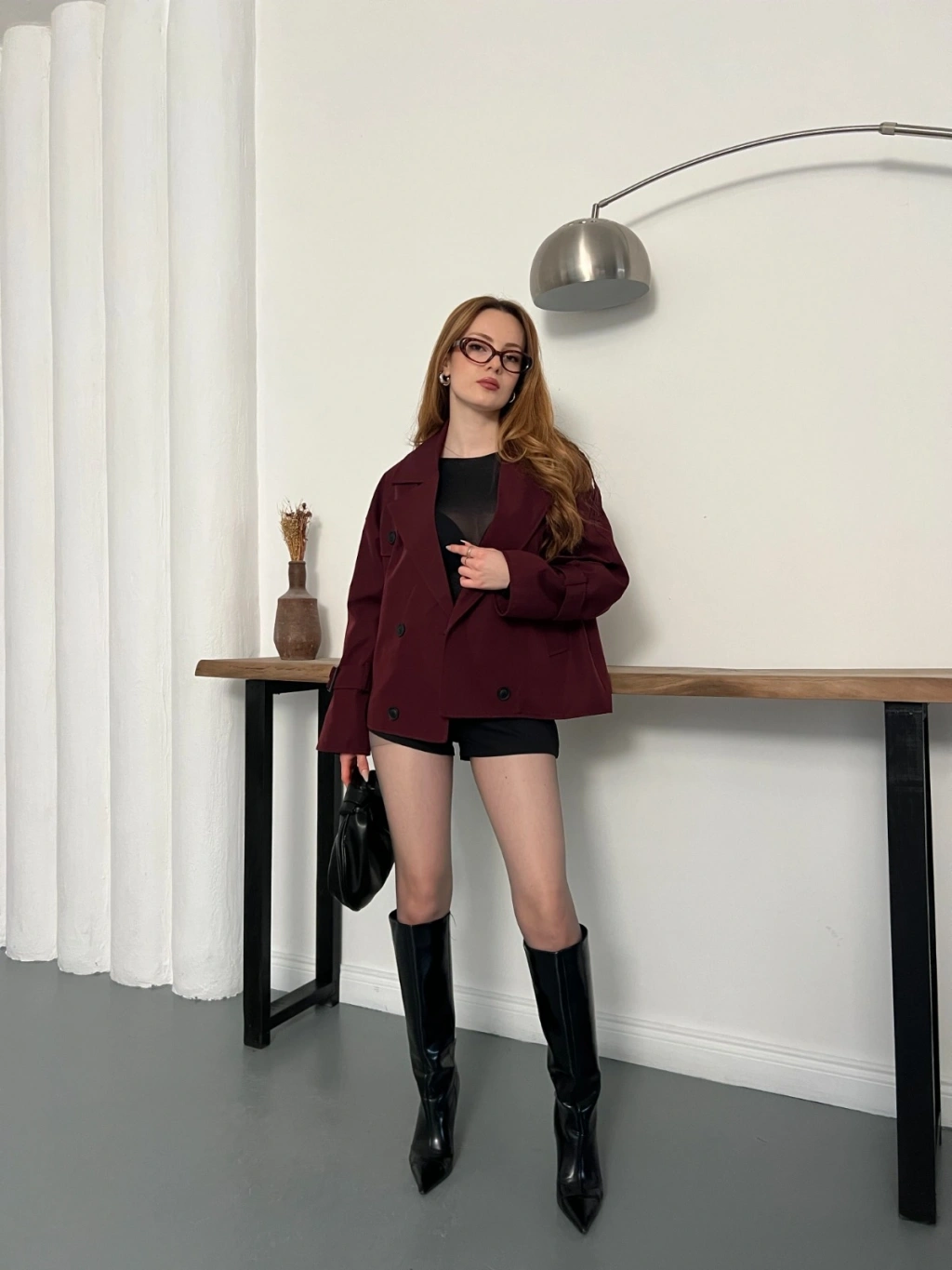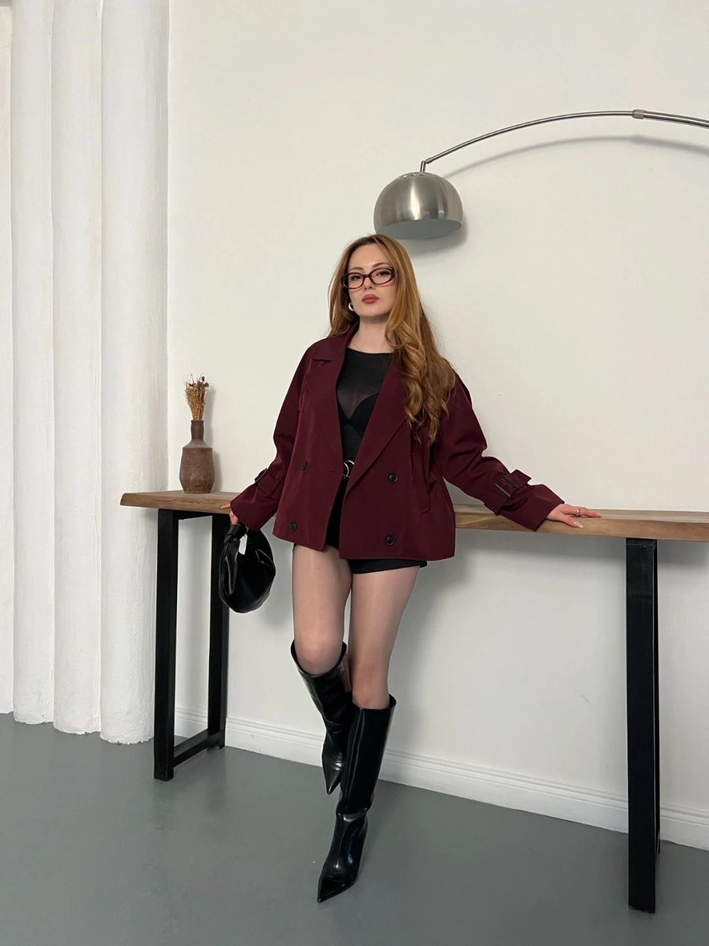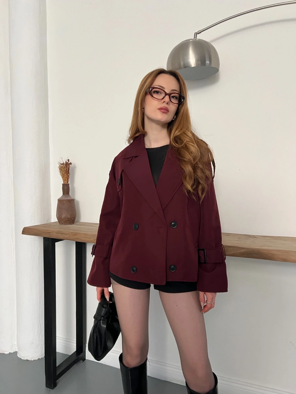 Omuz Kol Manşet Detaylı Cepli Trenç Ceket Bordo