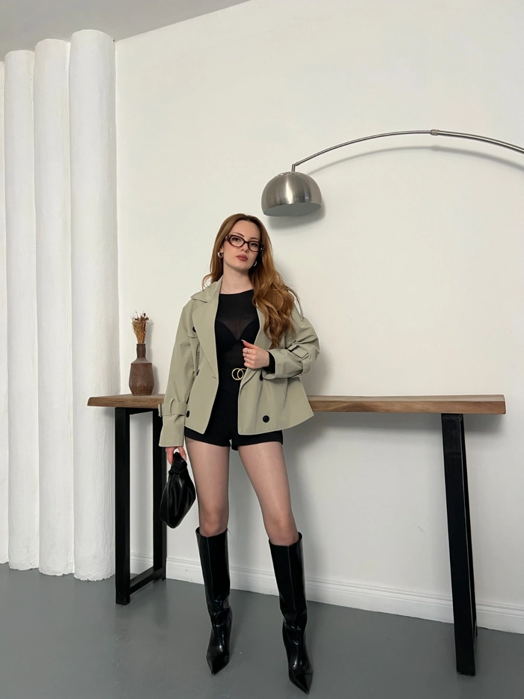 Omuz Kol Manşet Detaylı Cepli Trenç Ceket Haki