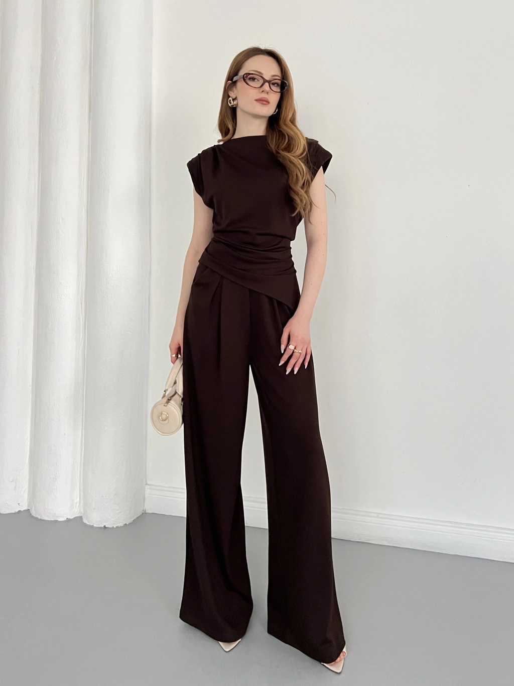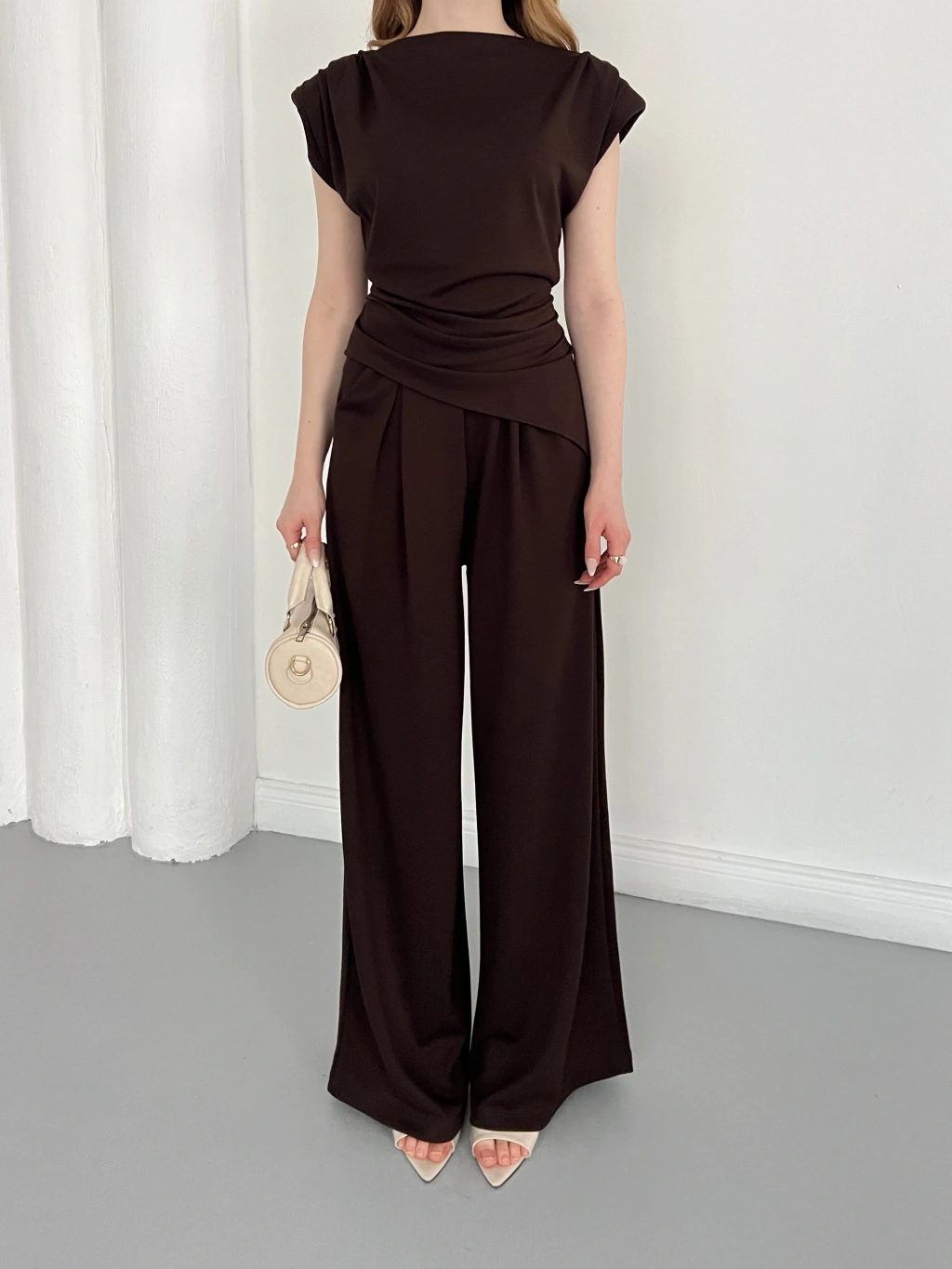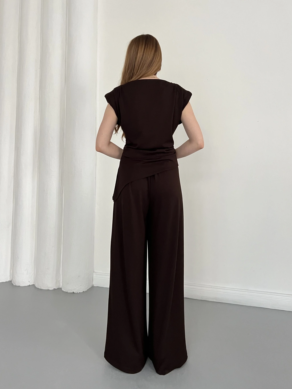 Omuz Vatkalı Asimetrik Kesim Takım Kahve