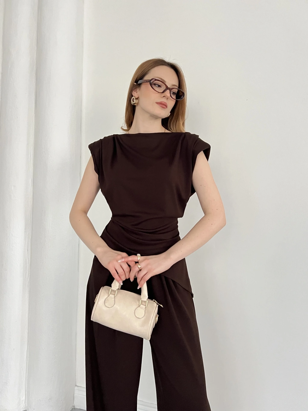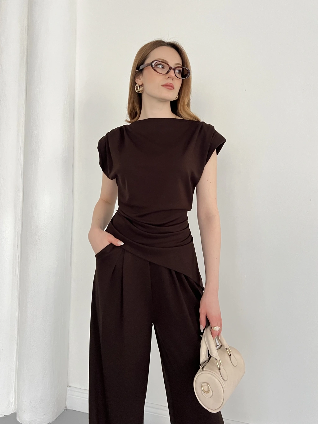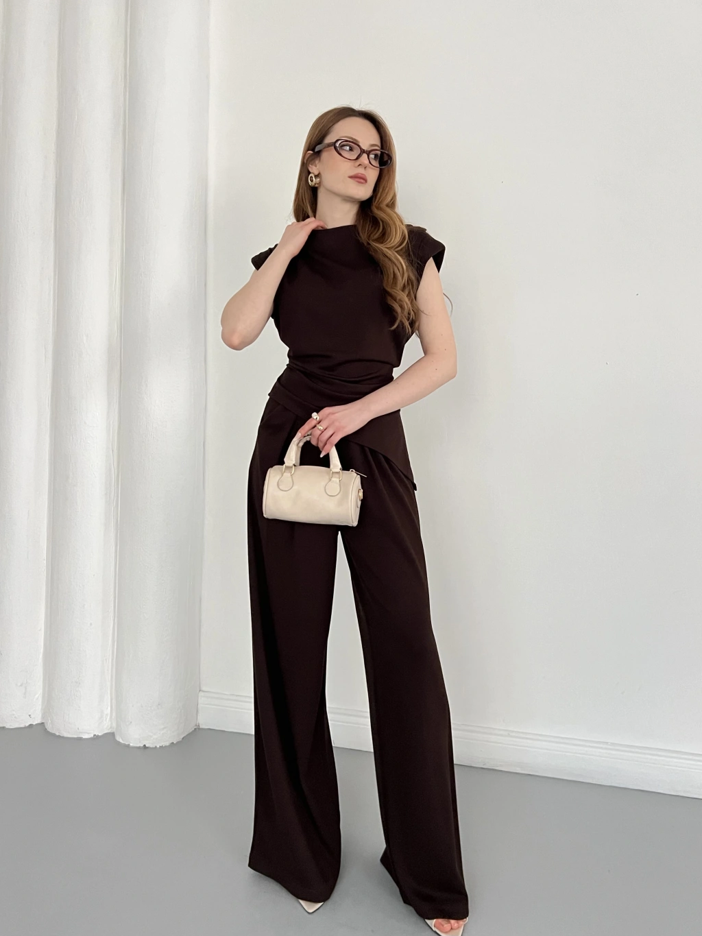 Omuz Vatkalı Asimetrik Kesim Takım Kahve
