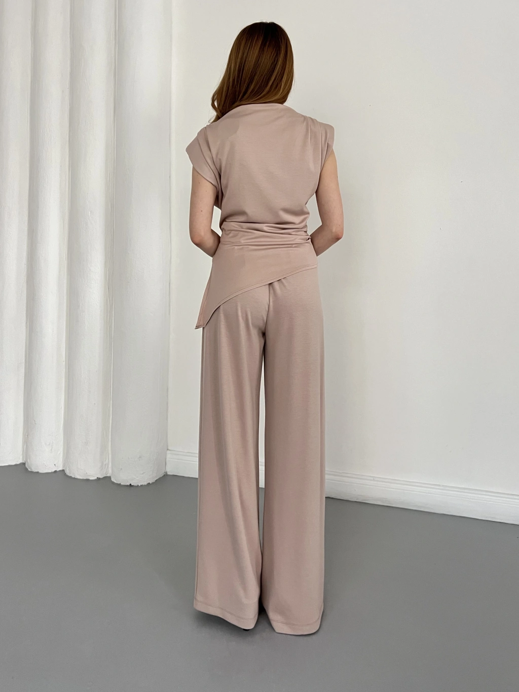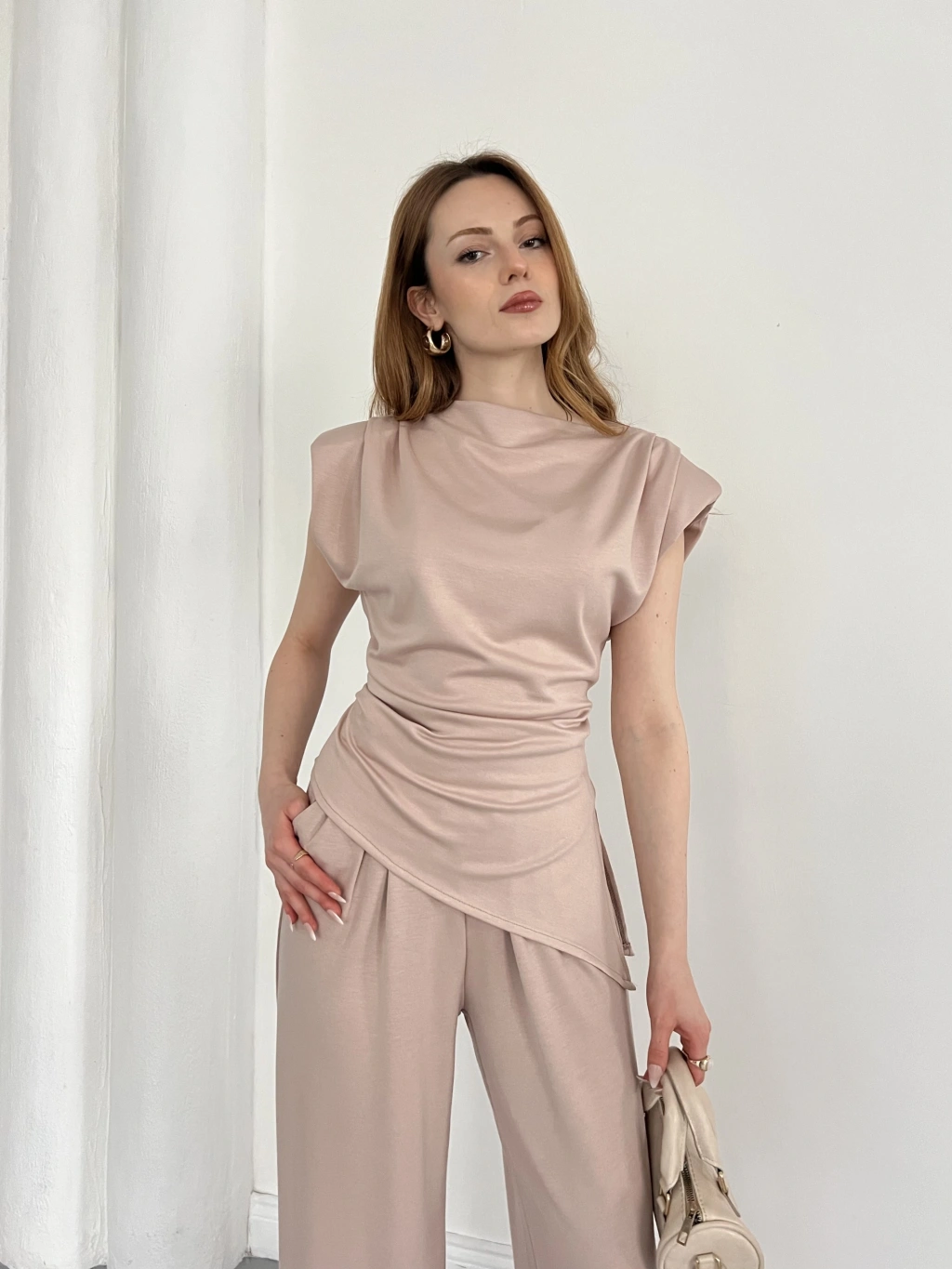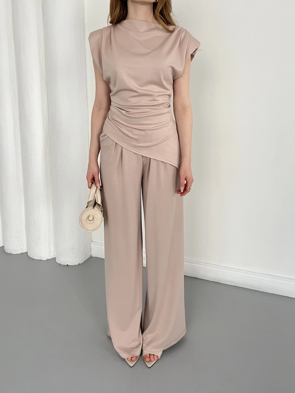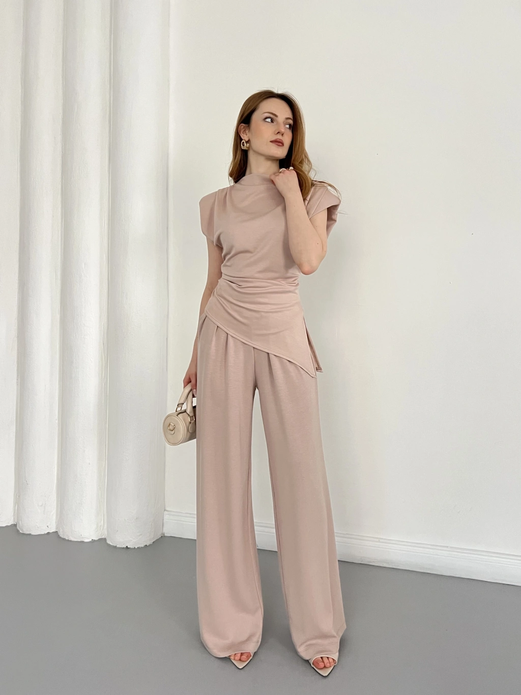 Omuz Vatkalı Asimetrik Kesim Takım Pudra