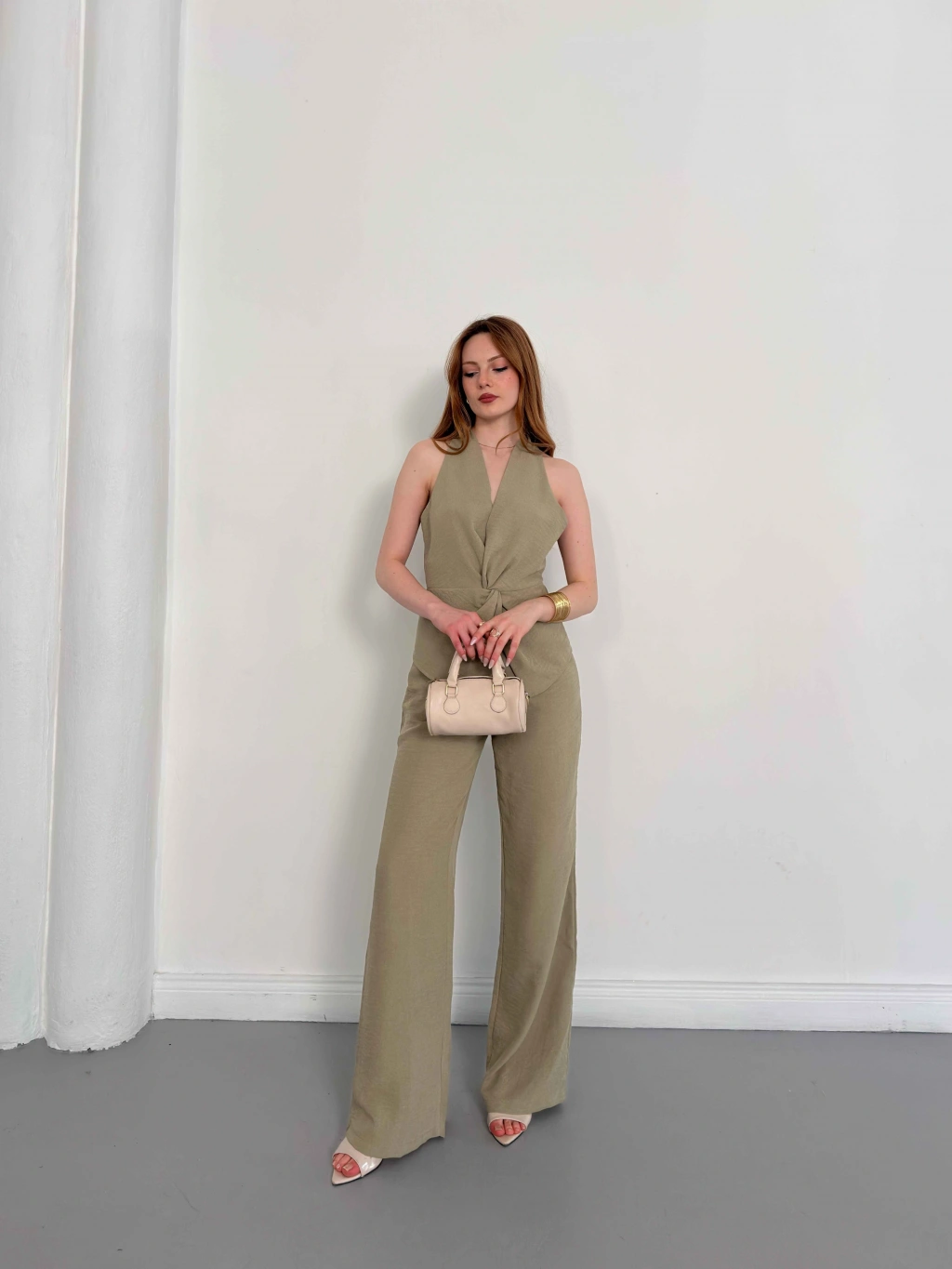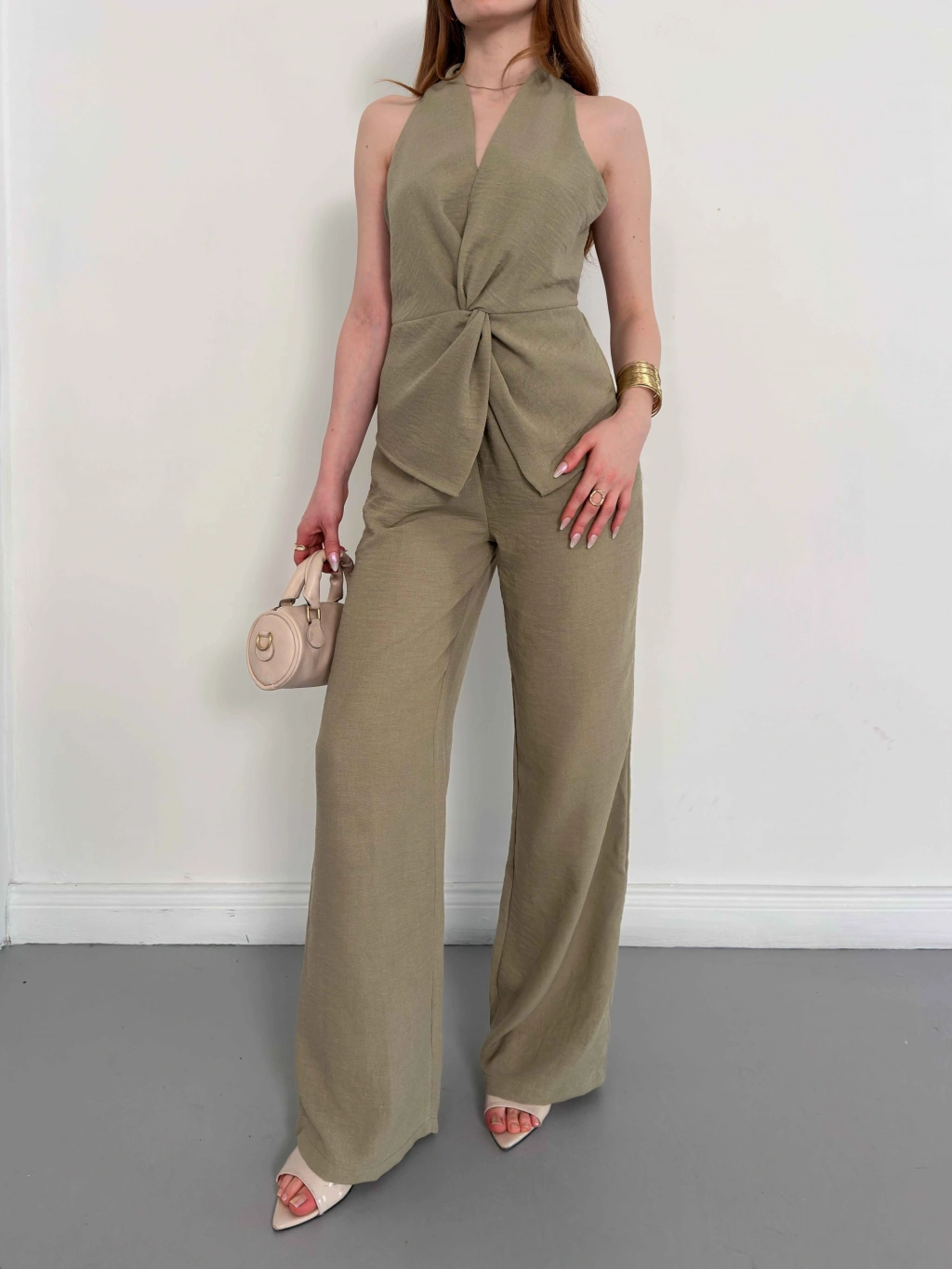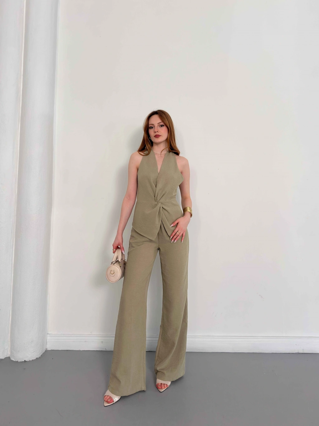 Ön Büzgü Detaylı Yelekli Takım Haki