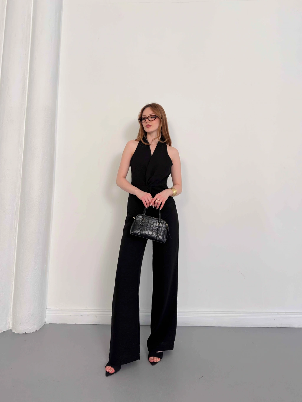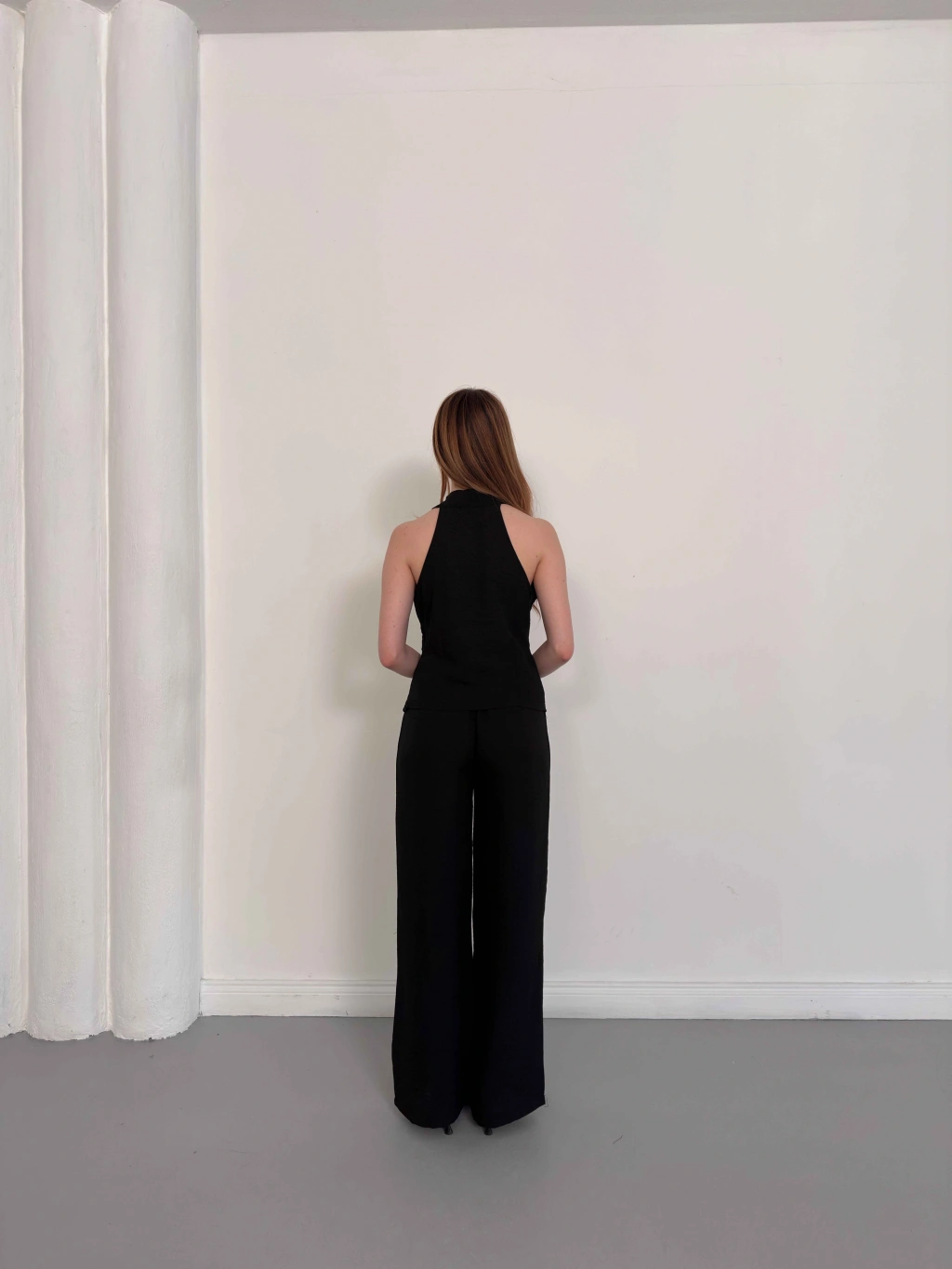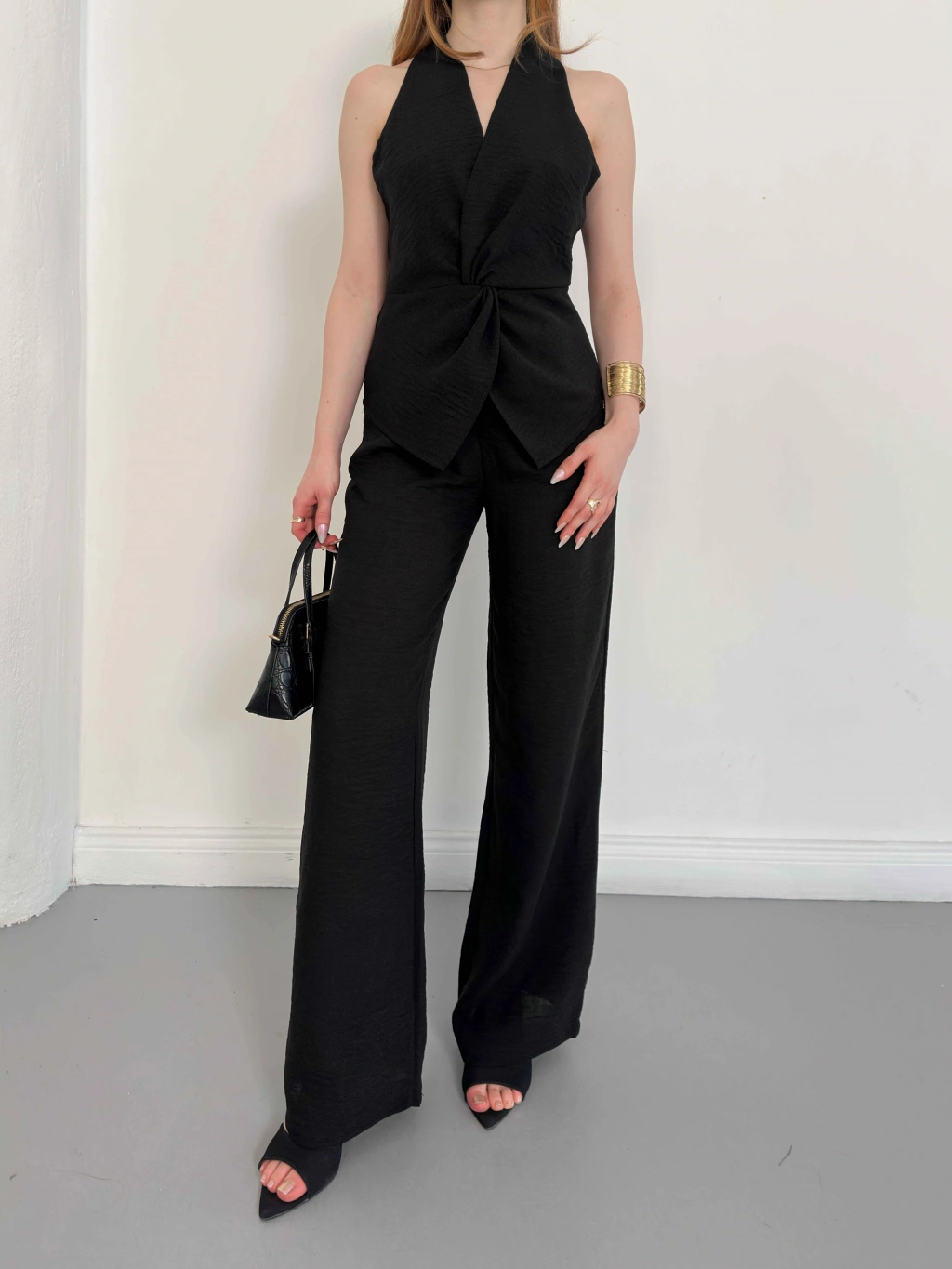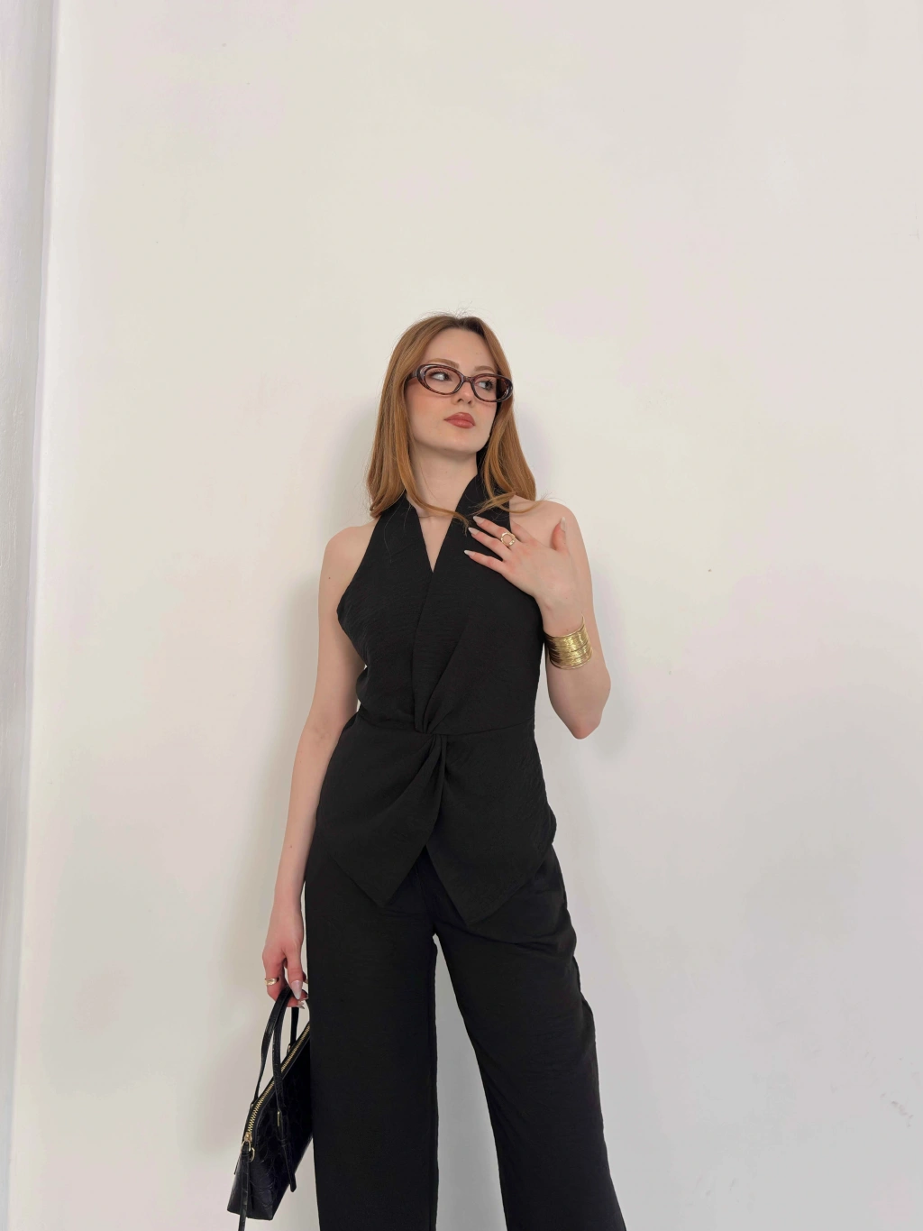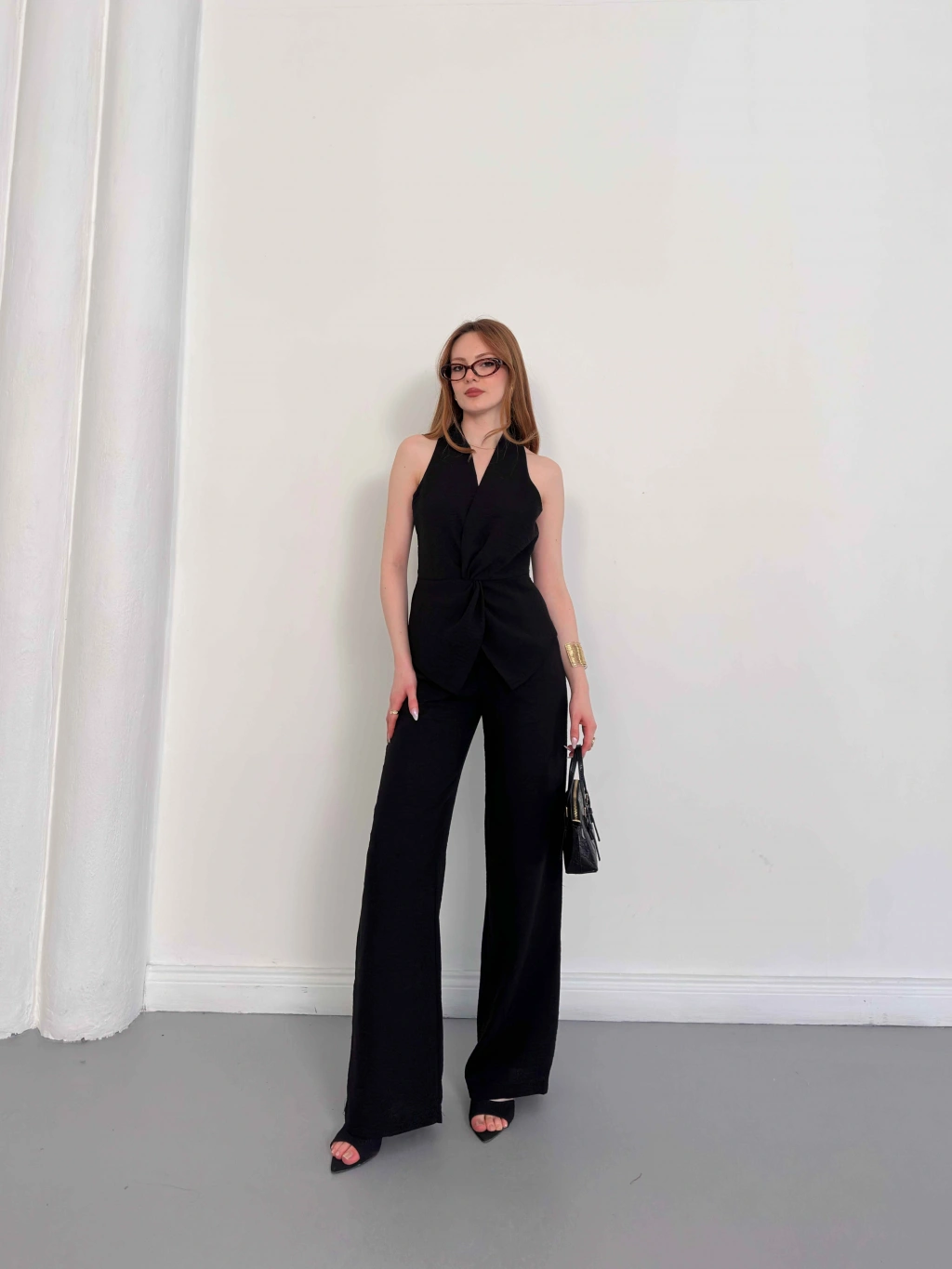 Ön Büzgü Detaylı Yelekli Takım Siyah