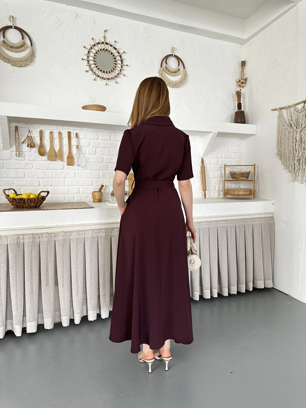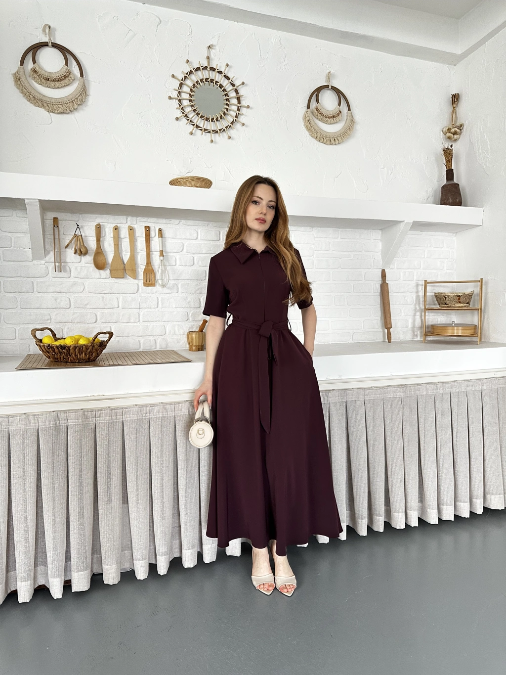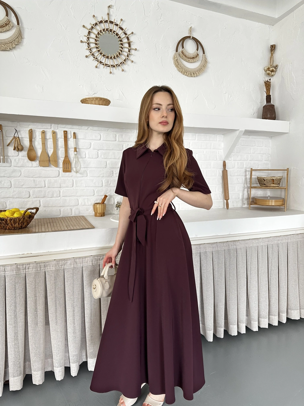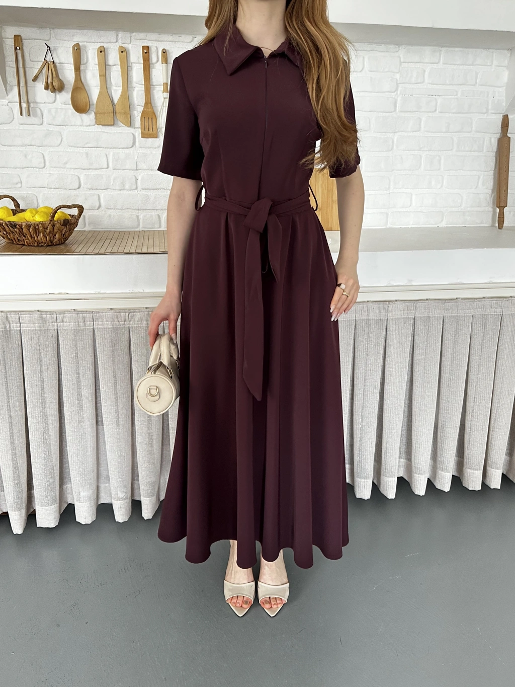 Ön Fermuar Detaylı Bel Kuşaklı Modal Kumaş Elbise Bordo