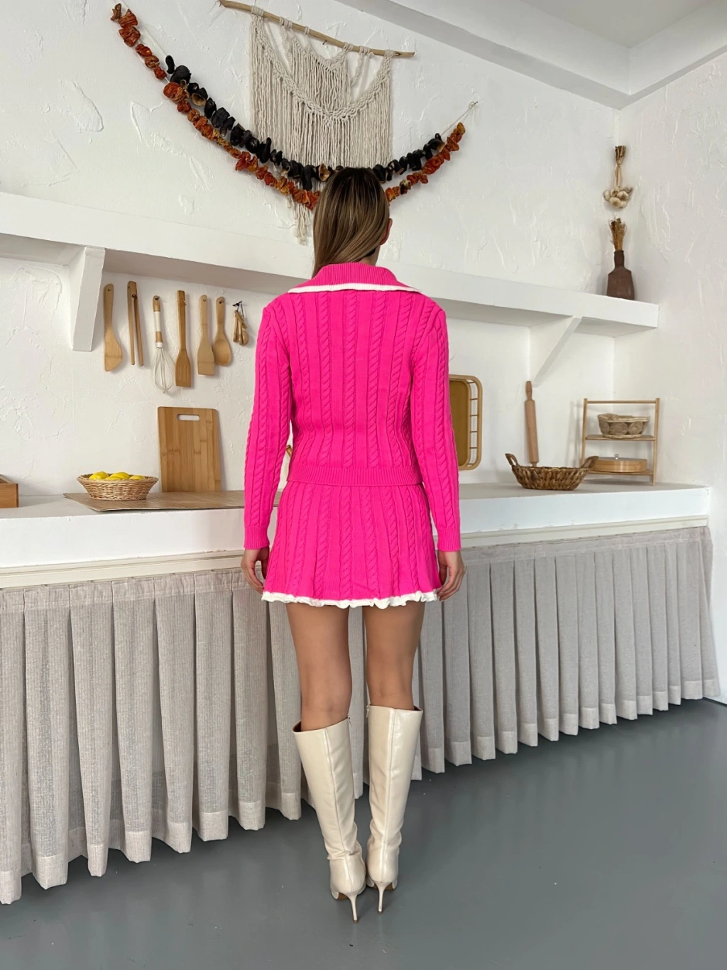 Örme Triko Etekli İkili Set Fuşya