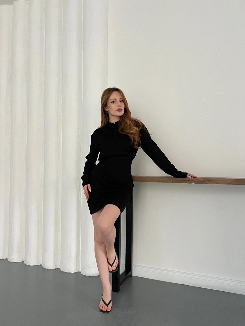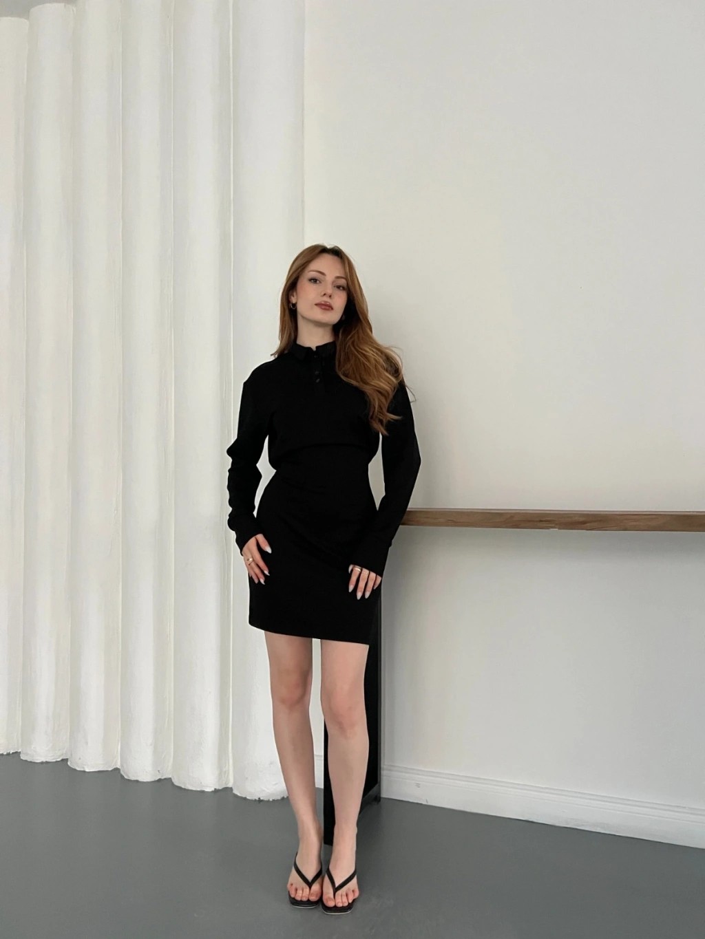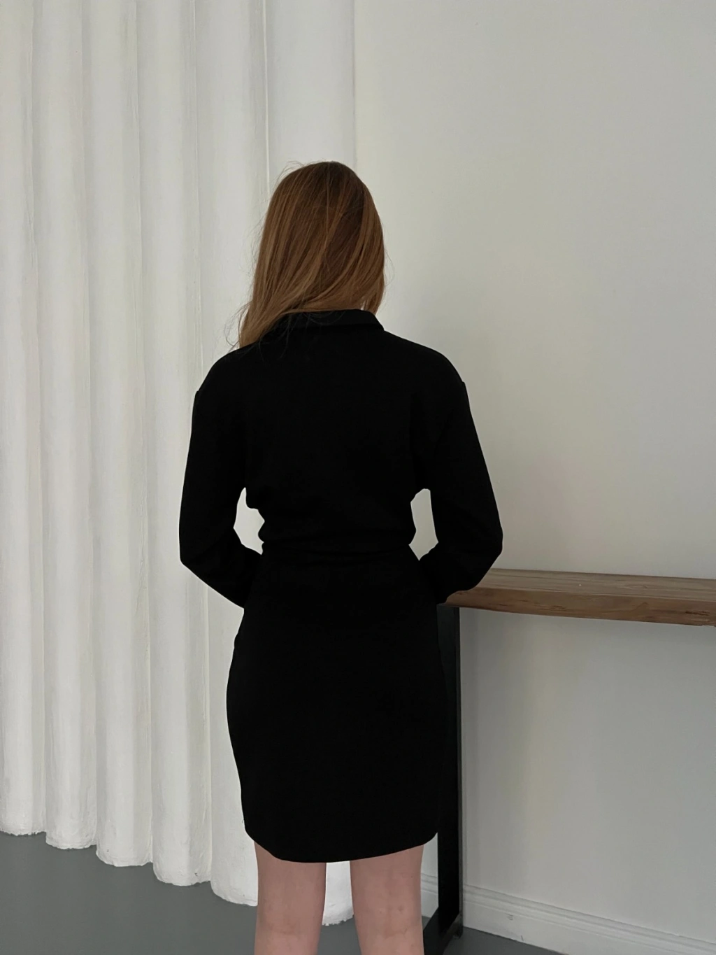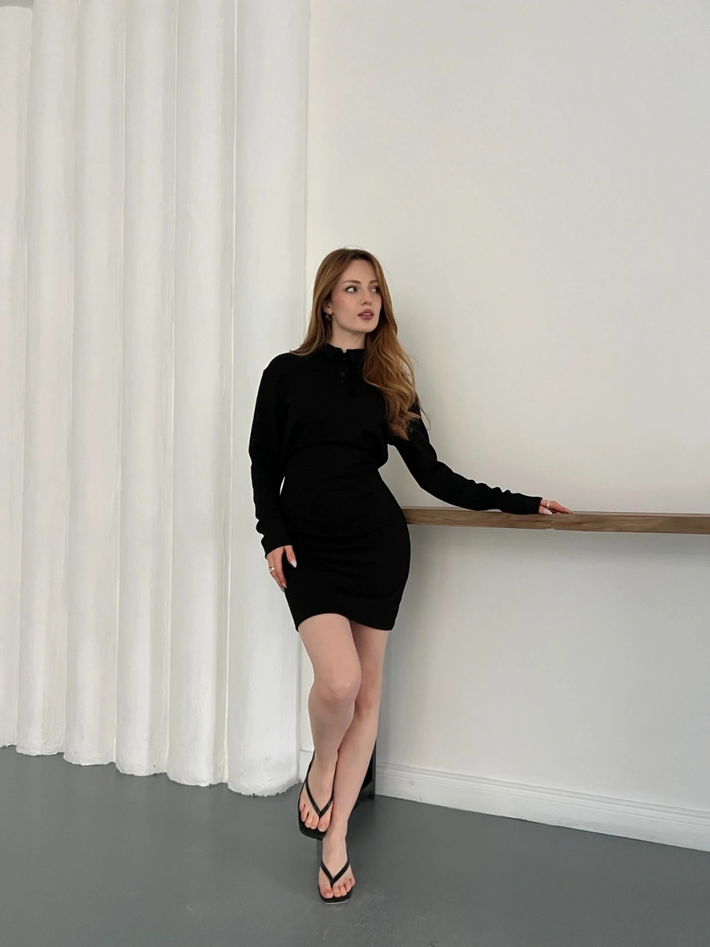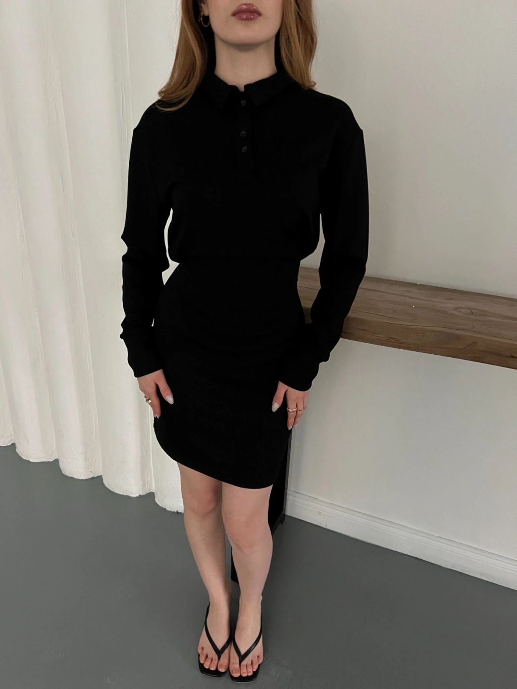 Polo Yaka Düğme Detaylı Uzun Kol Mini Elbise Siyah