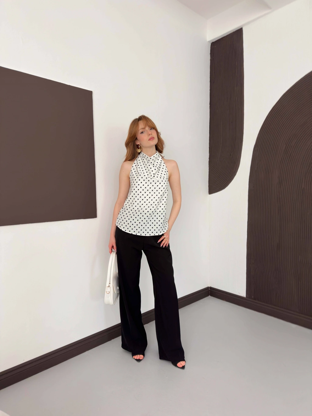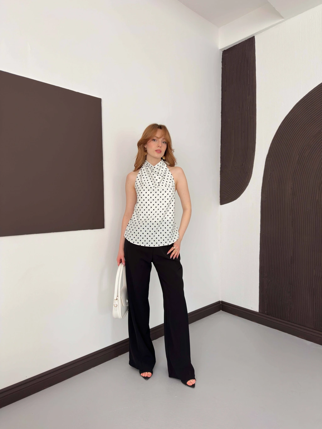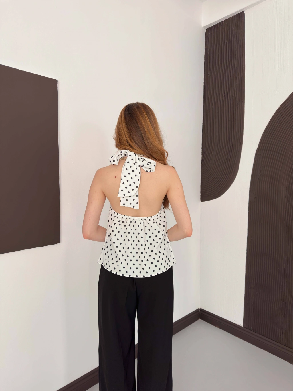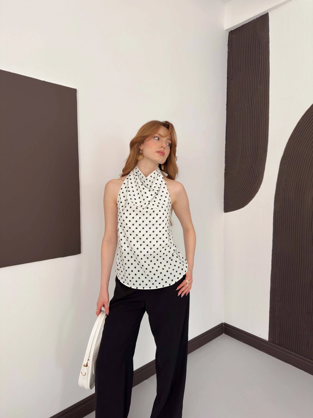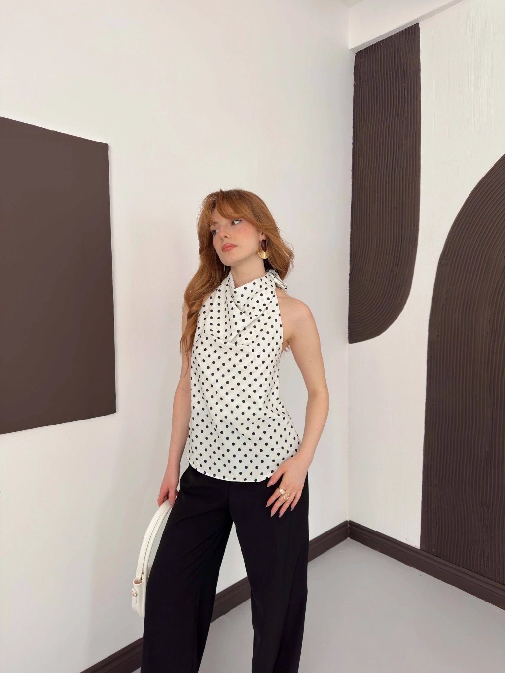 Puantiyeli Boyundan Bağlamalı Bluz Beyaz