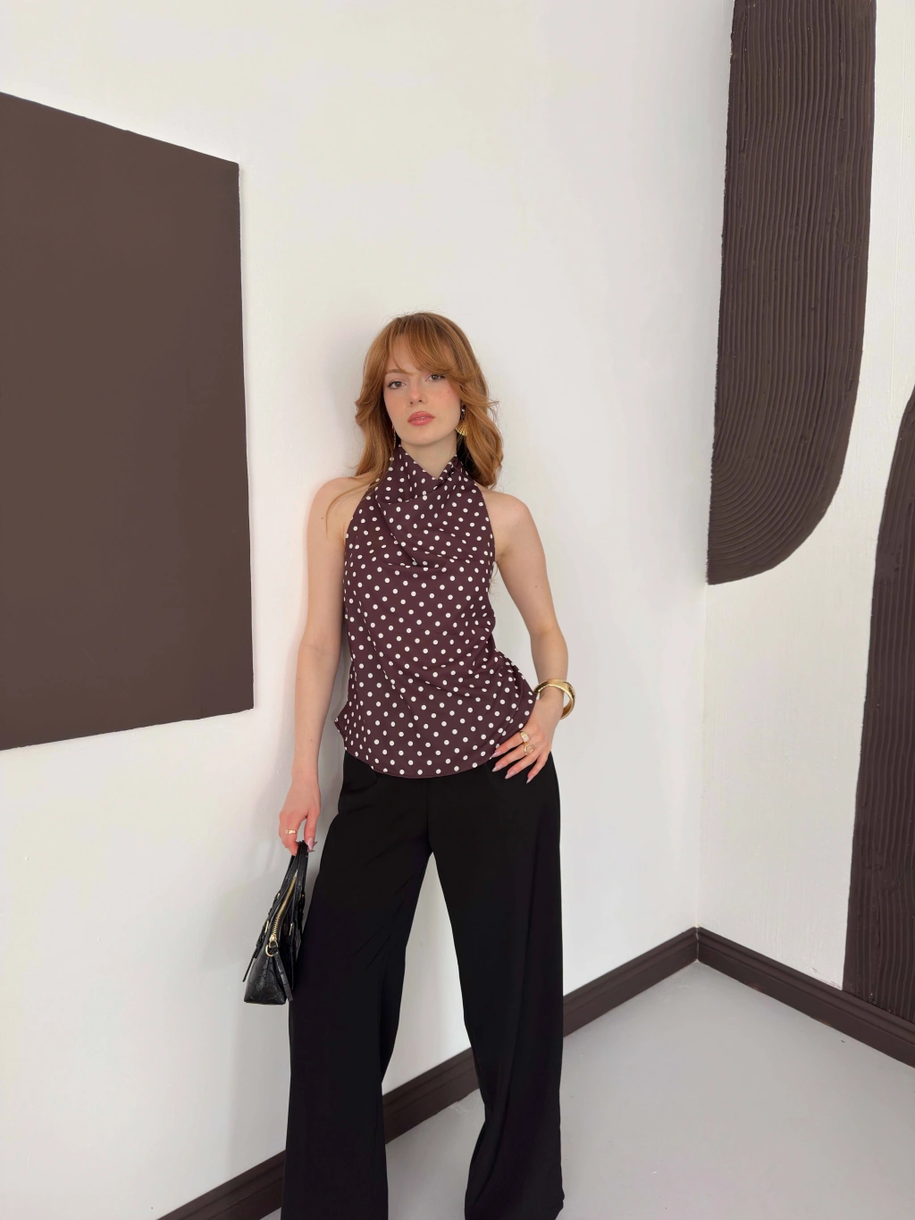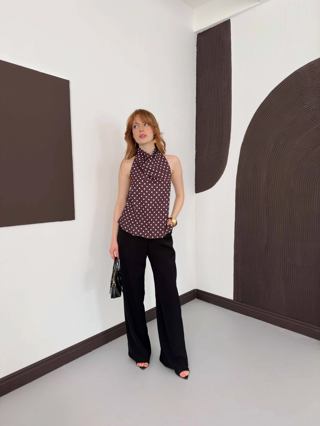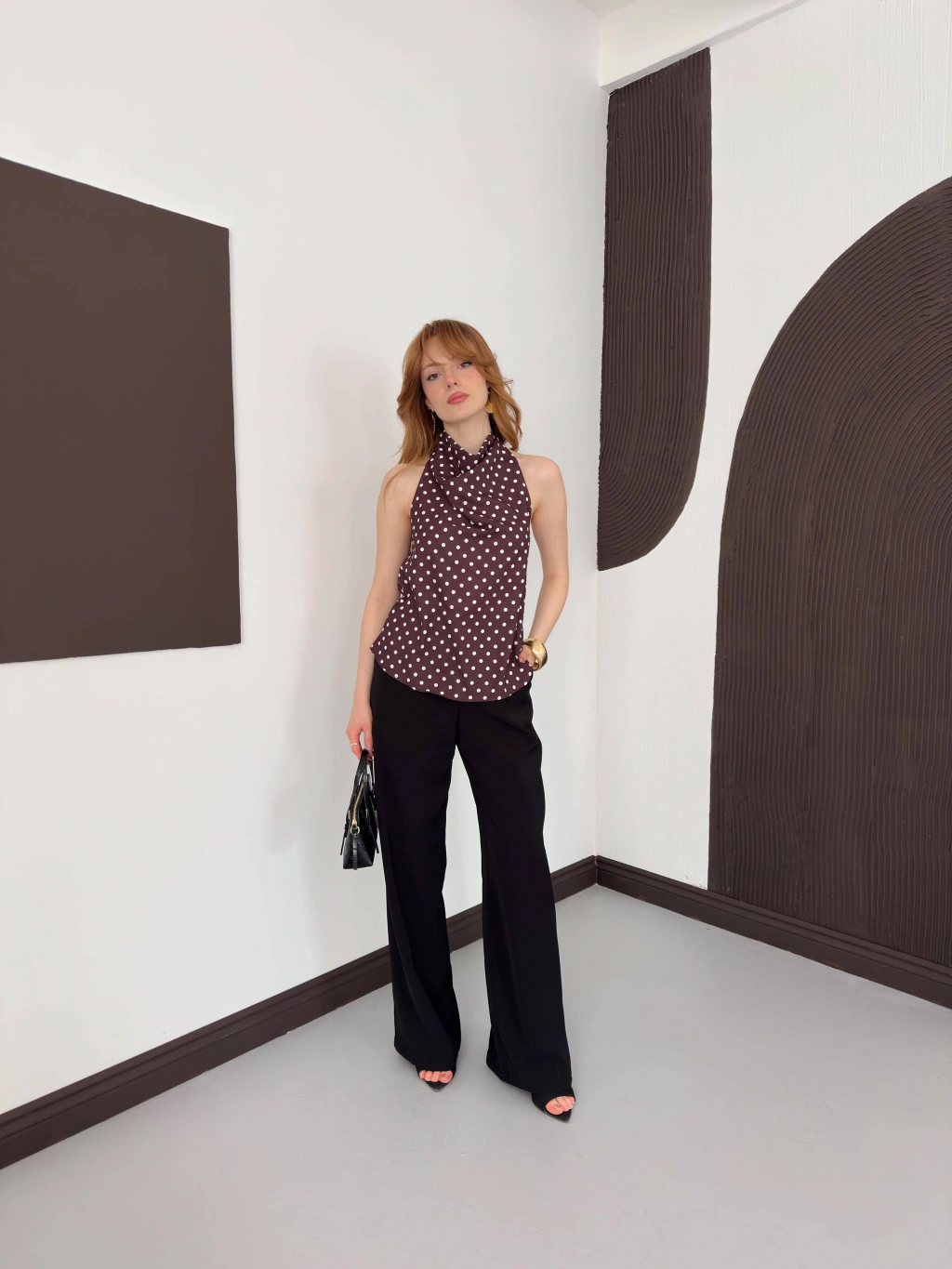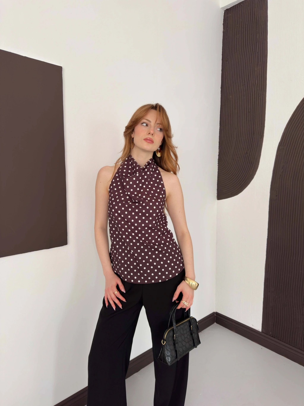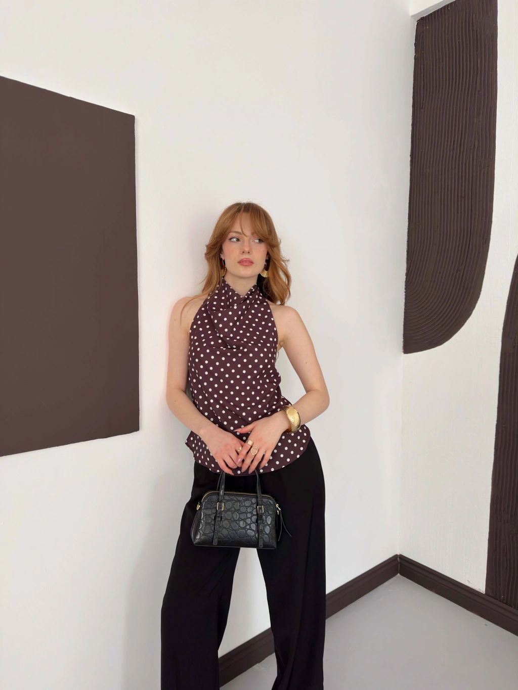 Puantiyeli Boyundan Bağlamalı Bluz Kahve
