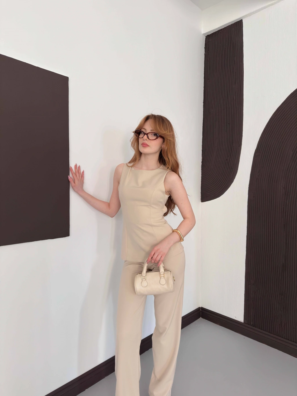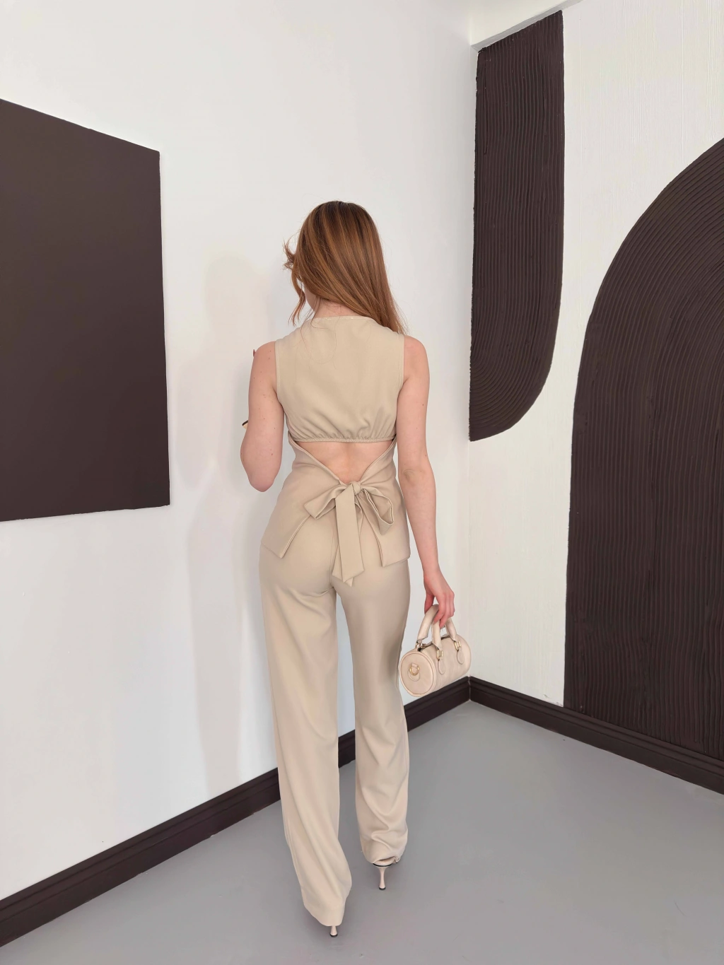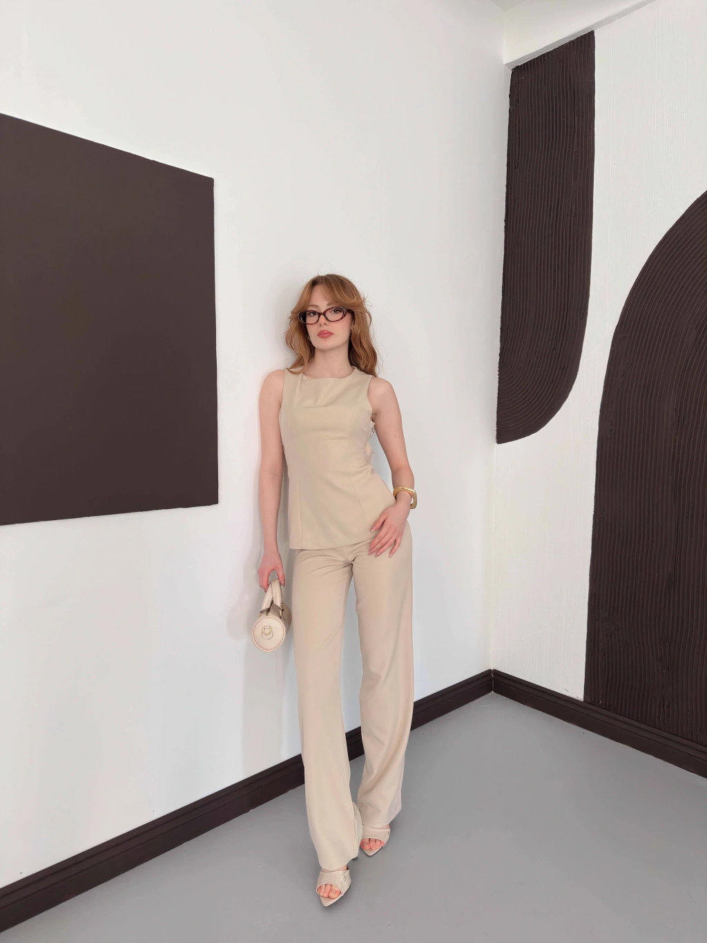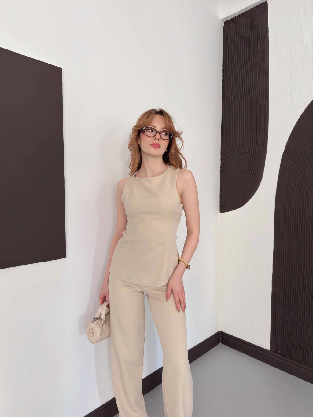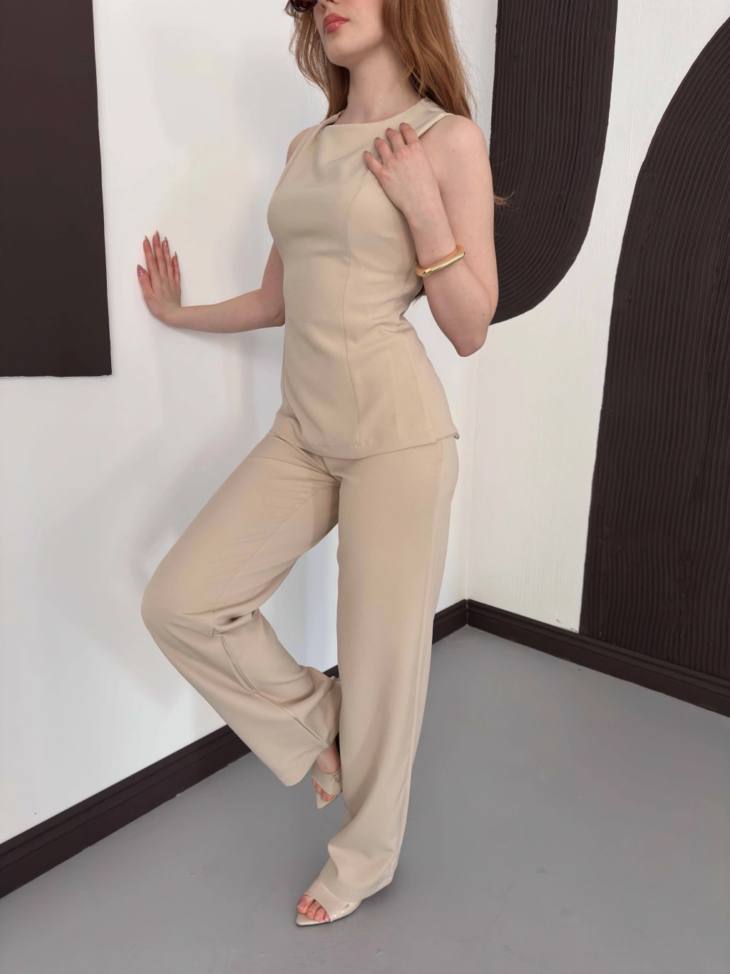 Gofre Kumaş Ters Dikiş Halter Yaka Takım Sarı