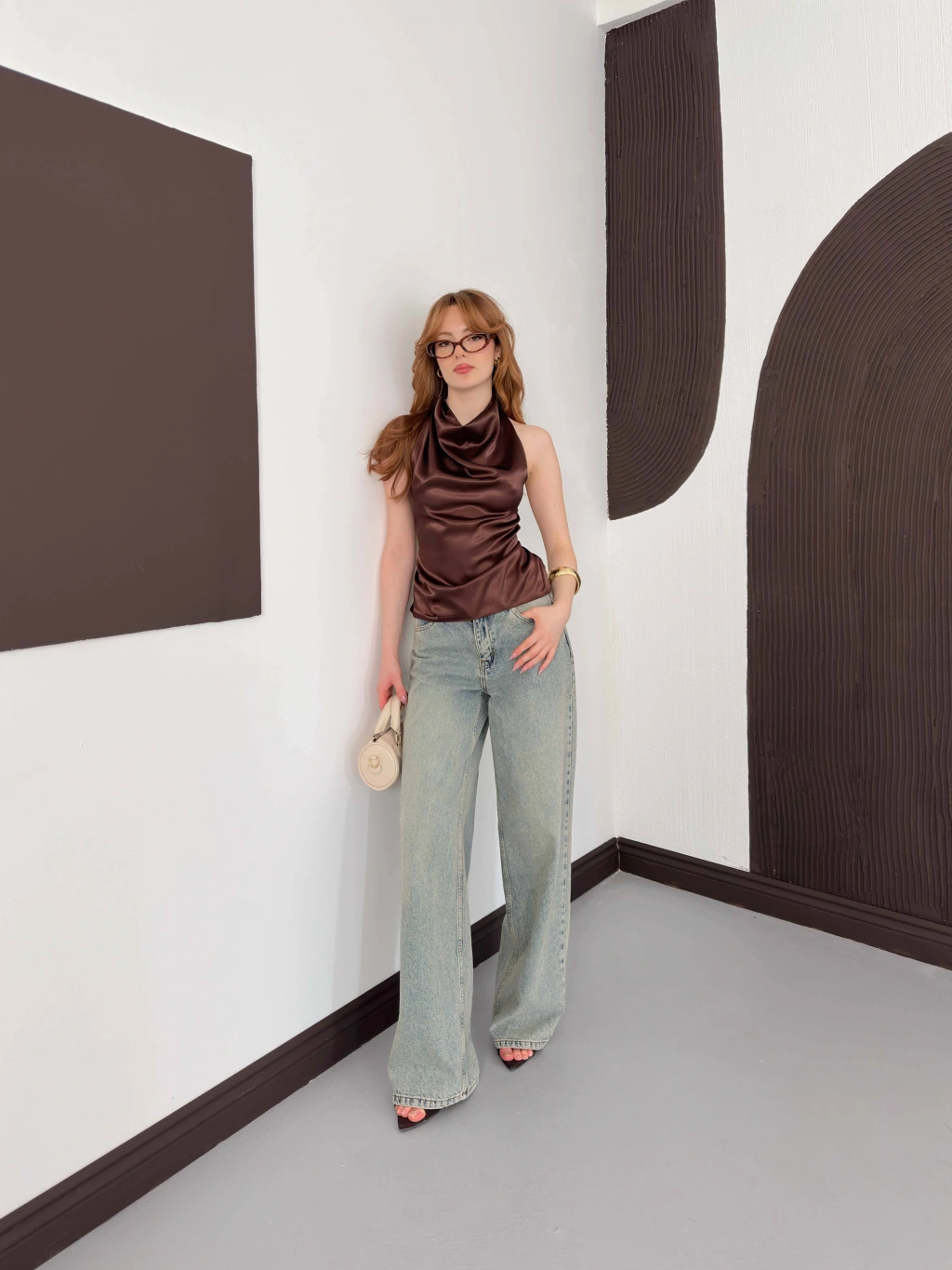 Sırt Detaylı Saten Bluz Kahve