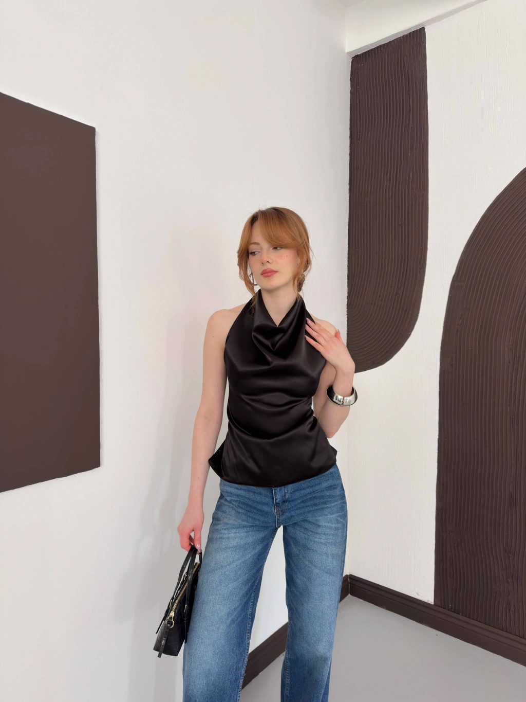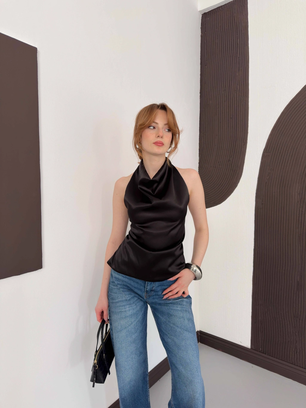 Asimetrik Kesim Vatkalı Tasarım Bluz Kahve