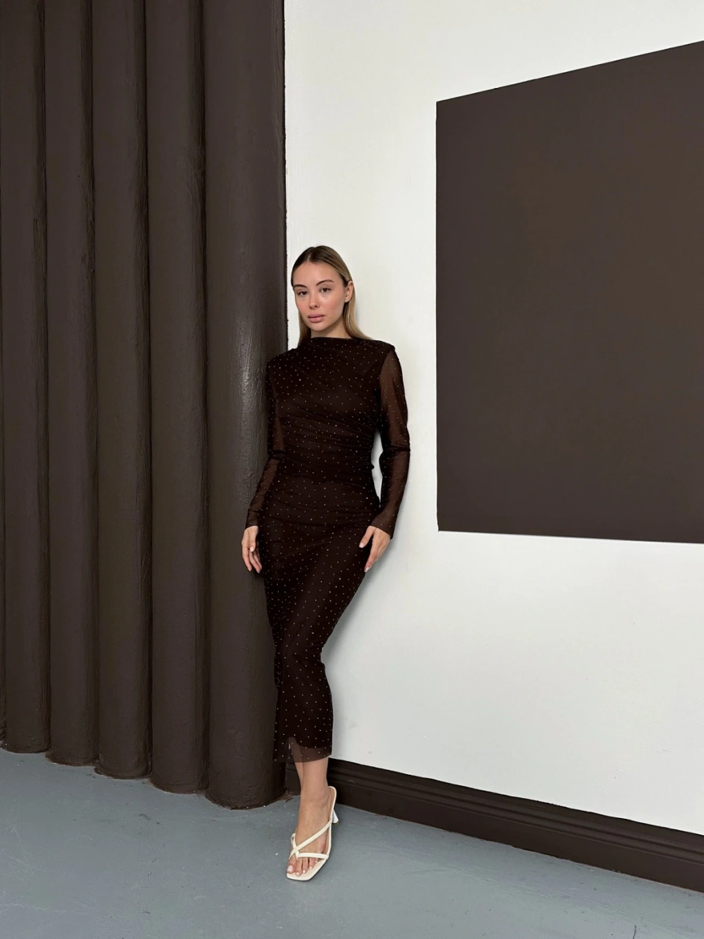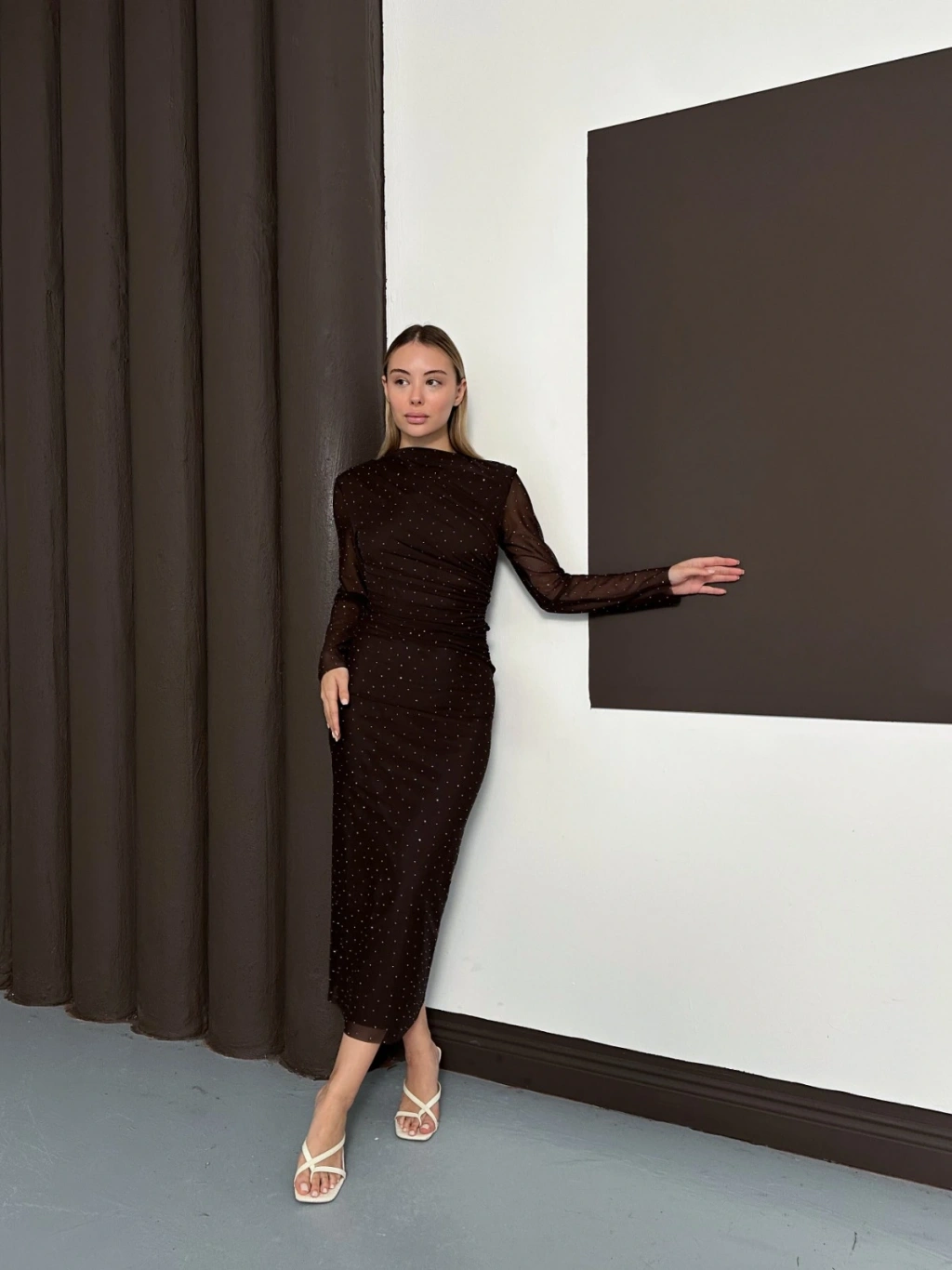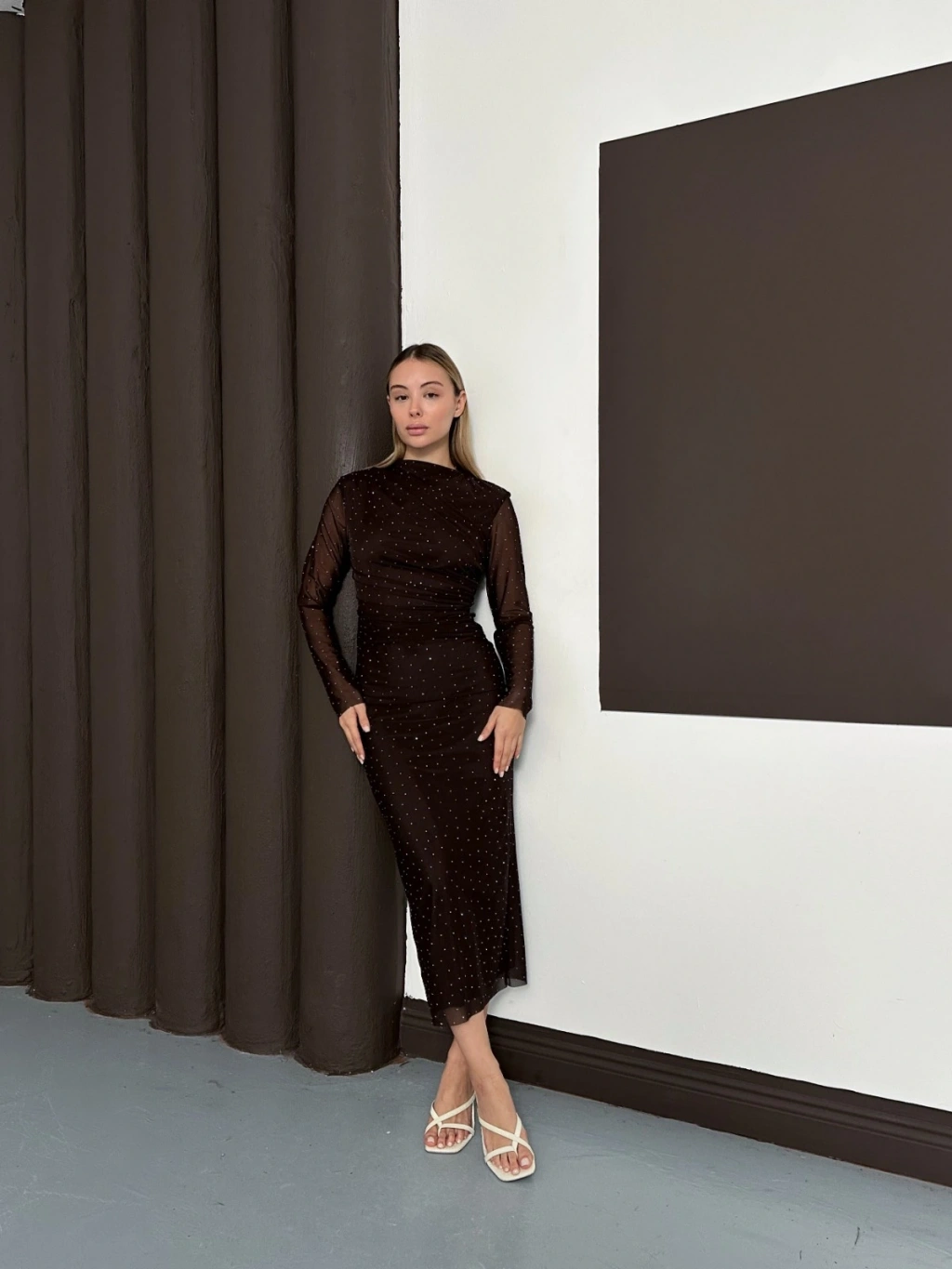 Taş Detaylı Kollar Transparan Elbise Acı Kahve