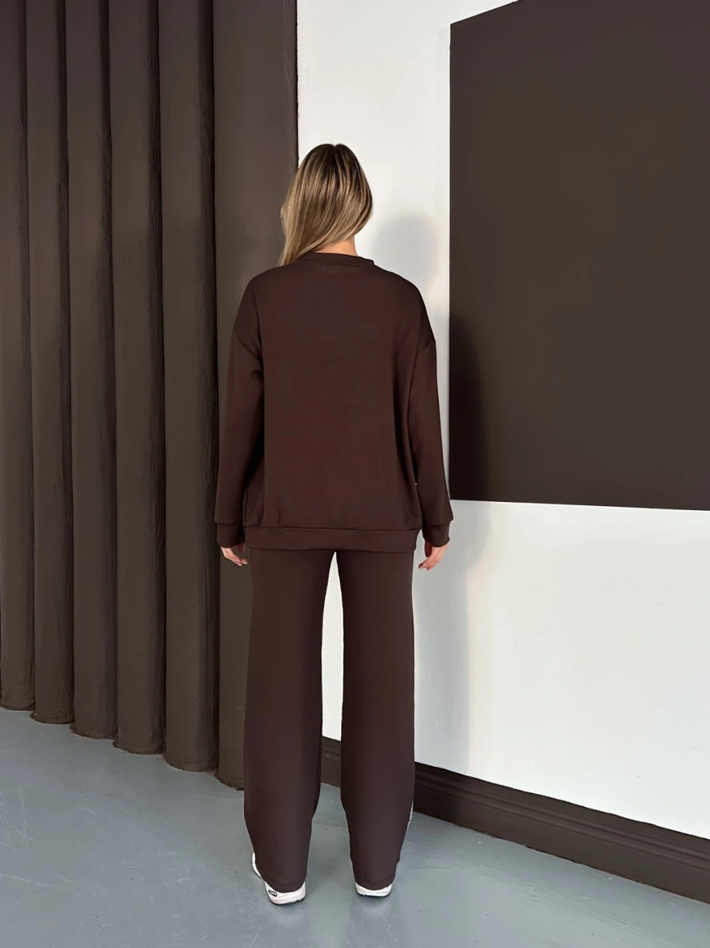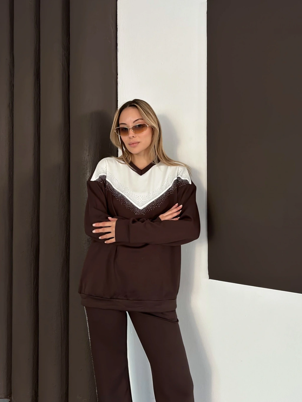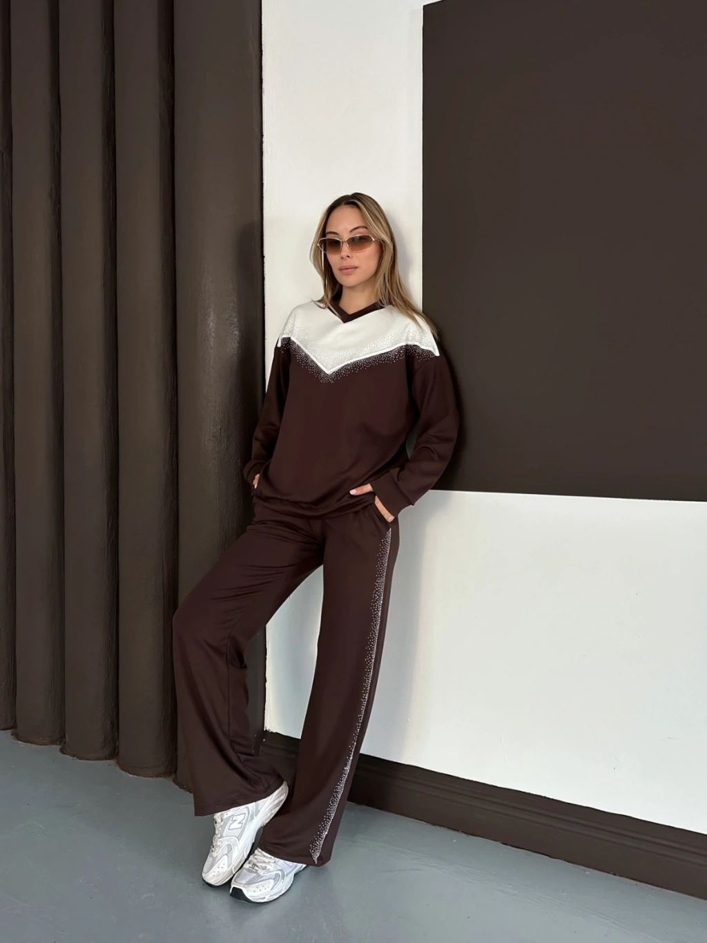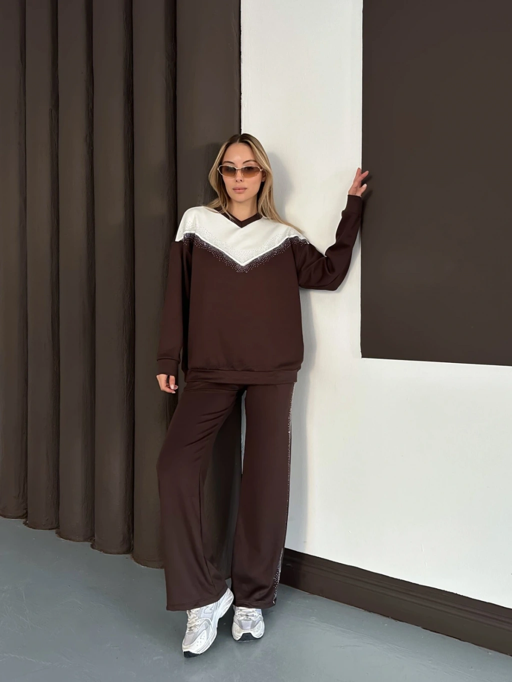 Taş Detaylı V Yaka Pantolonlu Takım Kahverengi