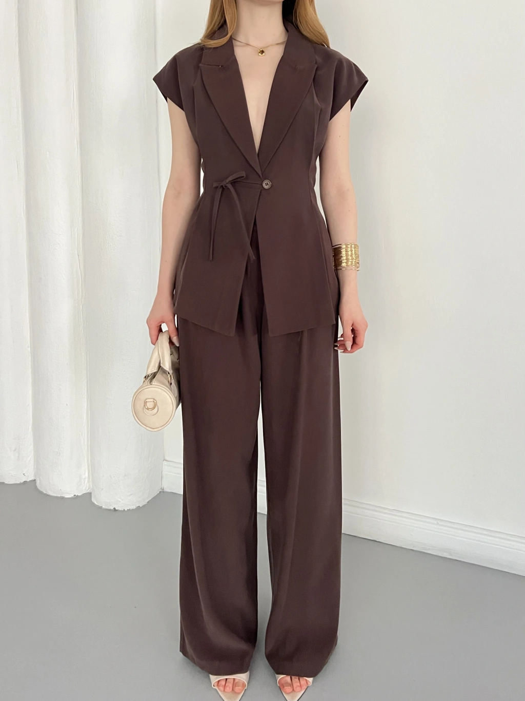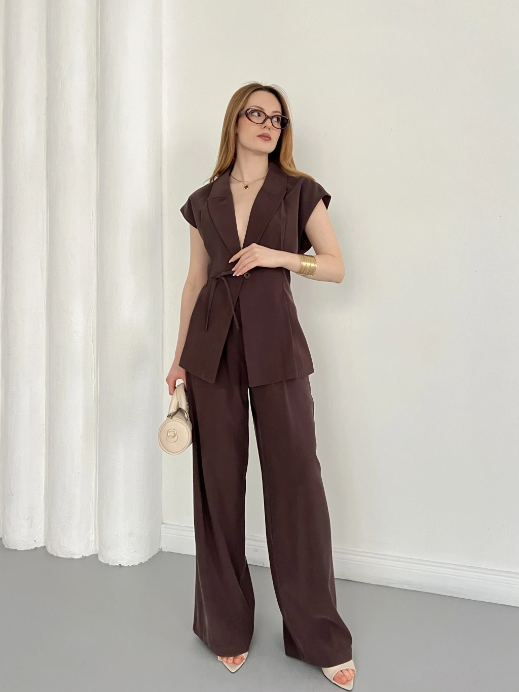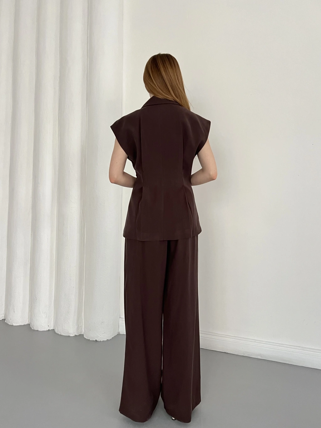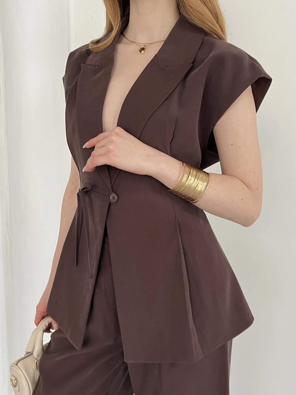 Gold Düğme Detaylı Tasarım Yelekli Takım Kahve