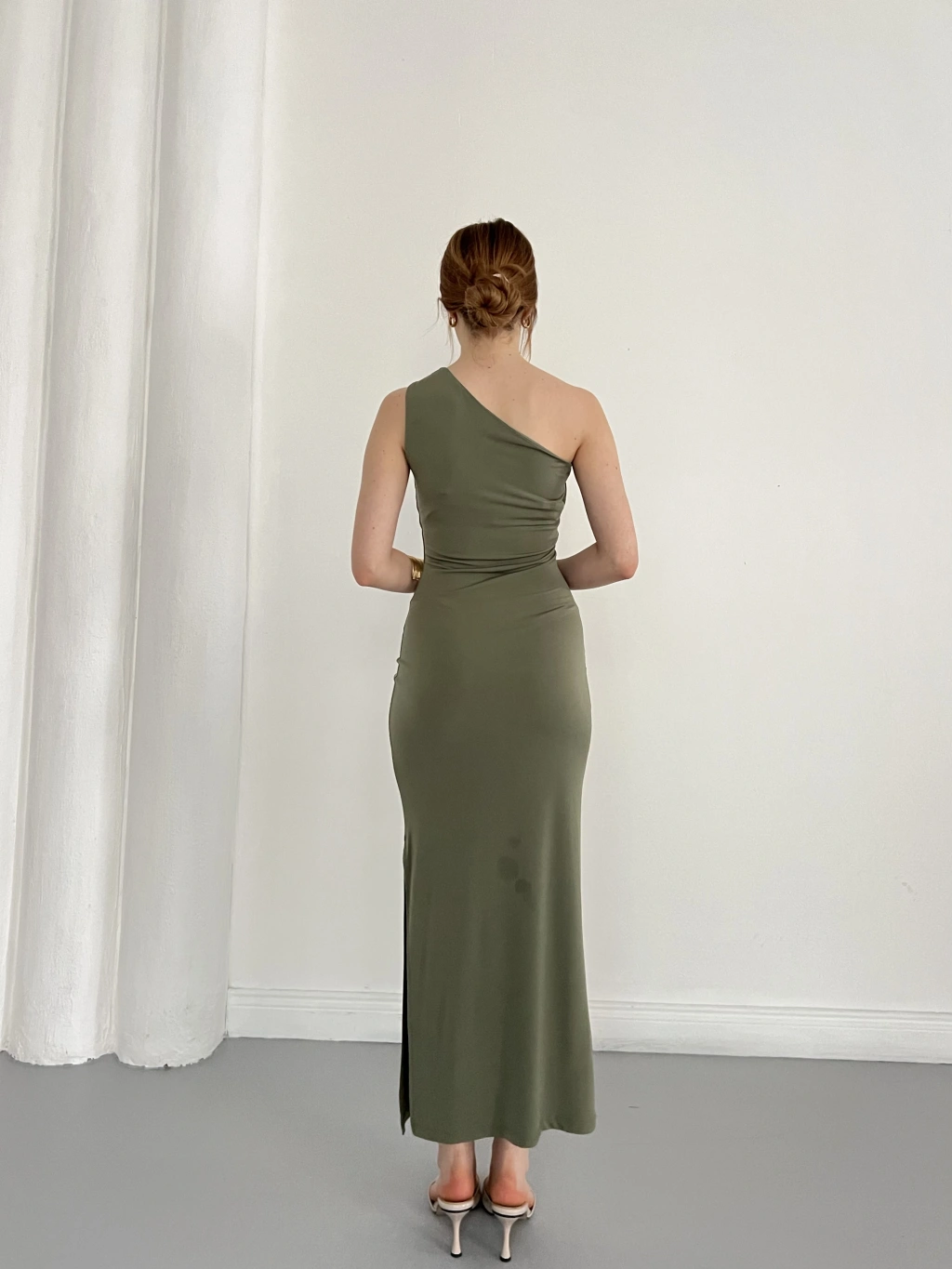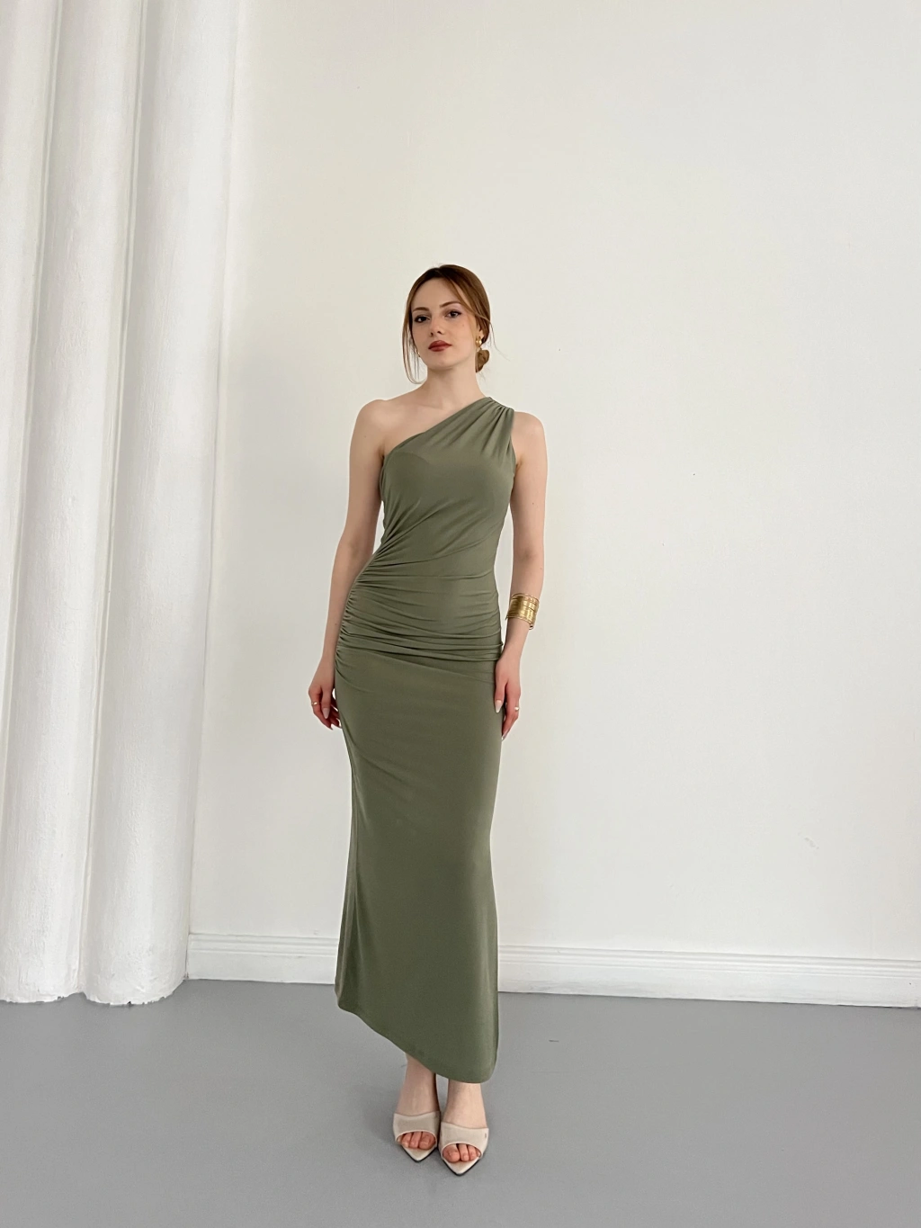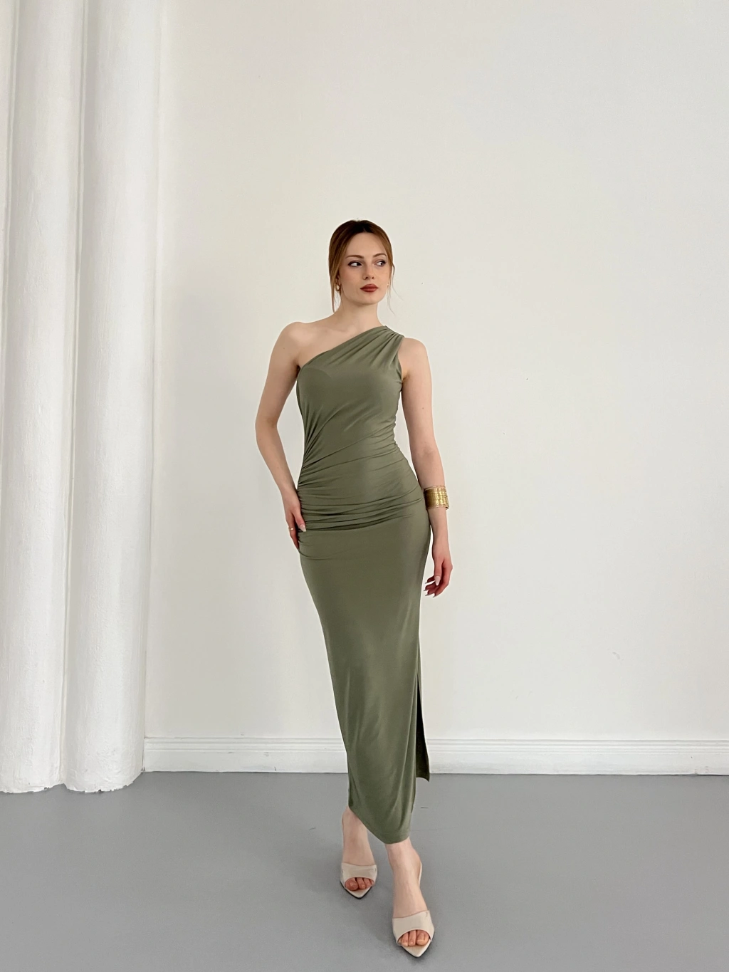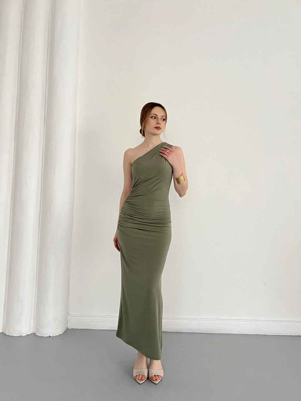 Tek Omuz Büzgü Detaylı Yırmaçlı Sandy Elbise Haki