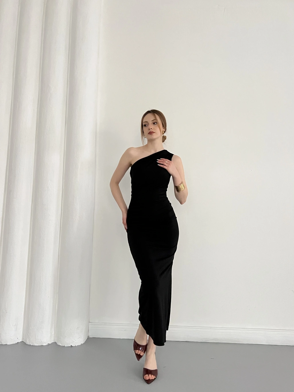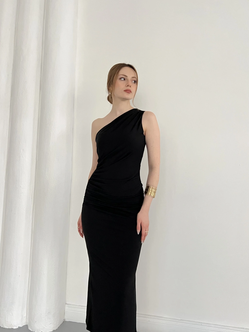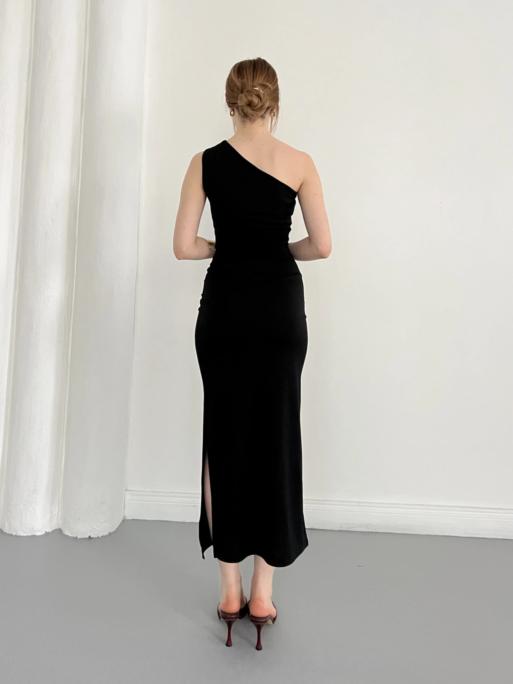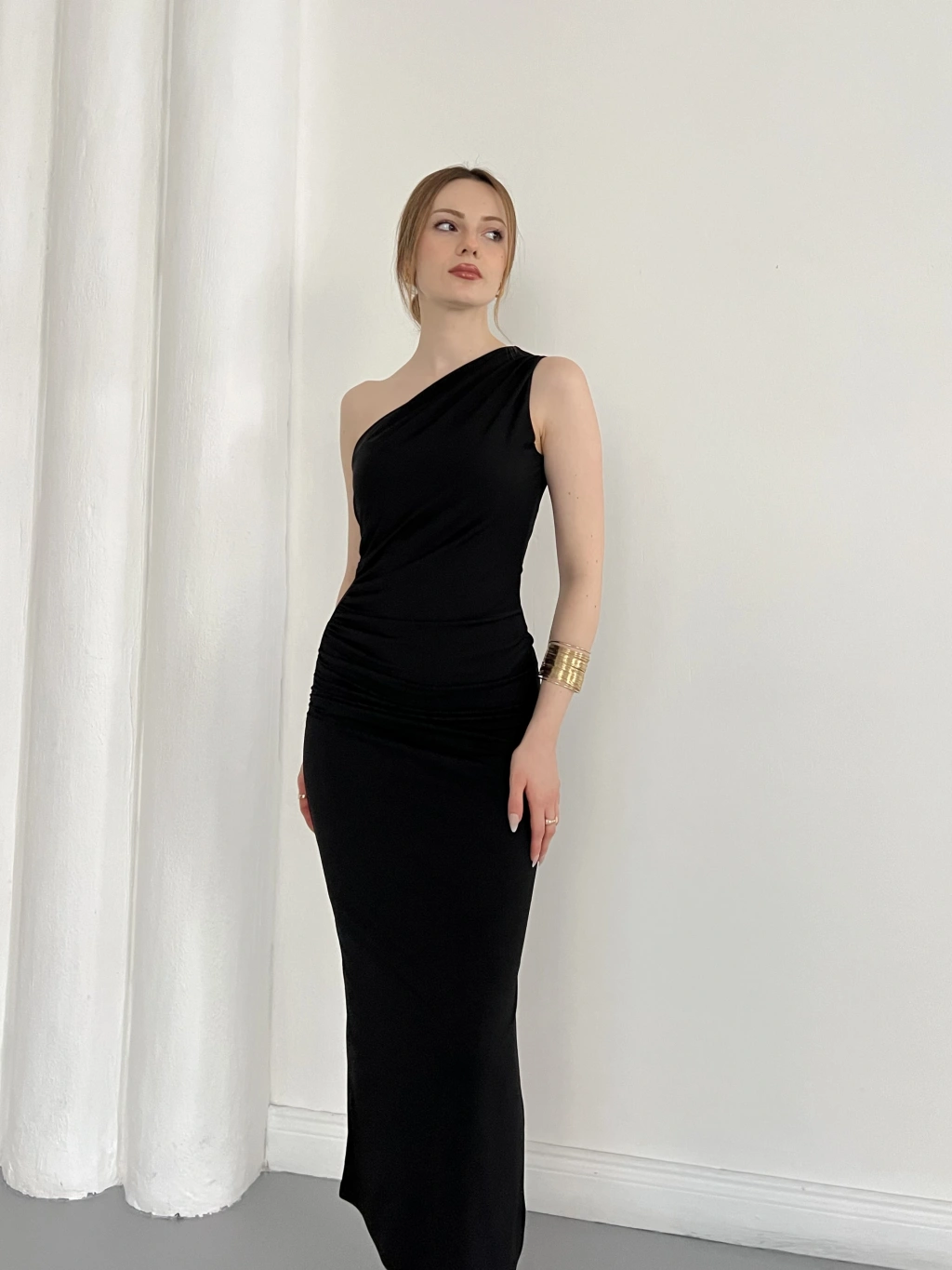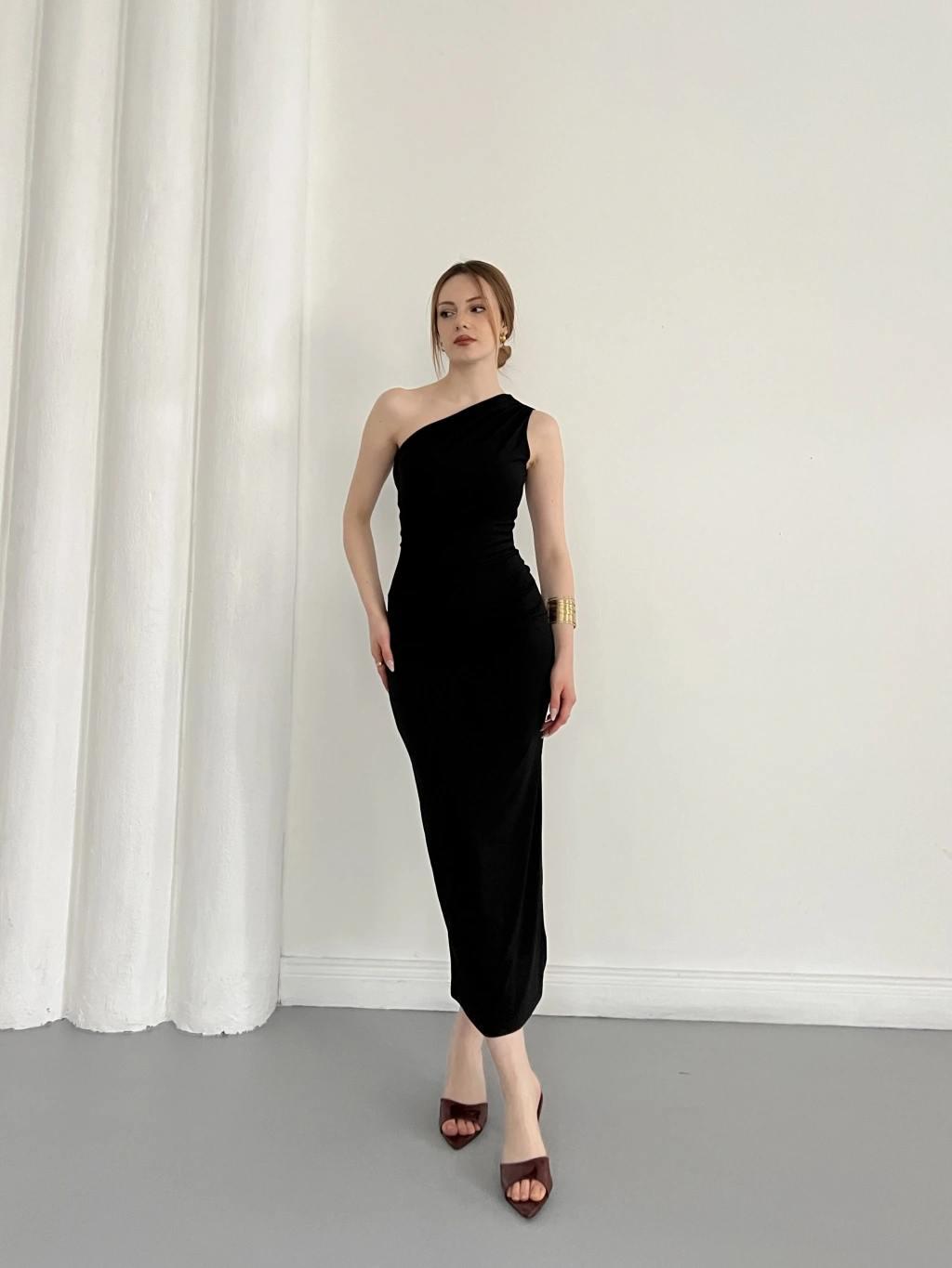 Tek Omuz Büzgü Detaylı Yırmaçlı Sandy Elbise Siyah