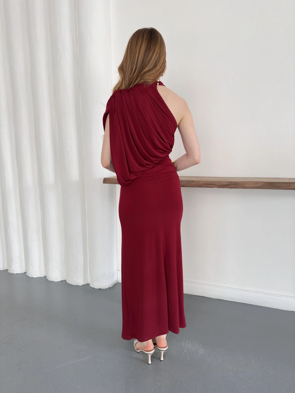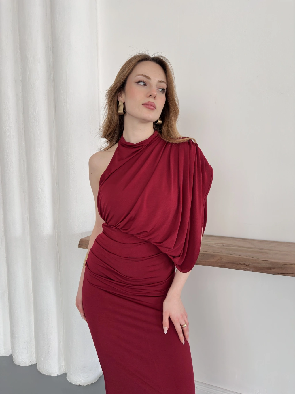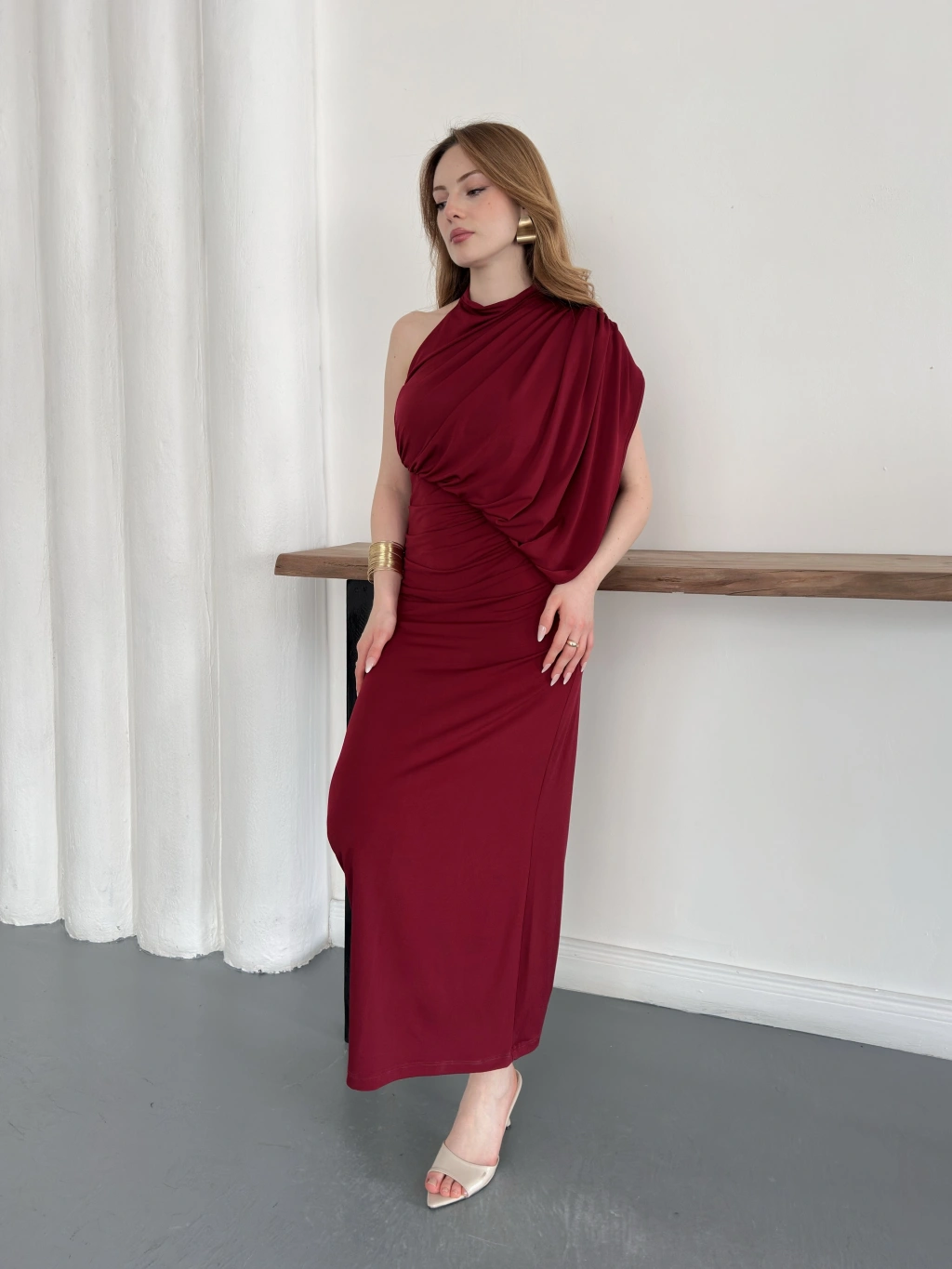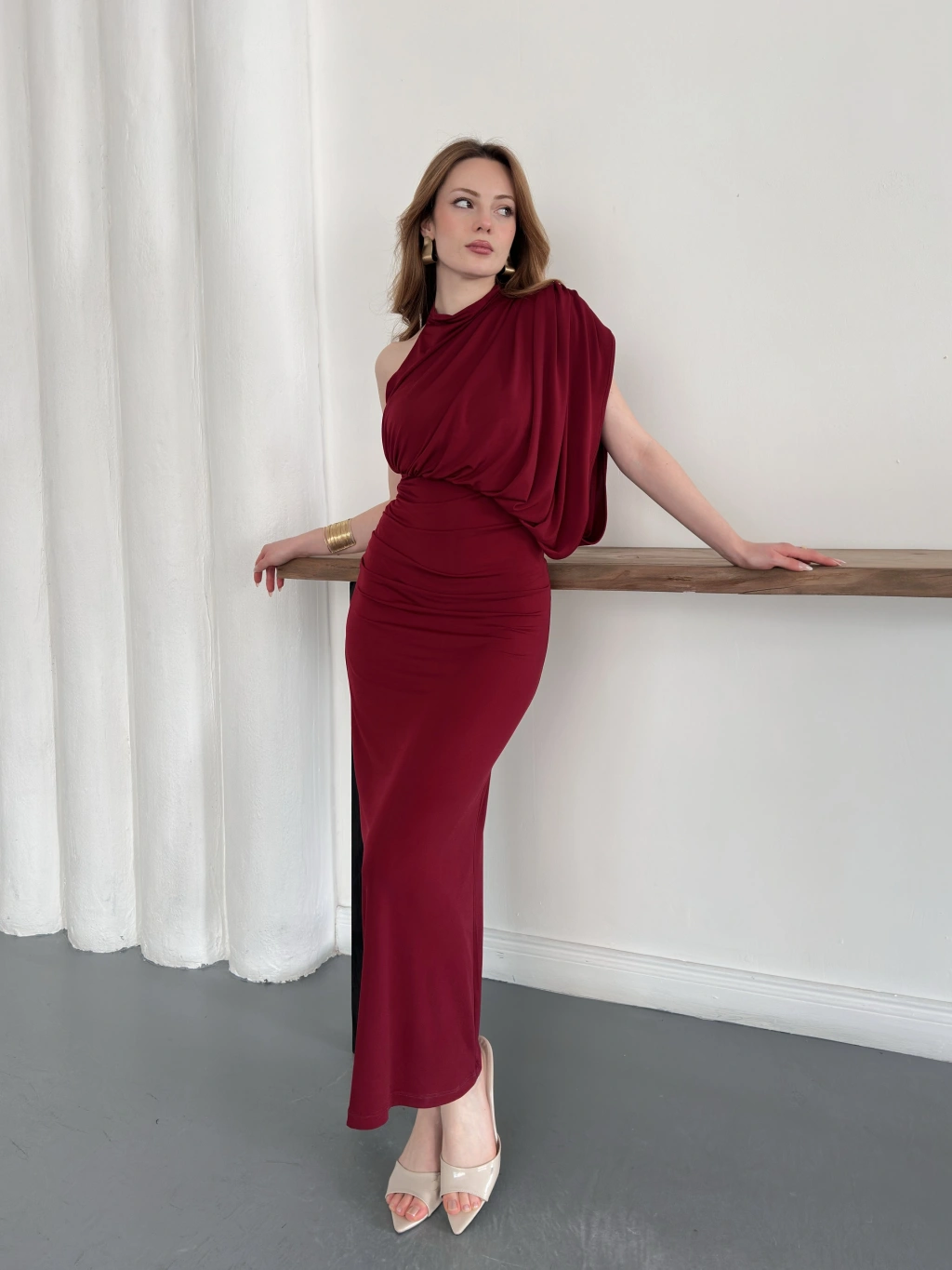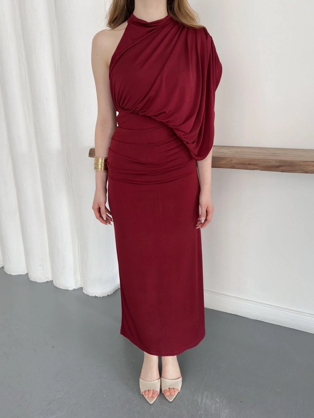 Tek Omuz Kol Detaylı Büzgü Elbise Bordo