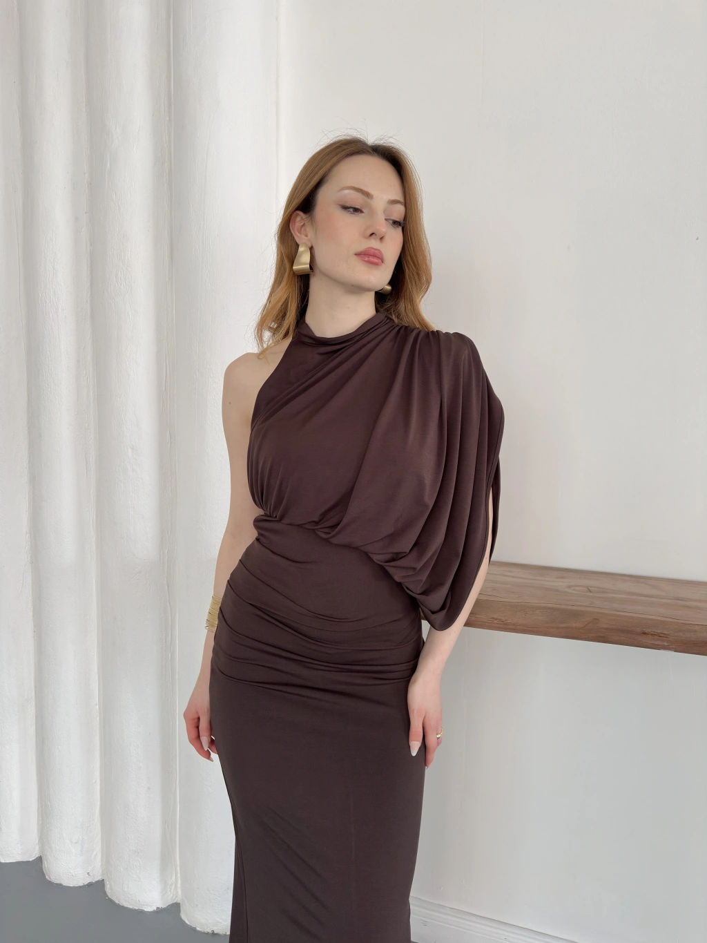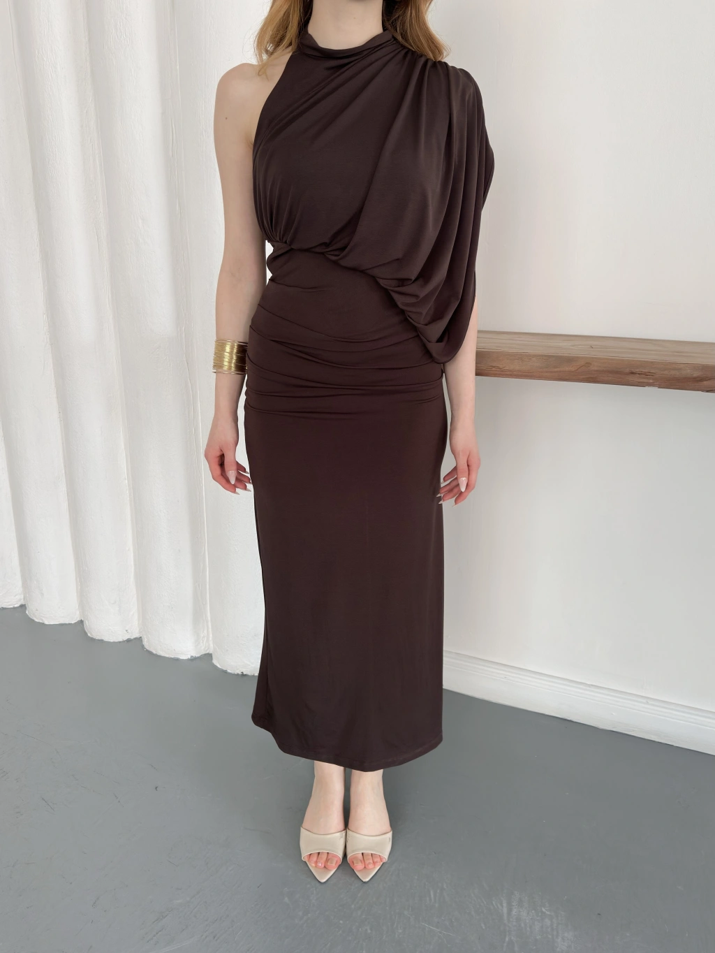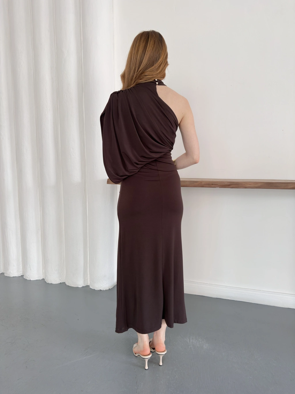 Tek Omuz Kol Detaylı Büzgü Elbise Kahve