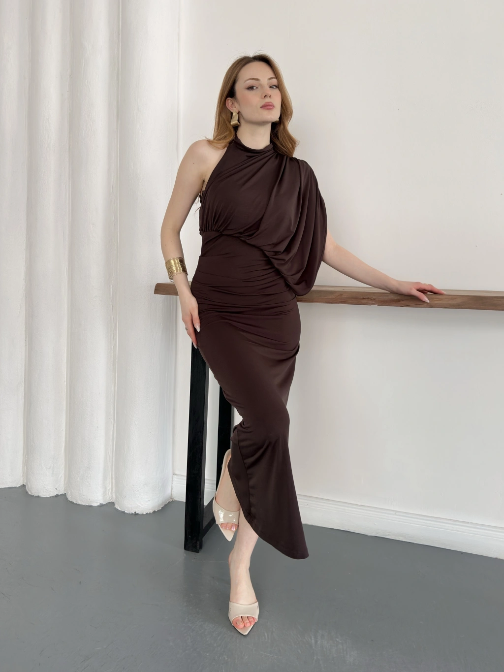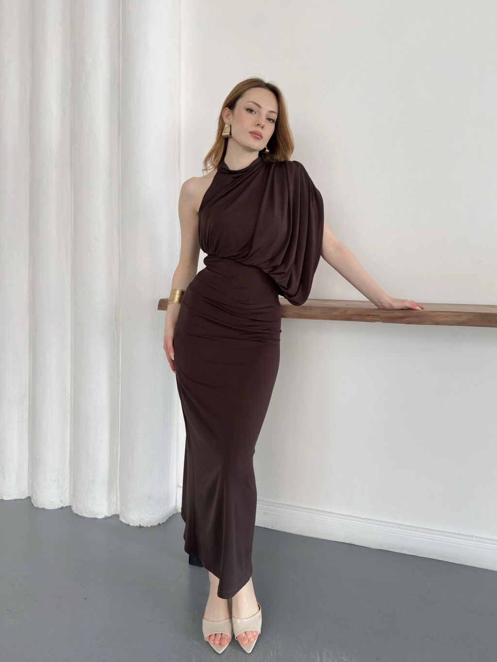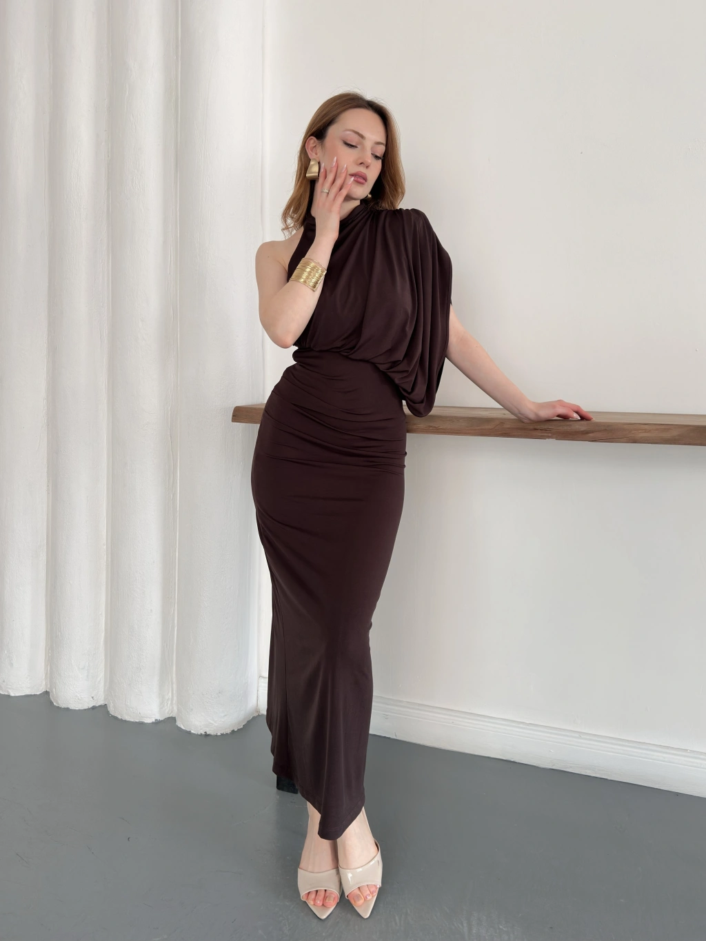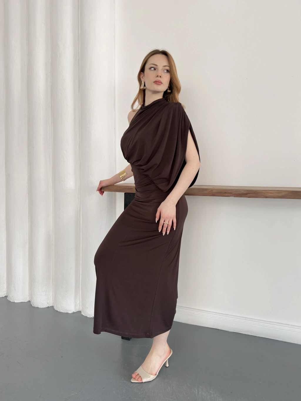 Tek Omuz Kol Detaylı Büzgü Elbise Kahve