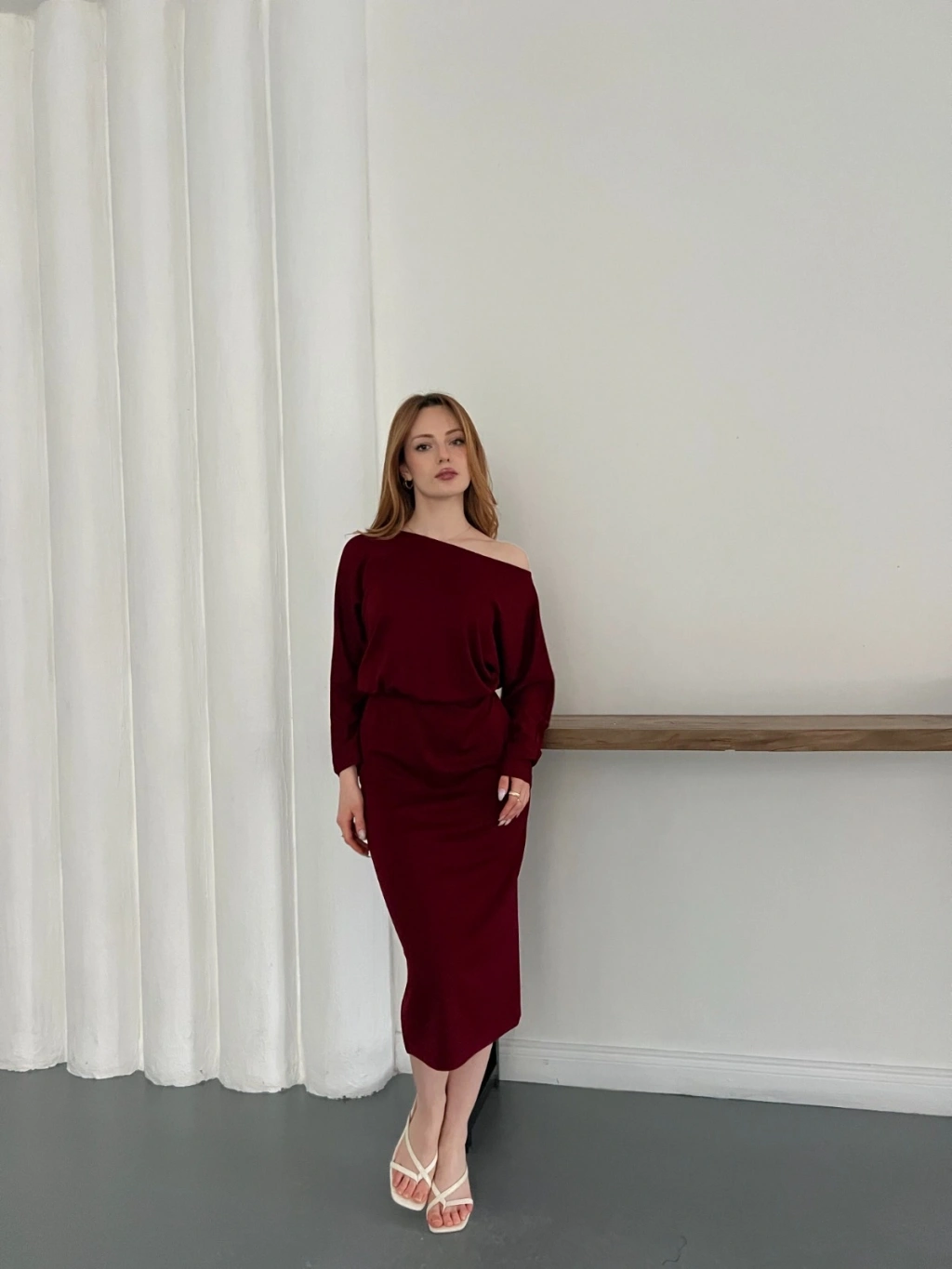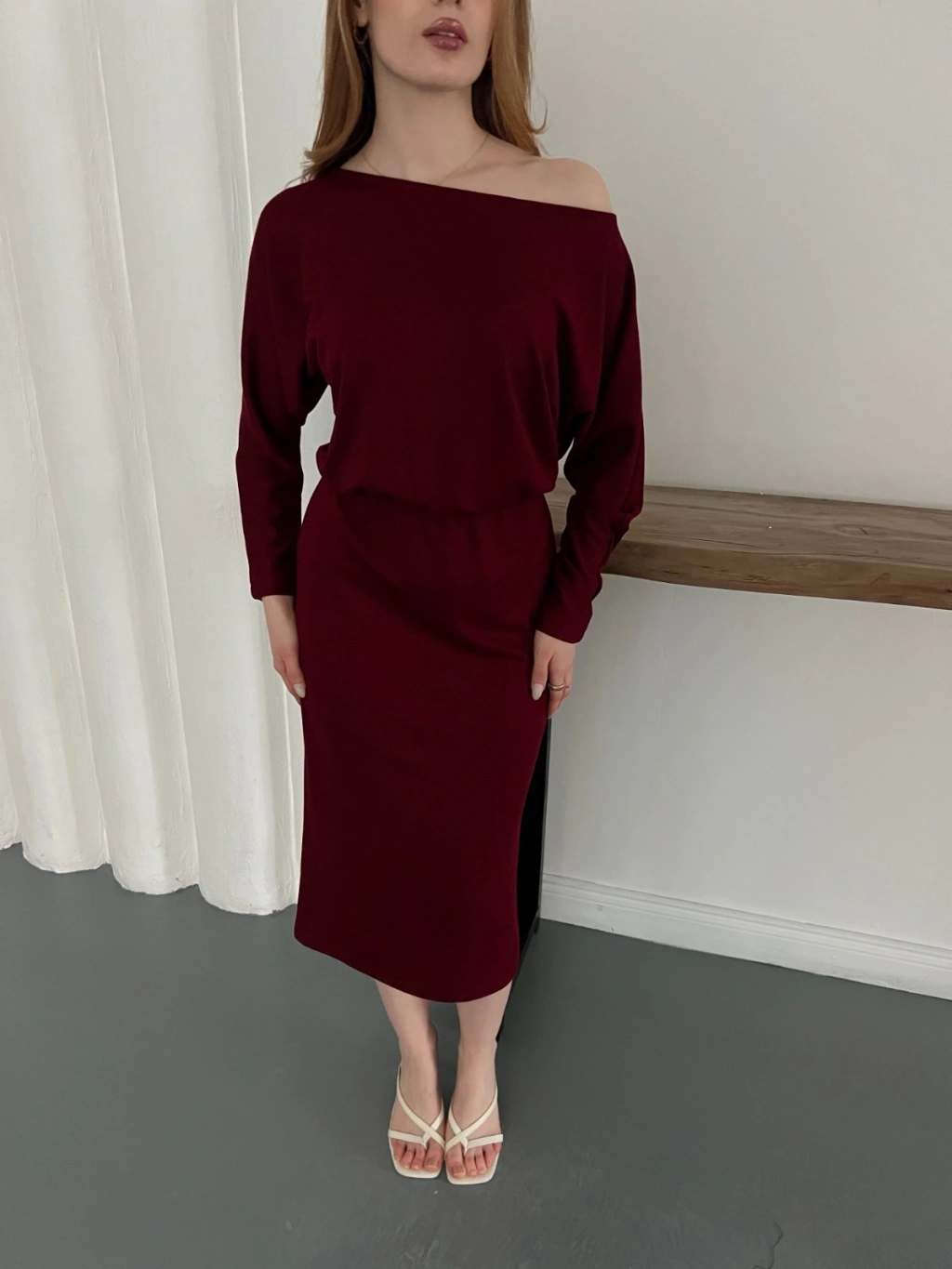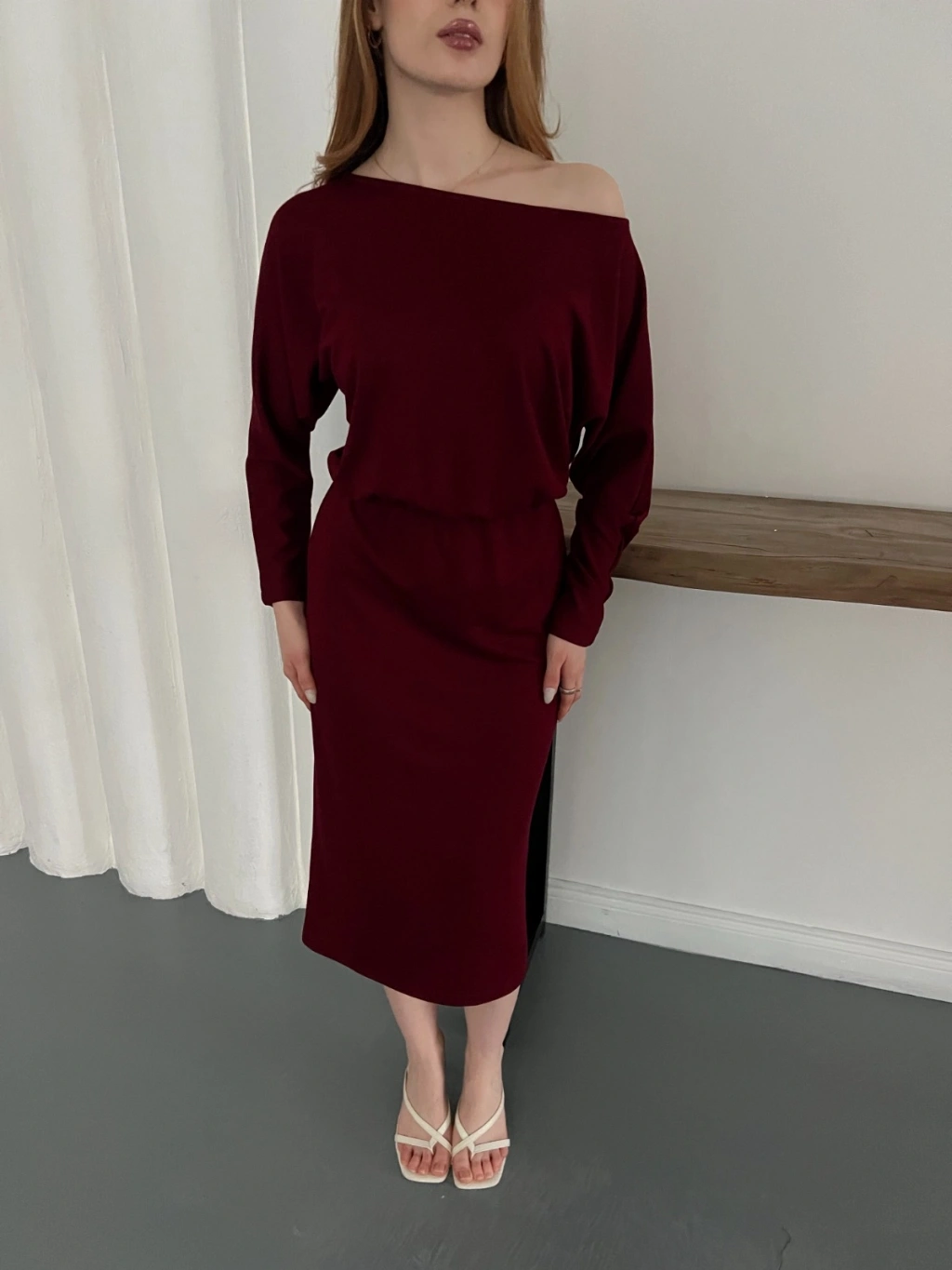 Tek Omuz Yarasa Kol Uzun Kol Elbise Bordo