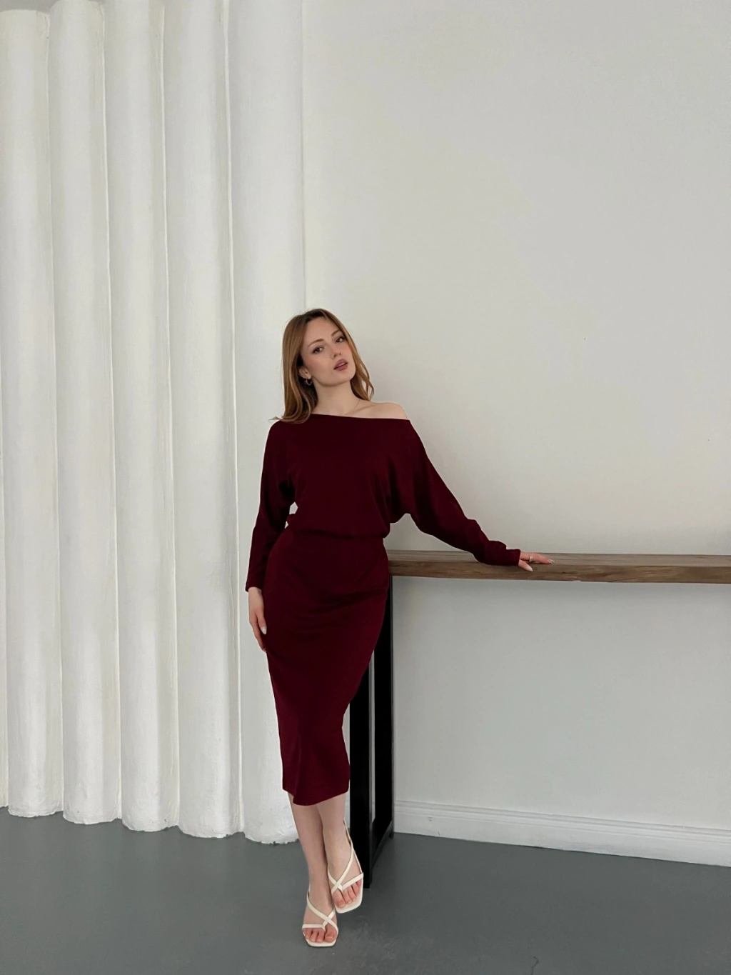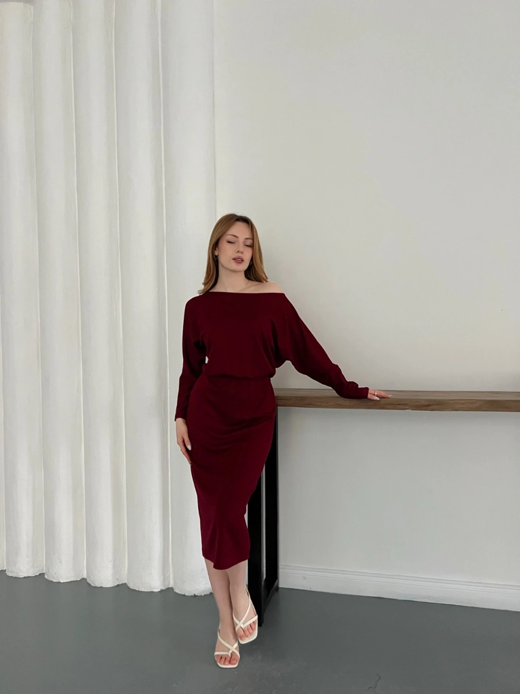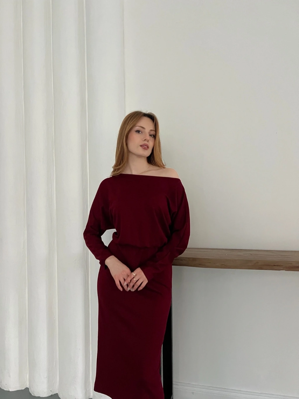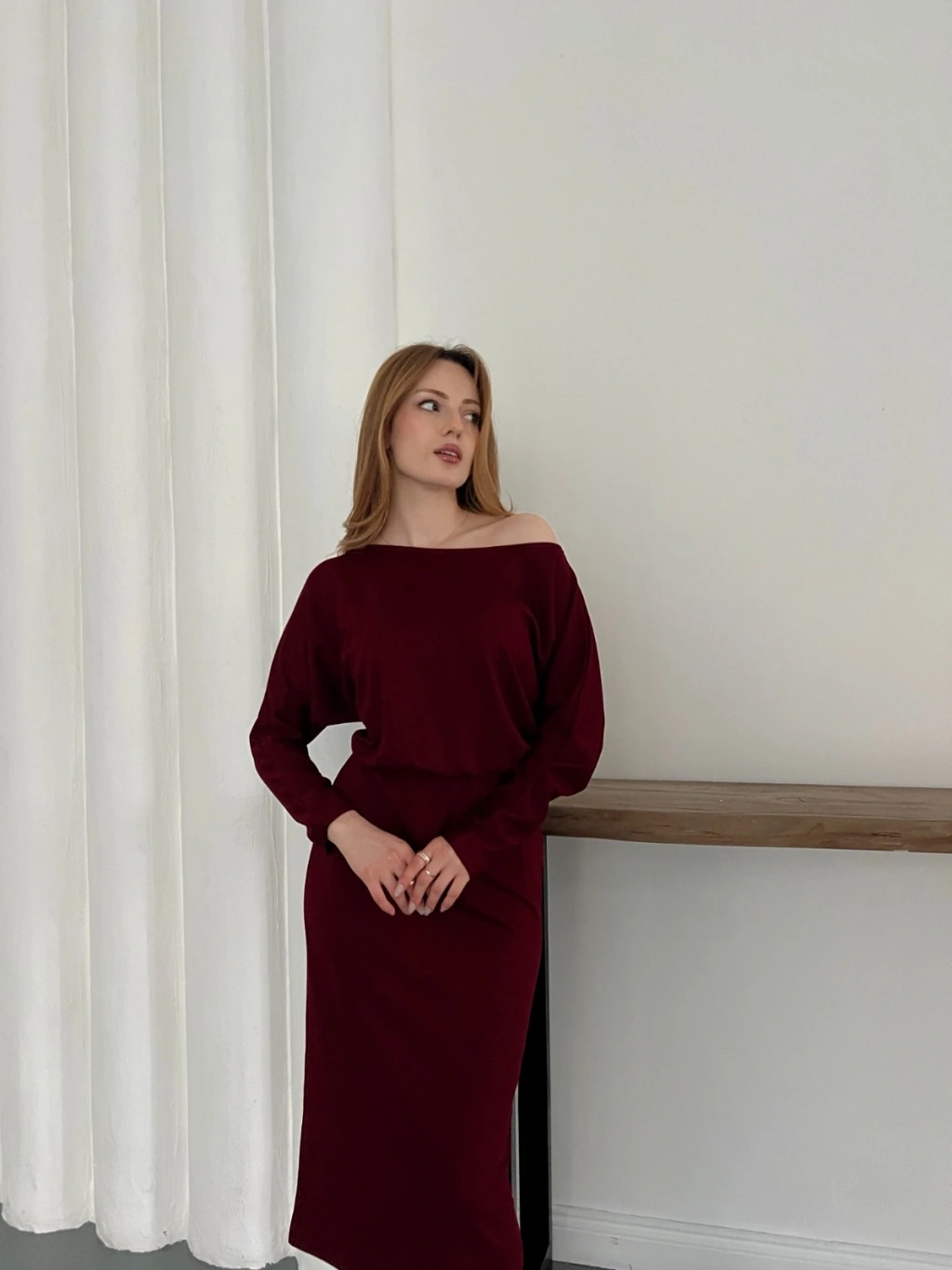 Tek Omuz Yarasa Kol Uzun Kol Elbise Bordo