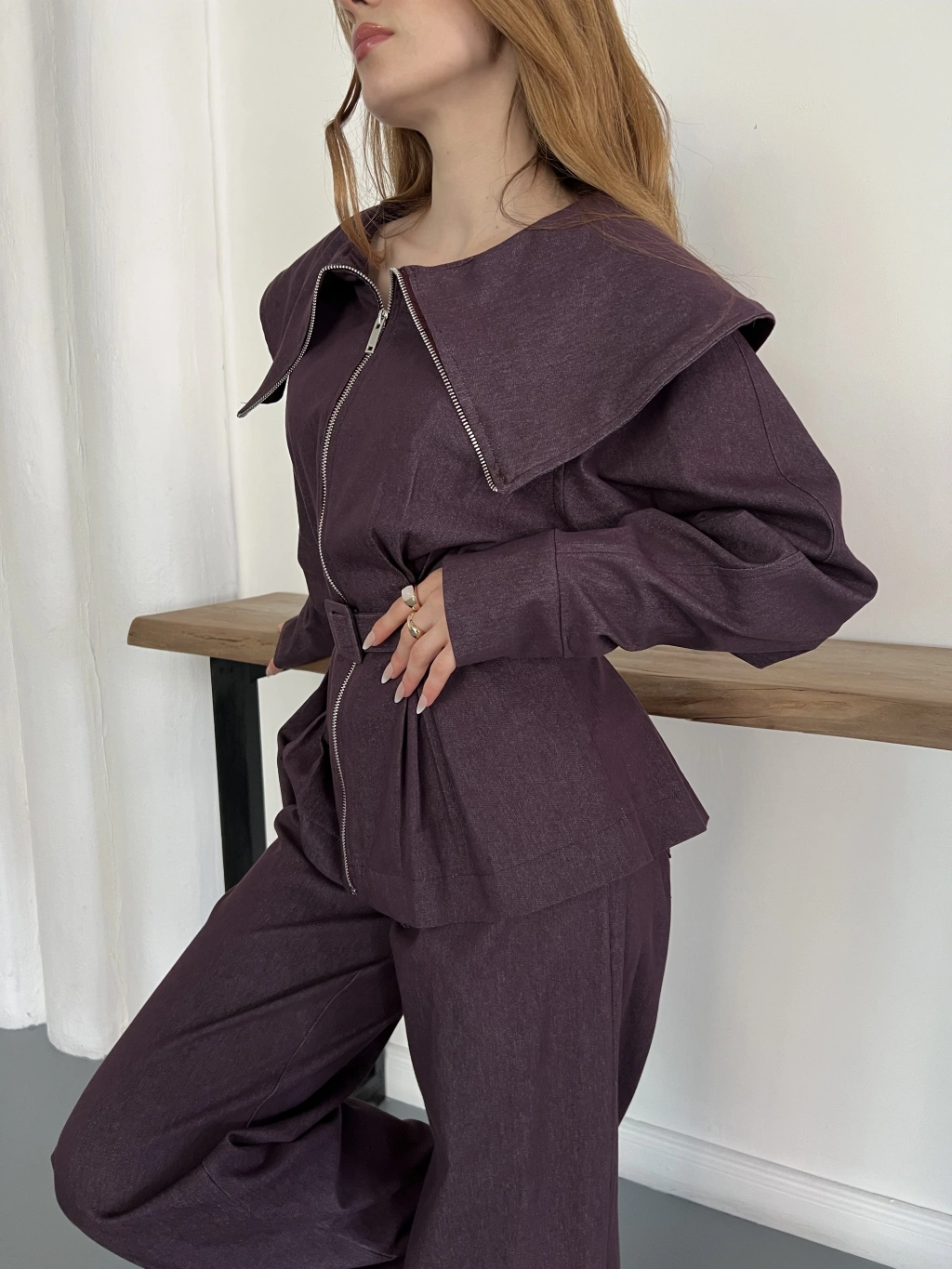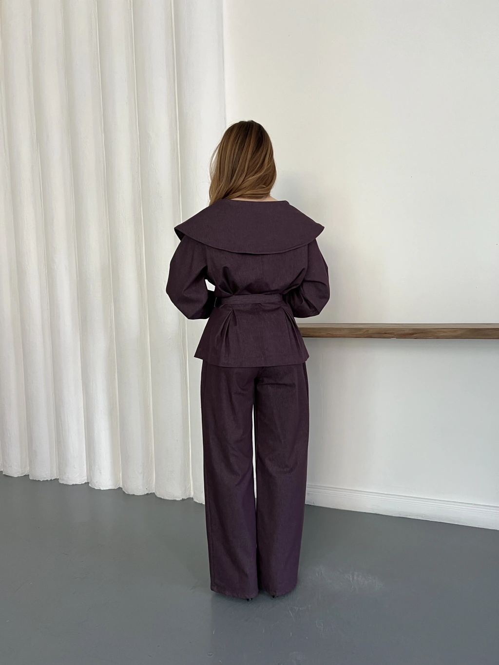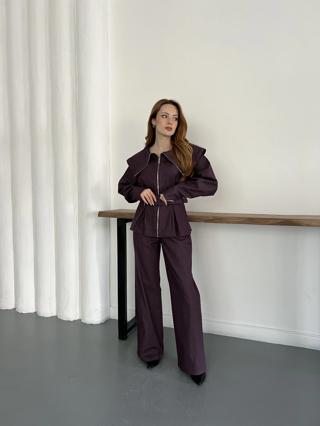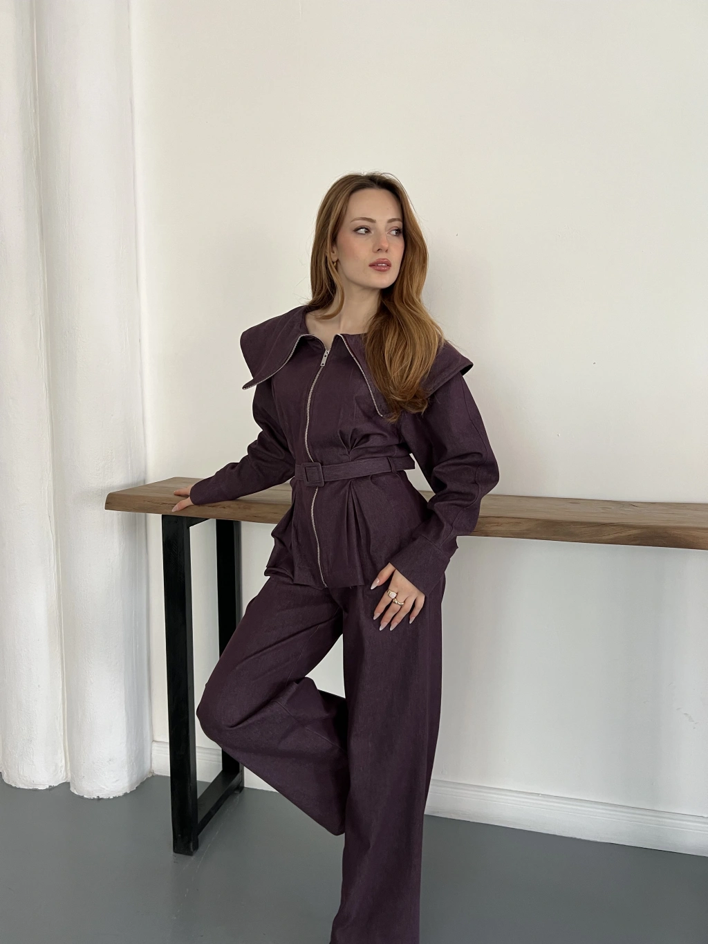 Yaka Detaylı Fermuarlı Tasarım Denim Takım Bordo