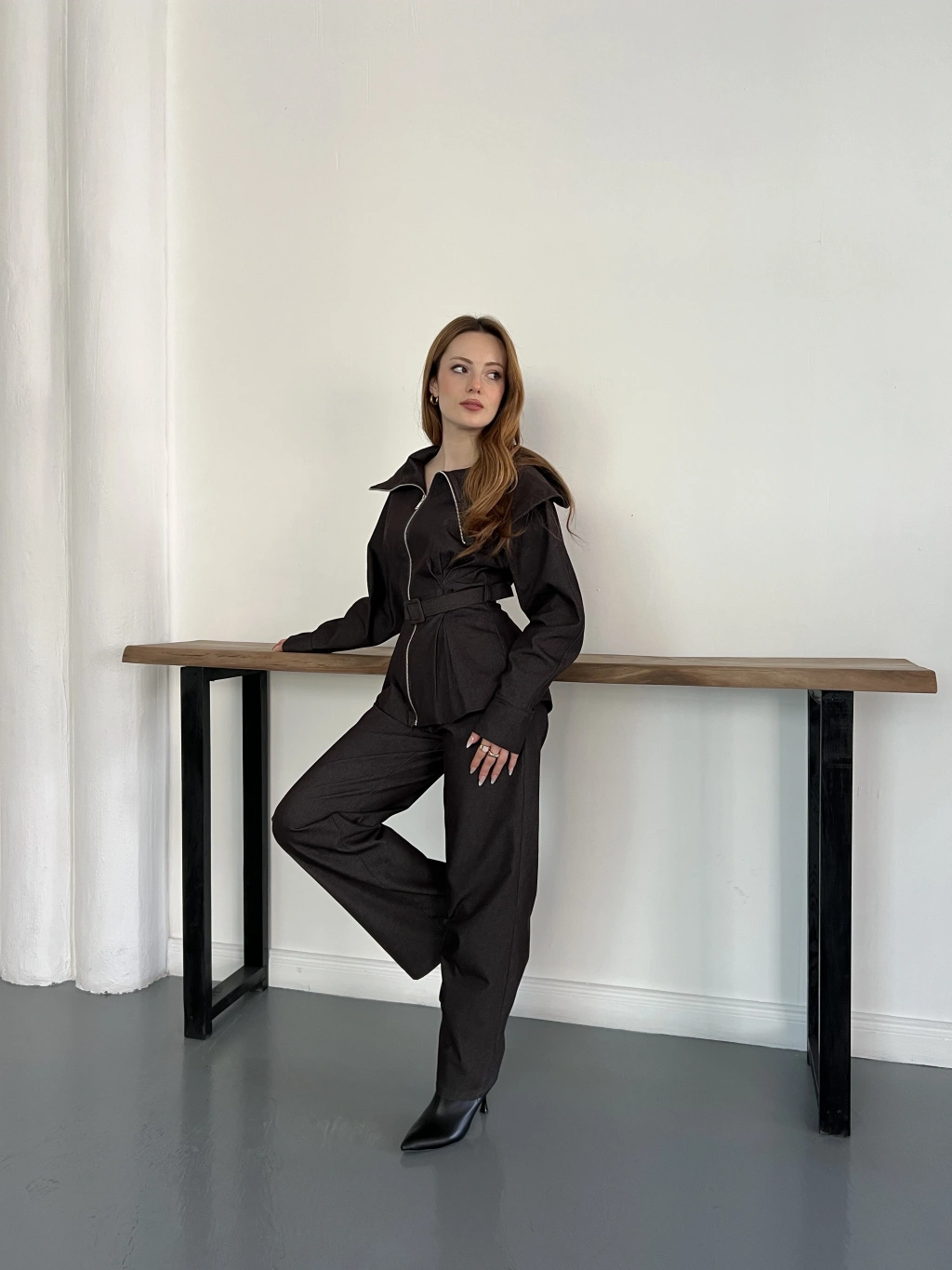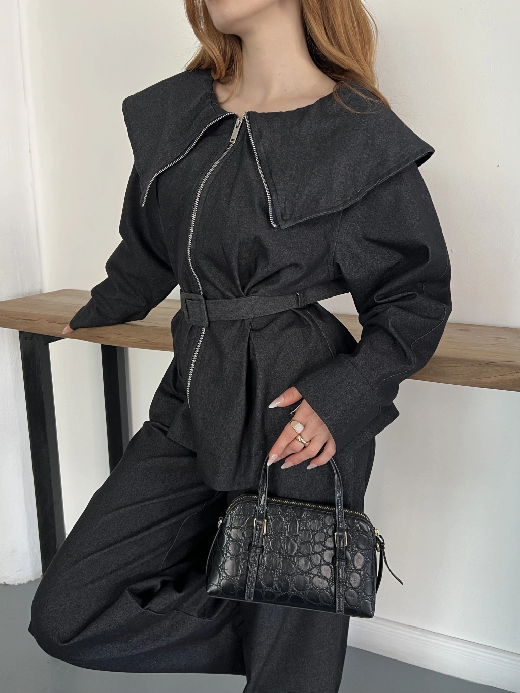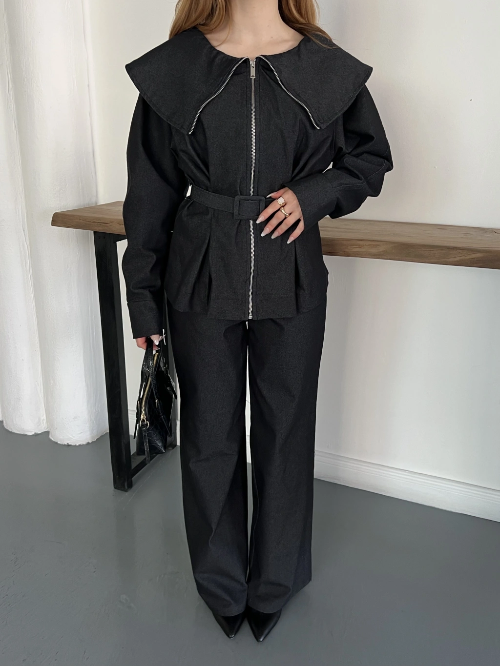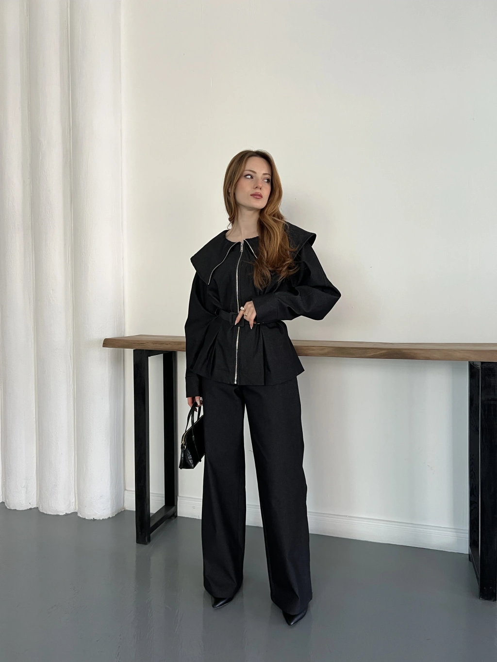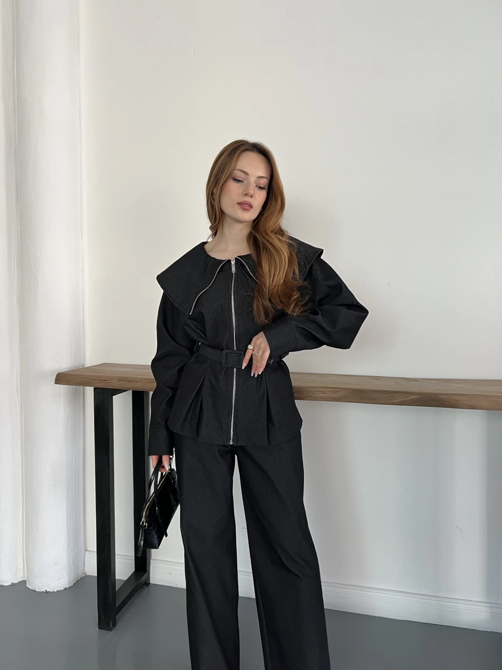 Yaka Detaylı Fermuarlı Tasarım Denim Takım Siyah