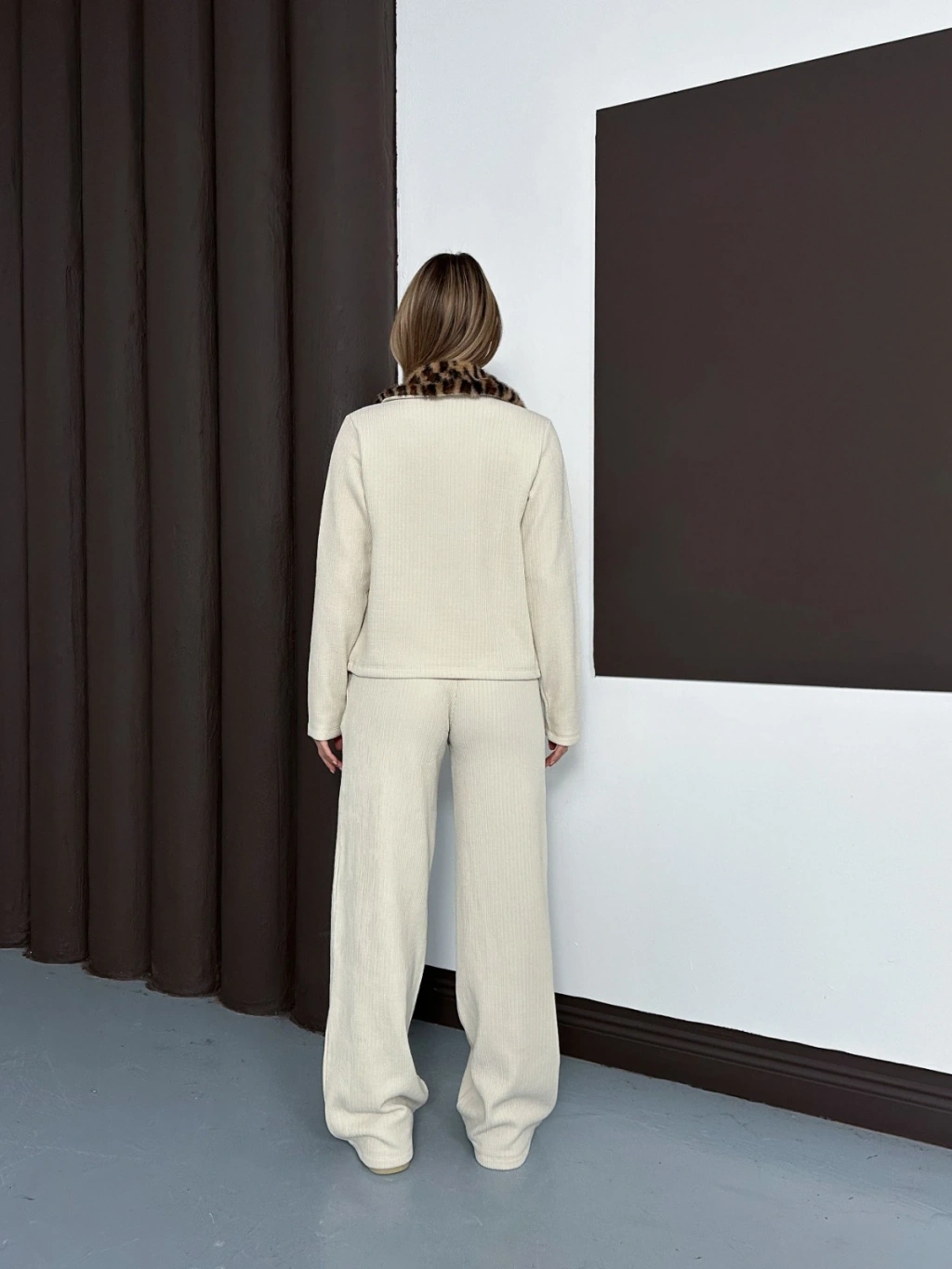Yaka Leopar Peluş Detay Modal Takım Ekru