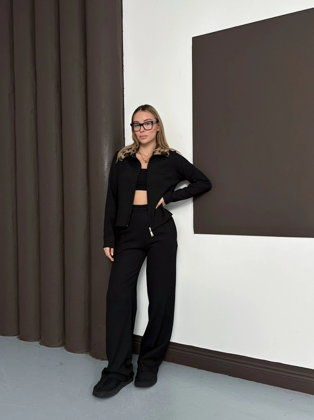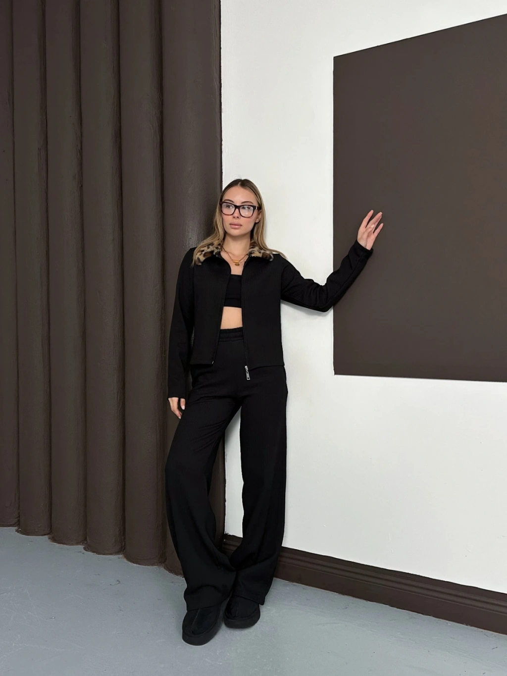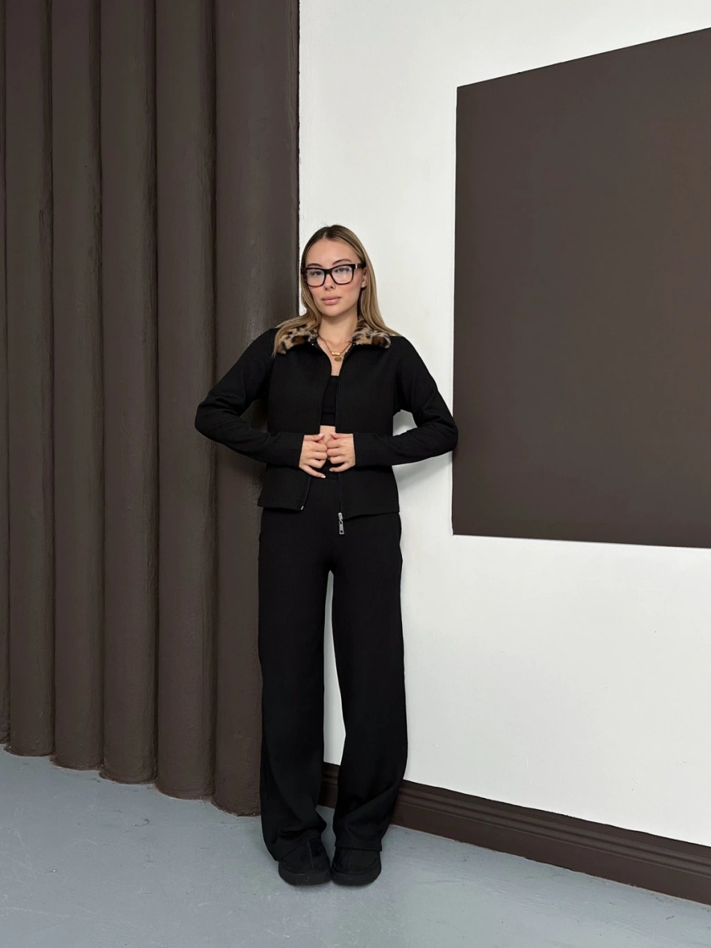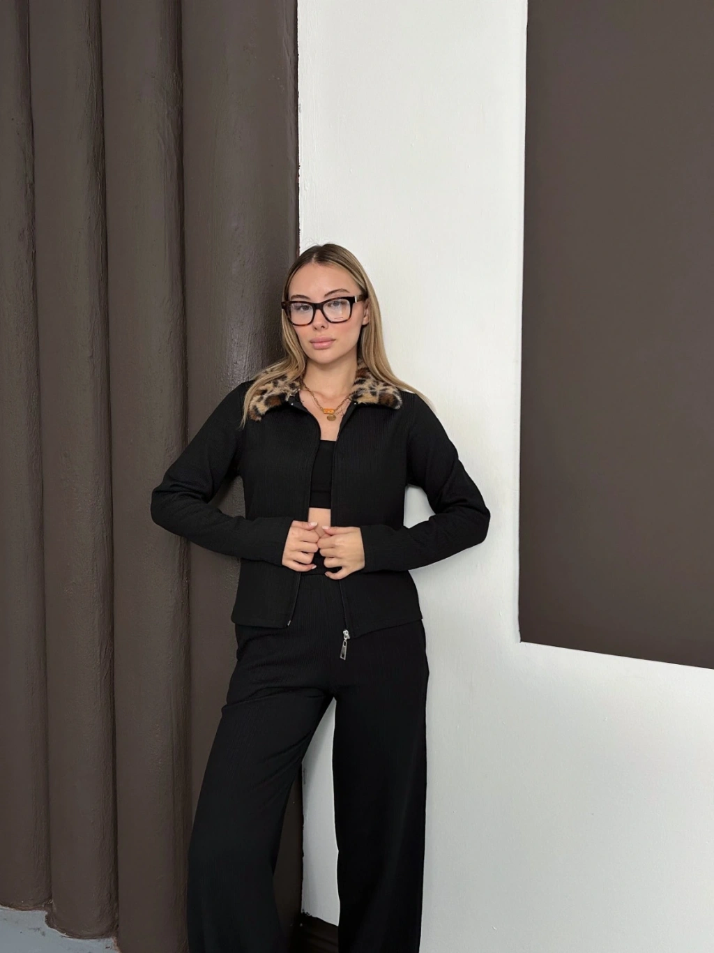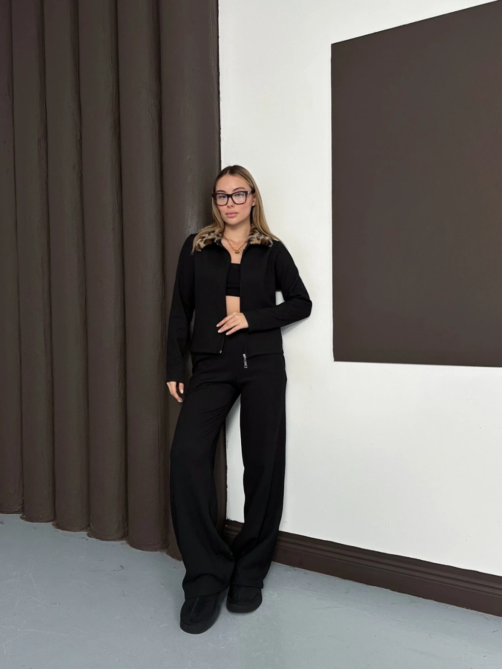 Yaka Leopar Peluş Detay Modal Takım Siyah