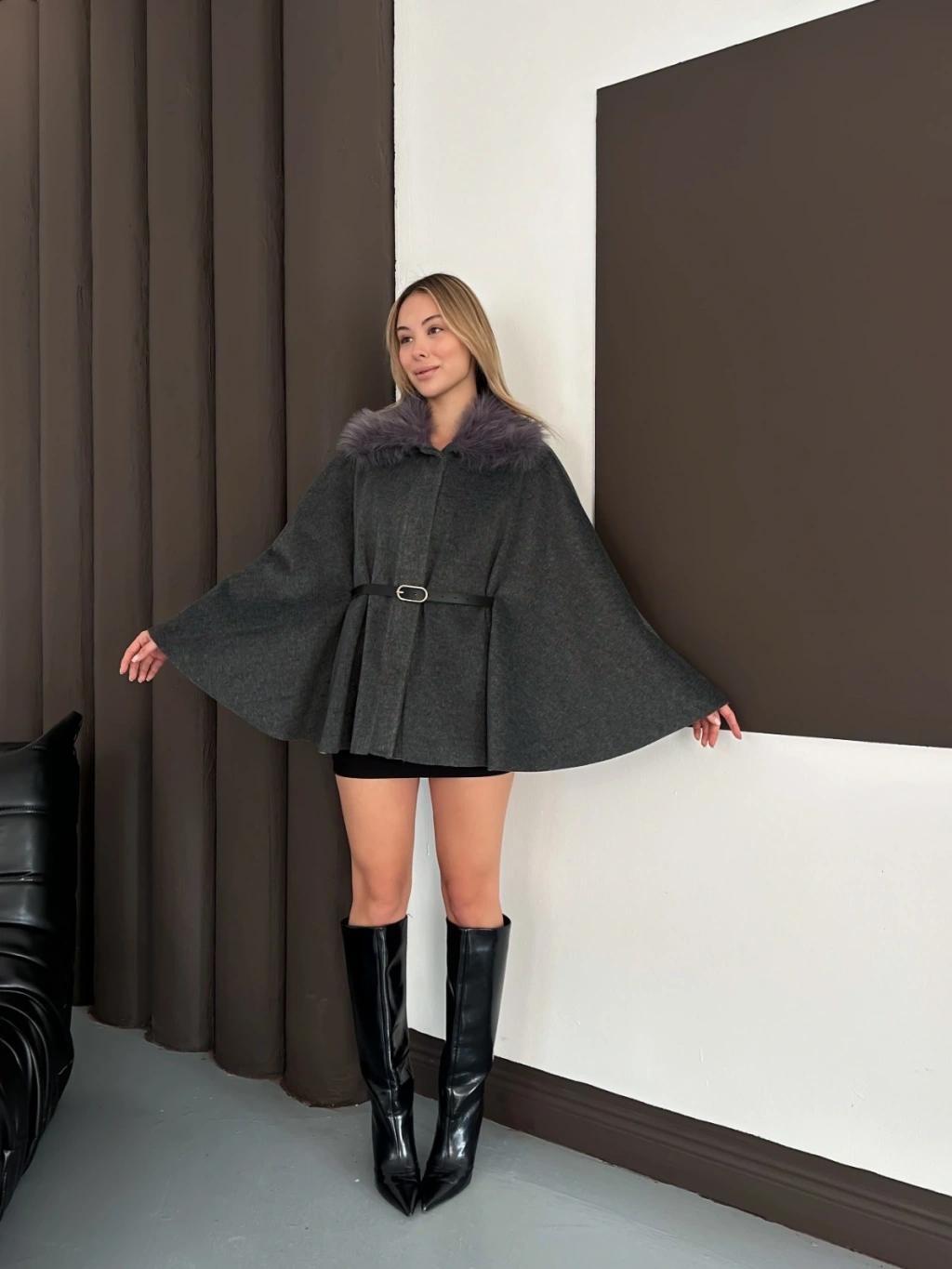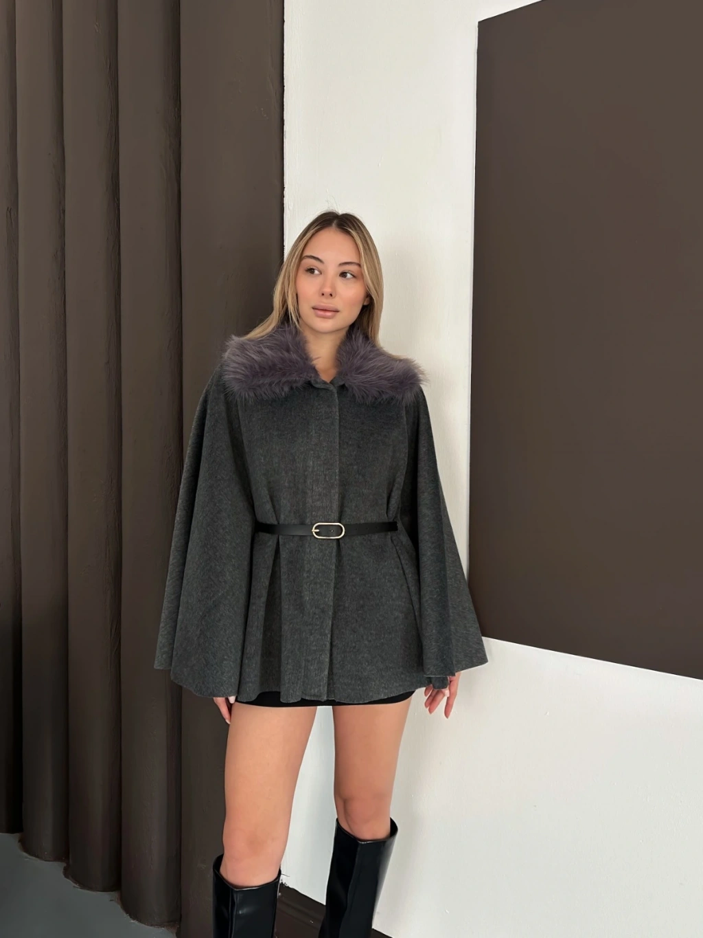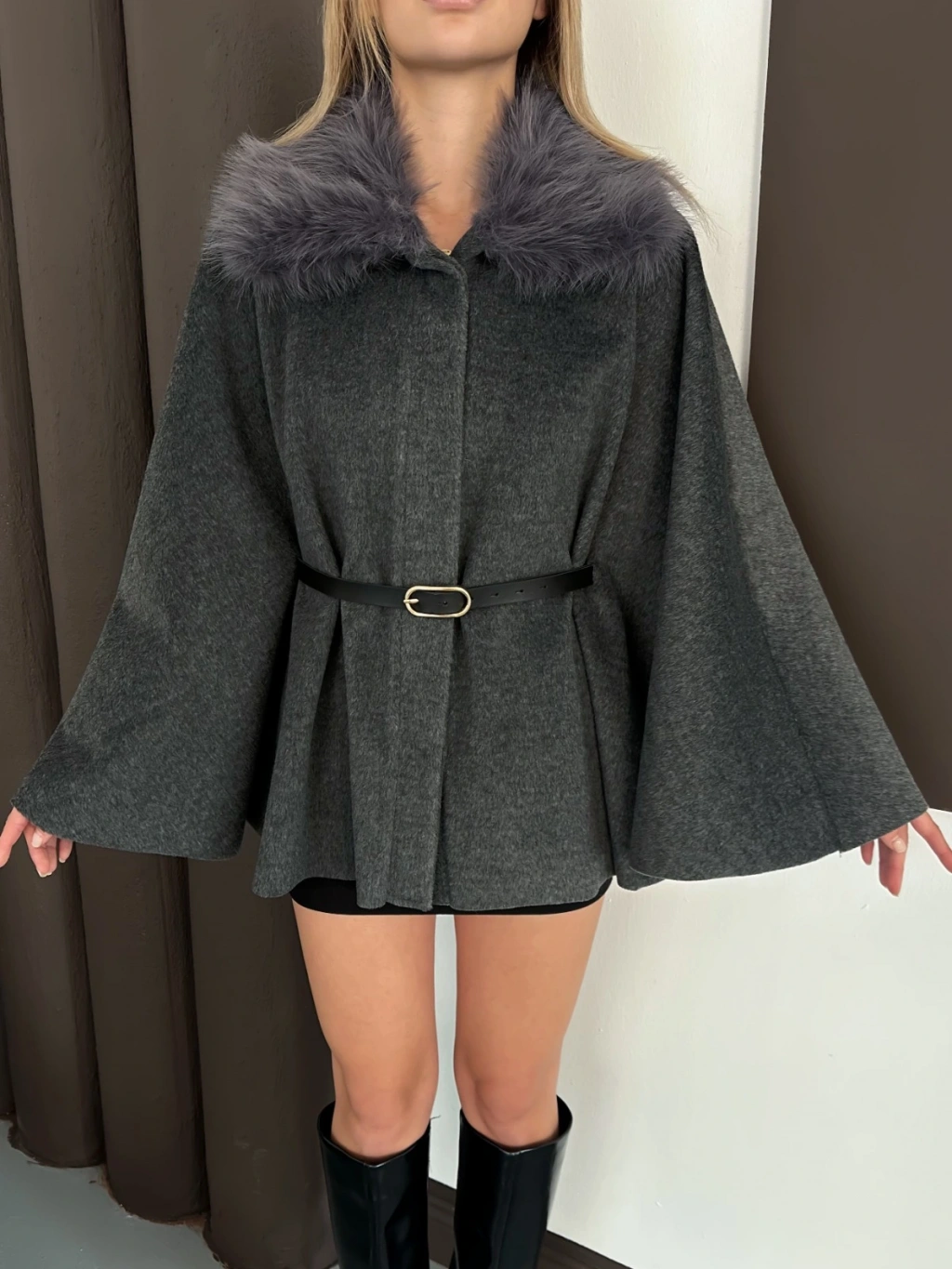 Yaka Peluş Kemerli Panço Antrasit