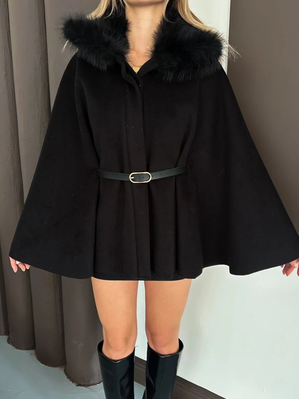 Yaka Peluş Detaylı Kuşaklı Deri Trenç Siyah