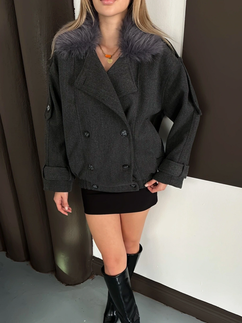Yaka Peluş Omuz Manşet Kaşe Ceket Antrasit