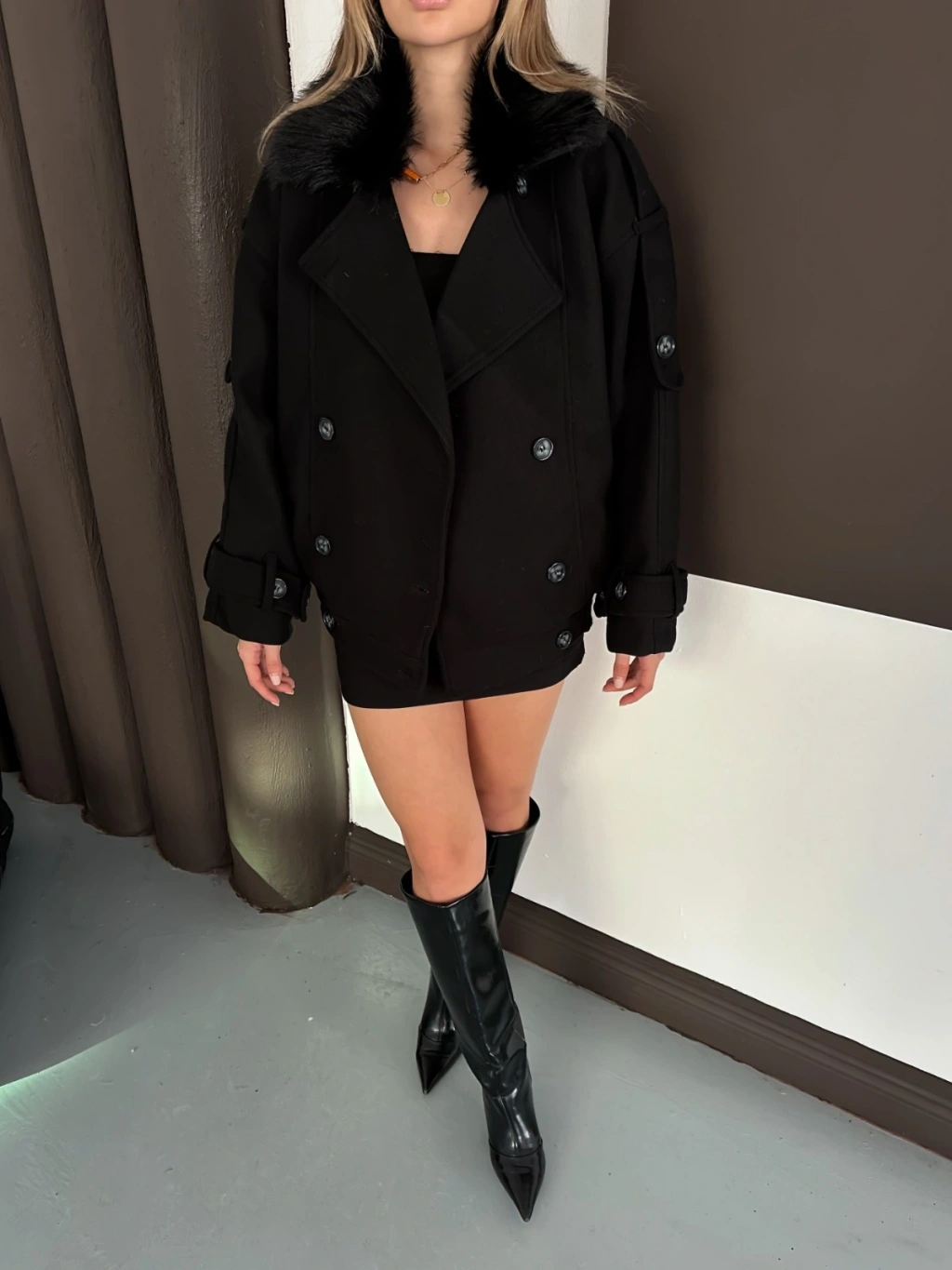 Yaka Peluş Omuz Manşet Kaşe Ceket Siyah