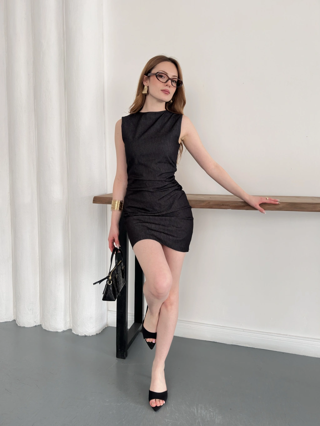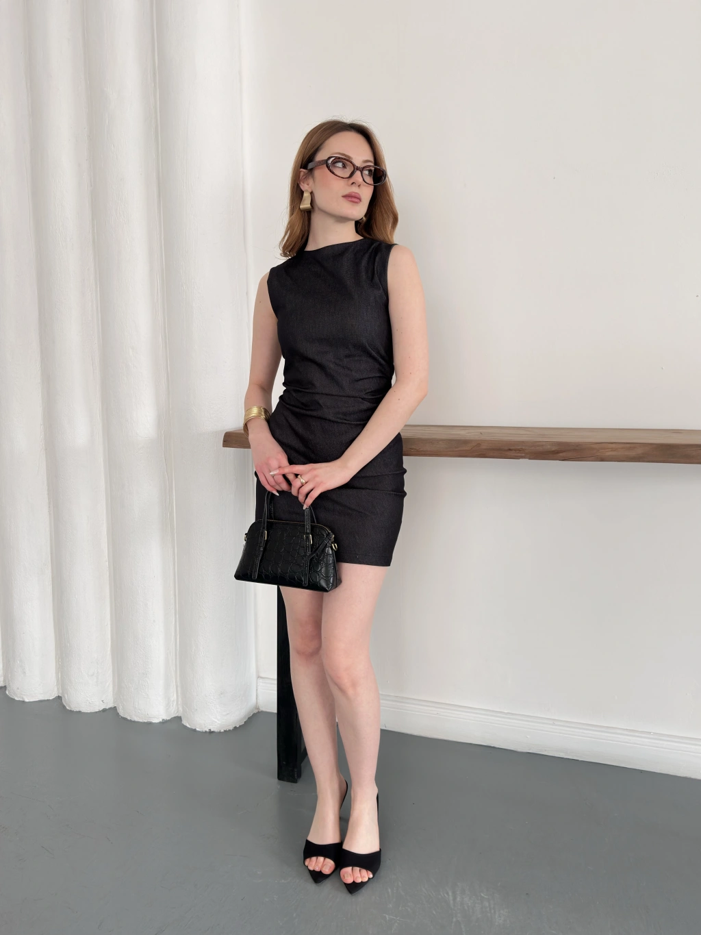 Yan Büzgü Detay Kısa Denim Elbise Antrasit