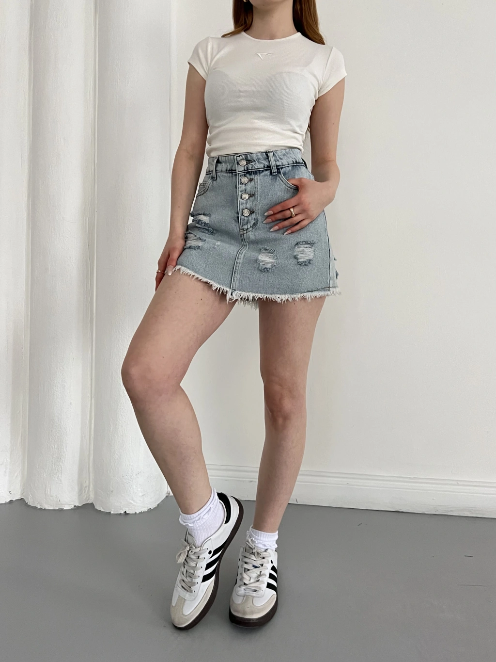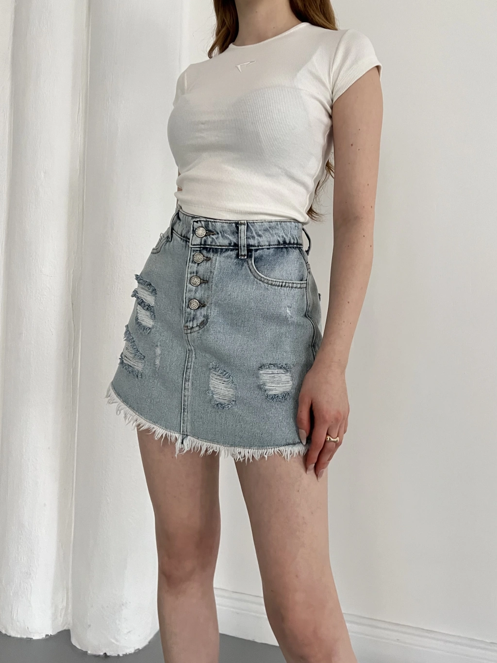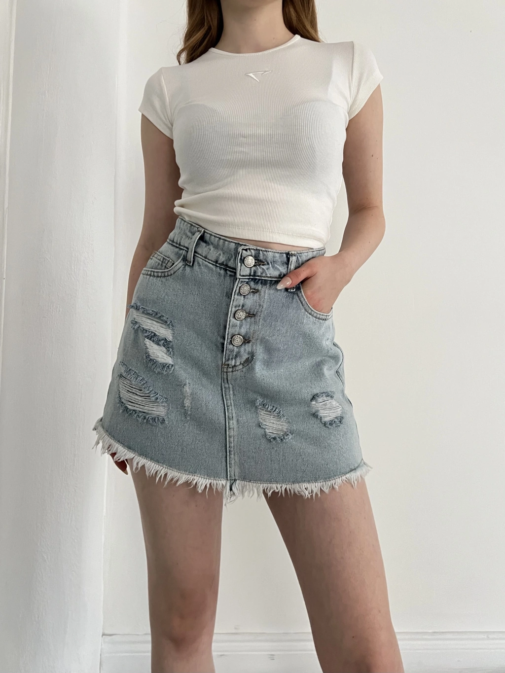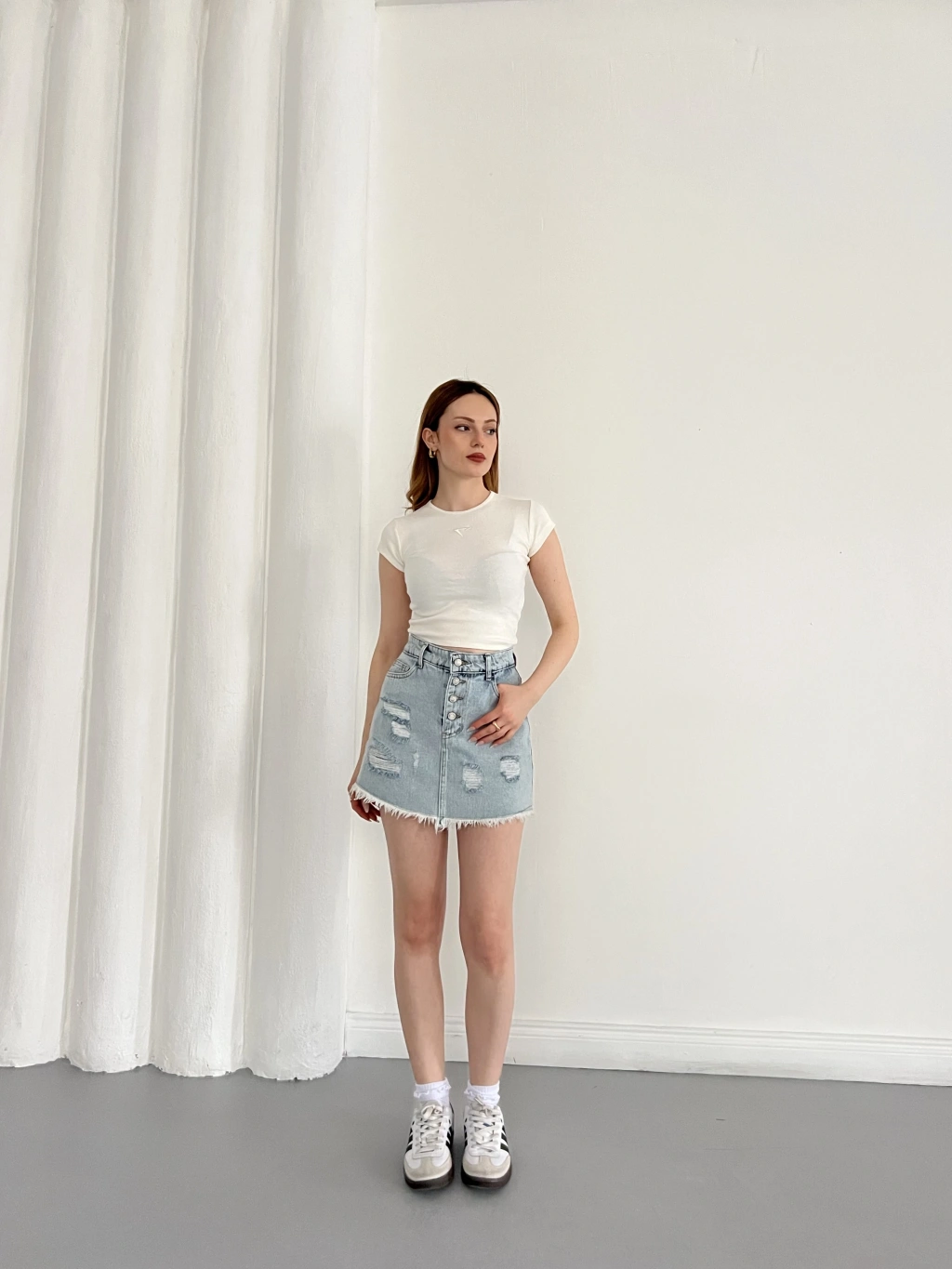 Yıkamalı Düğme Detaylı Denim Etek Mavi